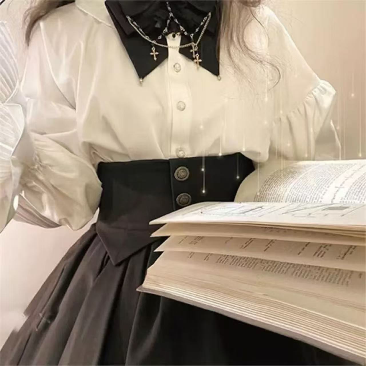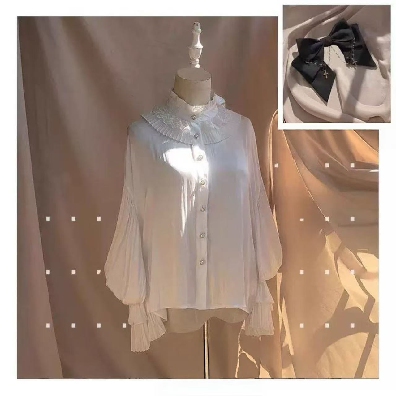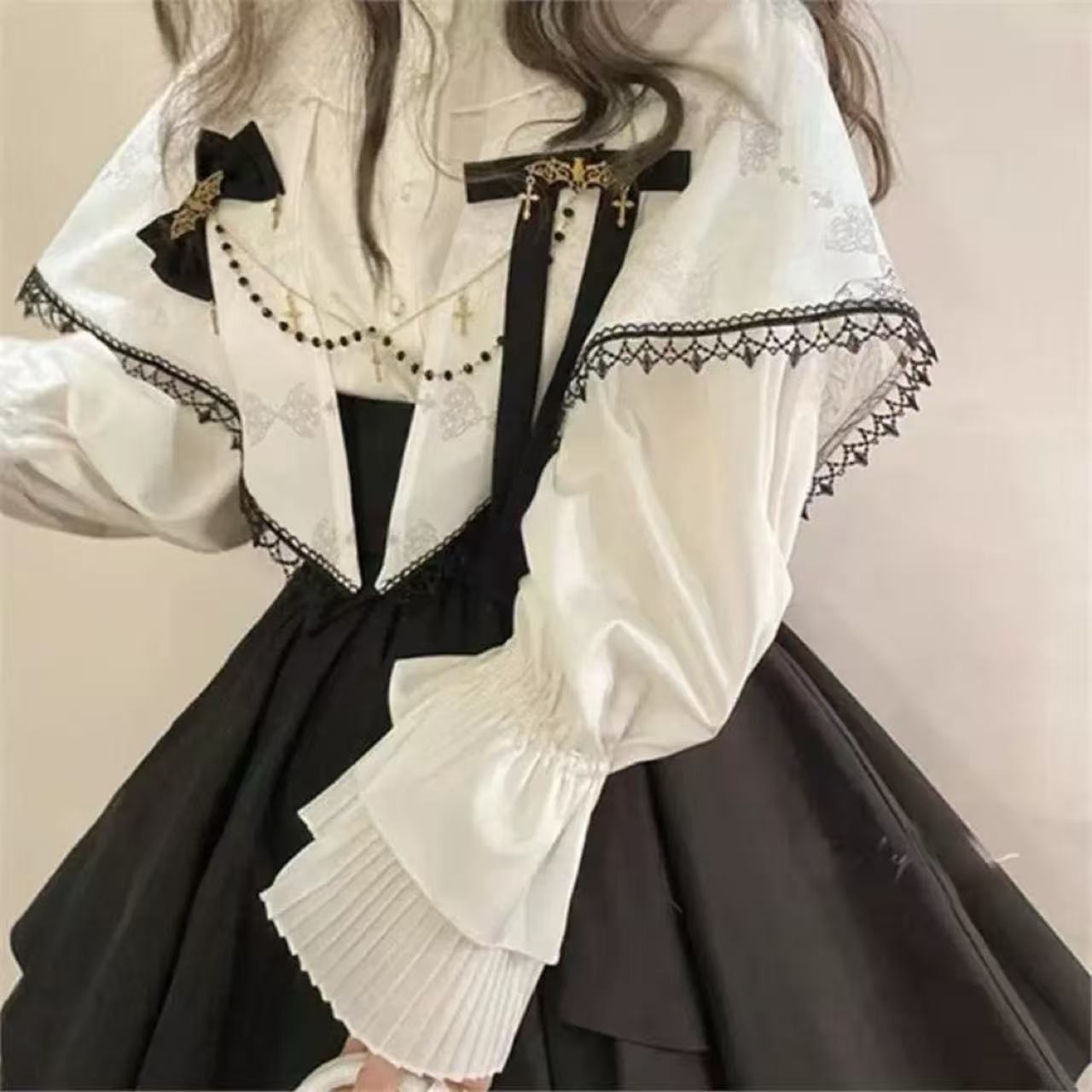 繊細なレース襟と十字架のチェーンが印象的な、クラシカルな雰囲気漂うブラウス。大きな黒リボンと細身のウエストベルトがシルエットに美しいメリハリを与えます。ふんわりと広がるスカートと組み合わせれば、優雅さの中に神秘的な魅力が宿るスタイルに。上品で存在感のあるゴシックロリータコーデを完成させる一着です。