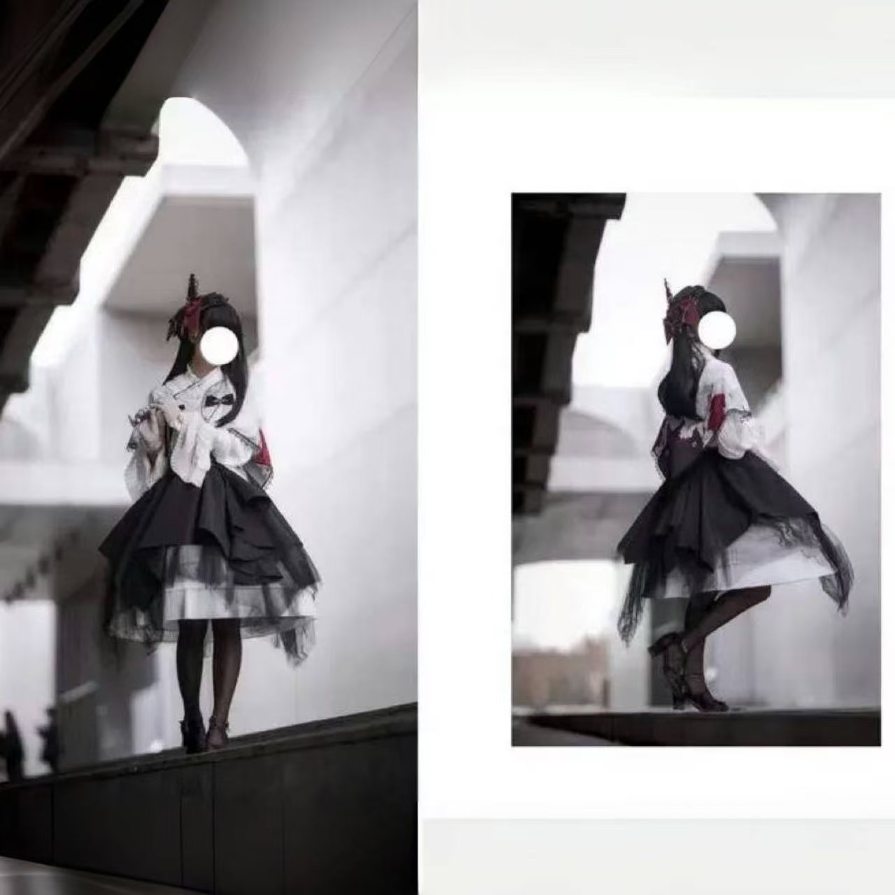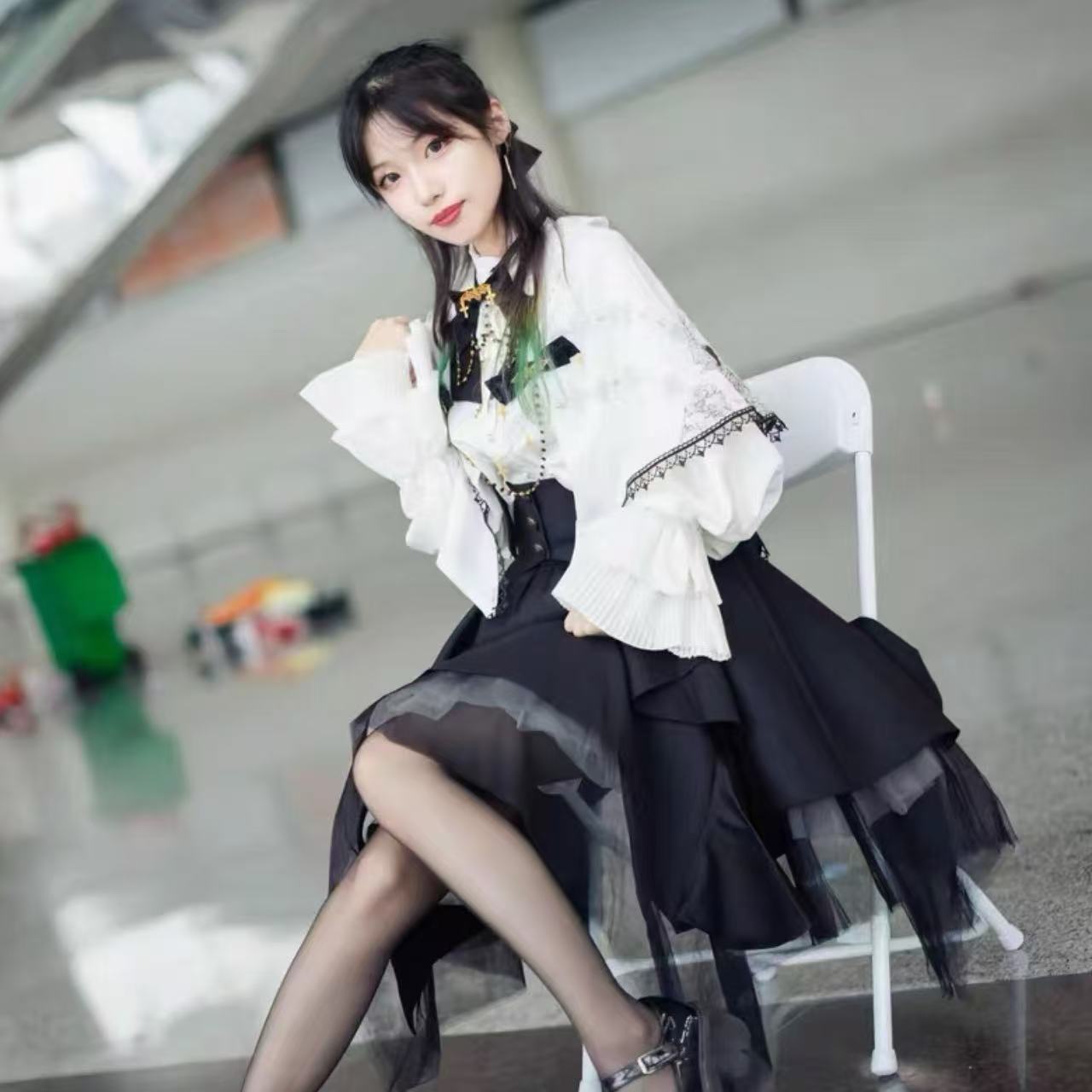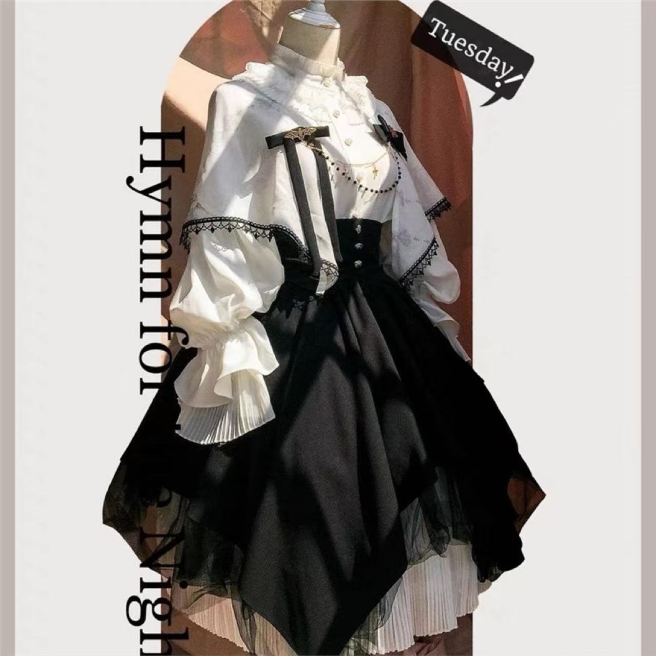繊細なレース襟と十字架のチェーンが印象的な、クラシカルな雰囲気漂うブラウス。大きな黒リボンと細身のウエストベルトがシルエットに美しいメリハリを与えます。ふんわりと広がるスカートと組み合わせれば、優雅さの中に神秘的な魅力が宿るスタイルに。上品で存在感のあるゴシックロリータコーデを完成させる一着です。