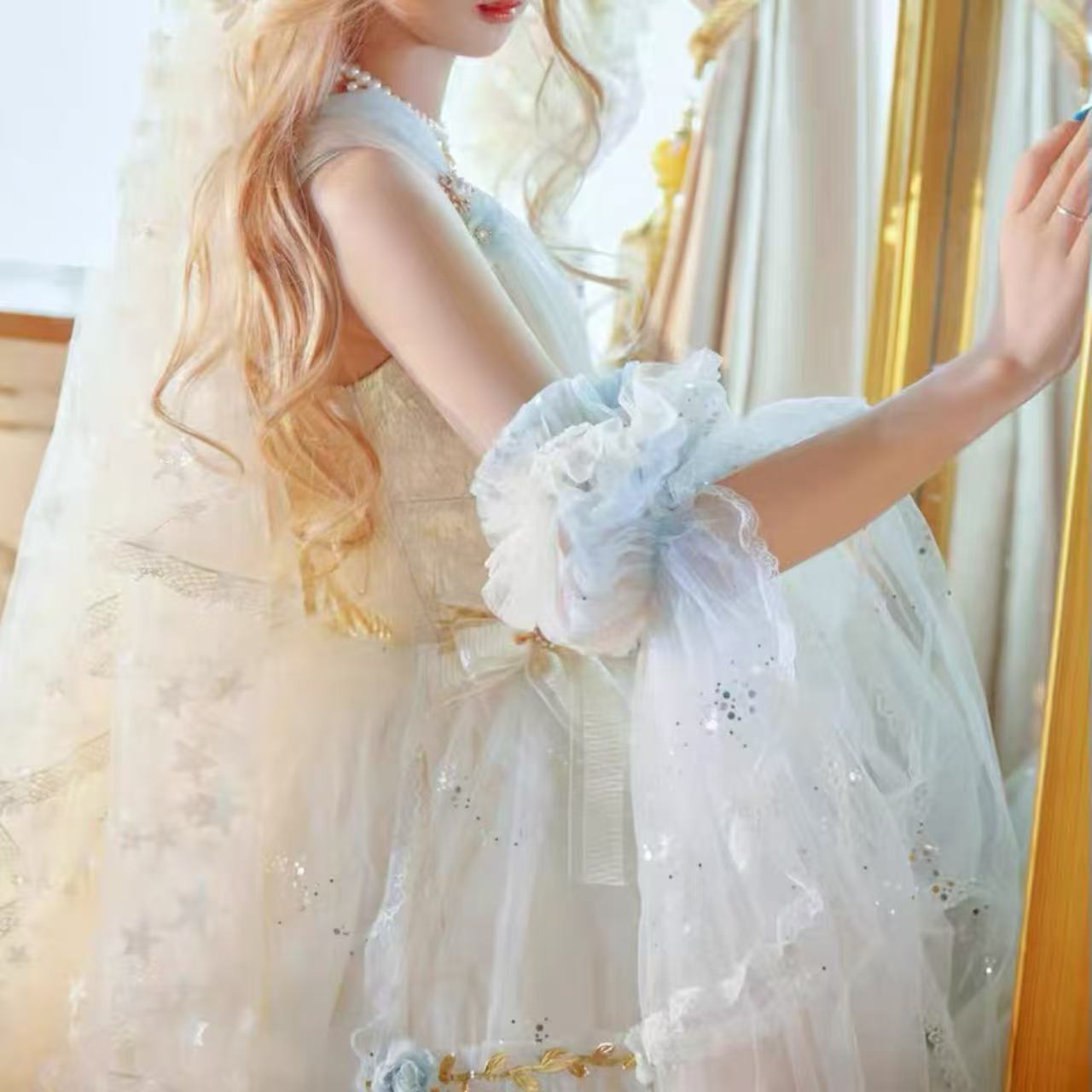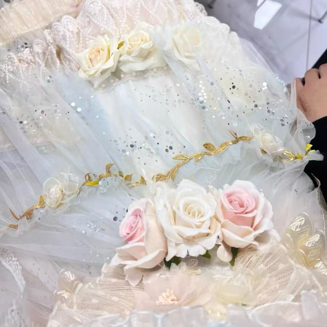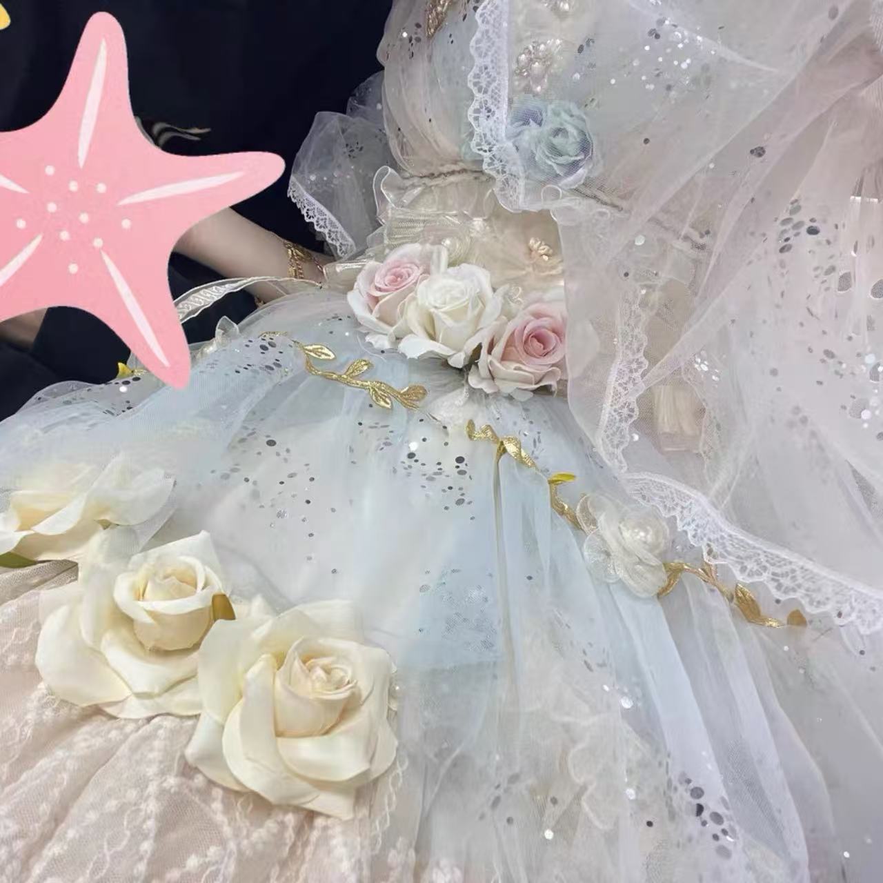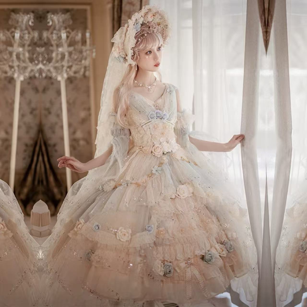花嫁のように美しいクラシカルロリータワンピース。豪華な姫ロリデザインで、撮影やお茶会、結婚式のお色直しにもぴったりです。ワイヤー入りパニエでふんわりと広がるシルエットが魅力。膝下丈でお出かけにも気軽に着用できます。