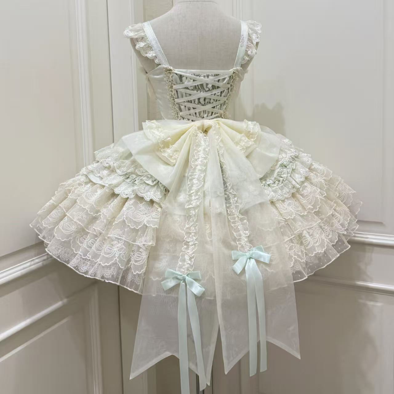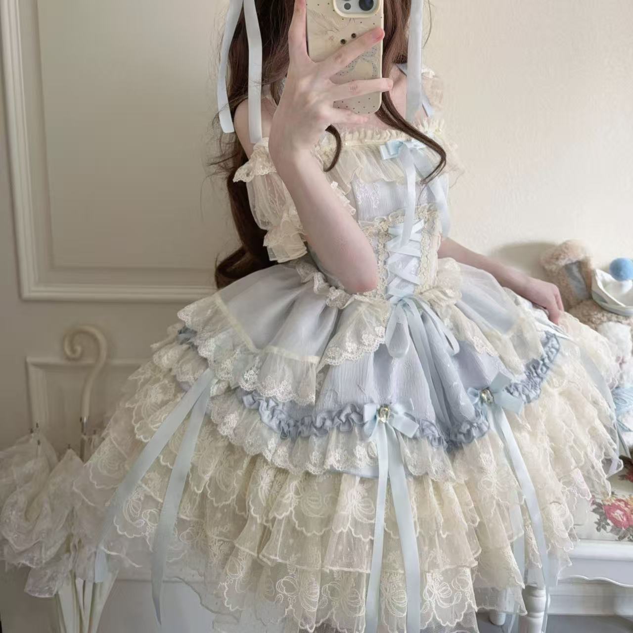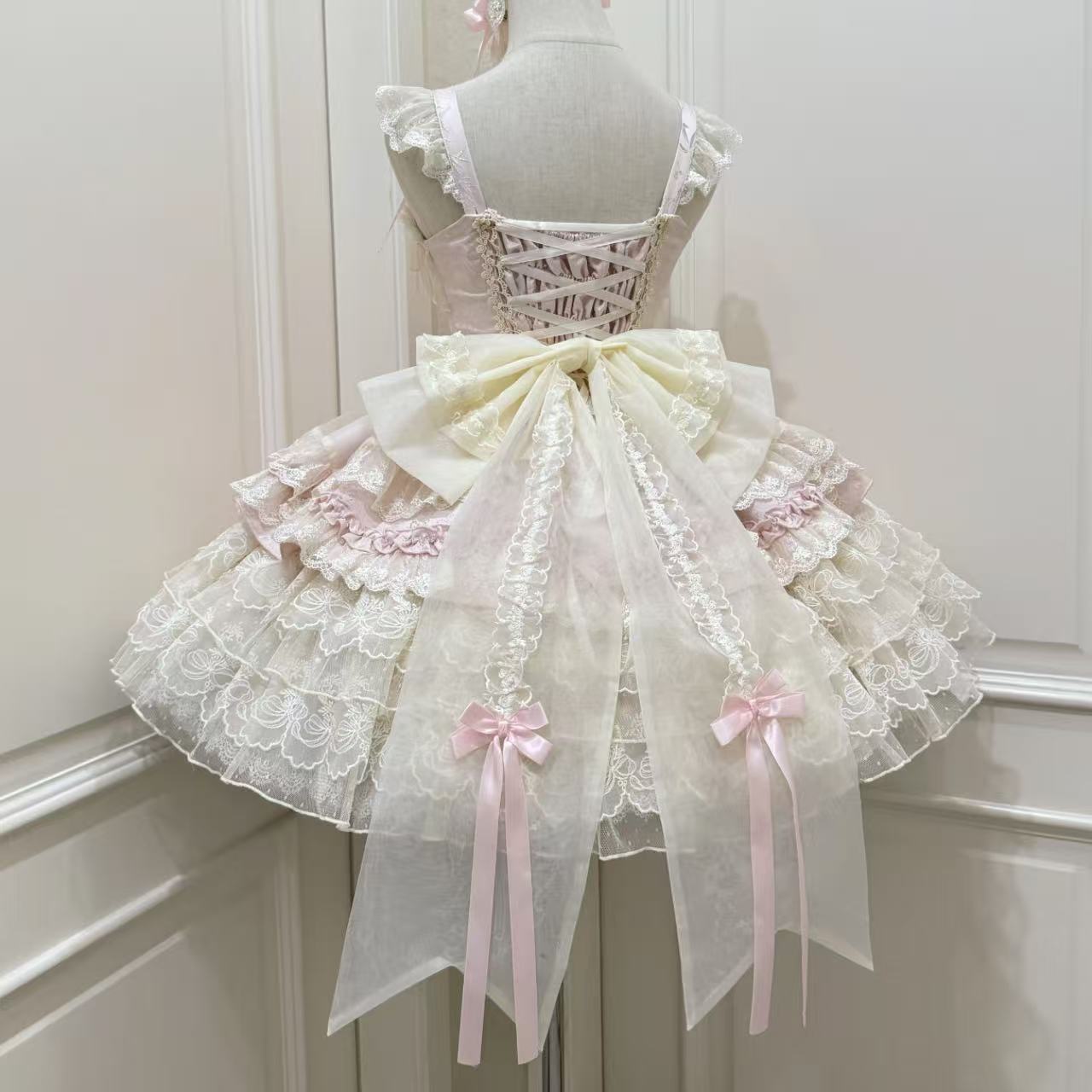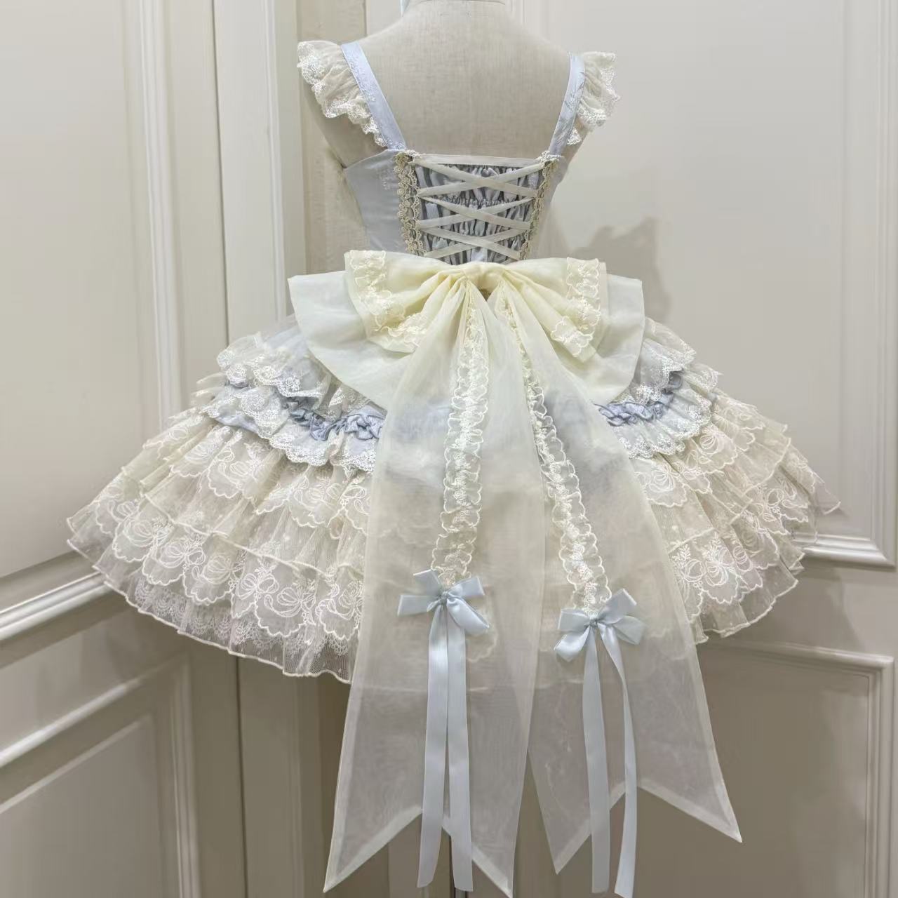リボンハートラブ×ホワイトシュガーガールのオリジナル【ロリータドレス】。軽やかなバレエスタイルのJSKサスペンダードレスで、夏にぴったりの爽やかデザイン。リボンとハートのモチーフが甘く可愛く、特別な日のおしゃれにもおすすめです。