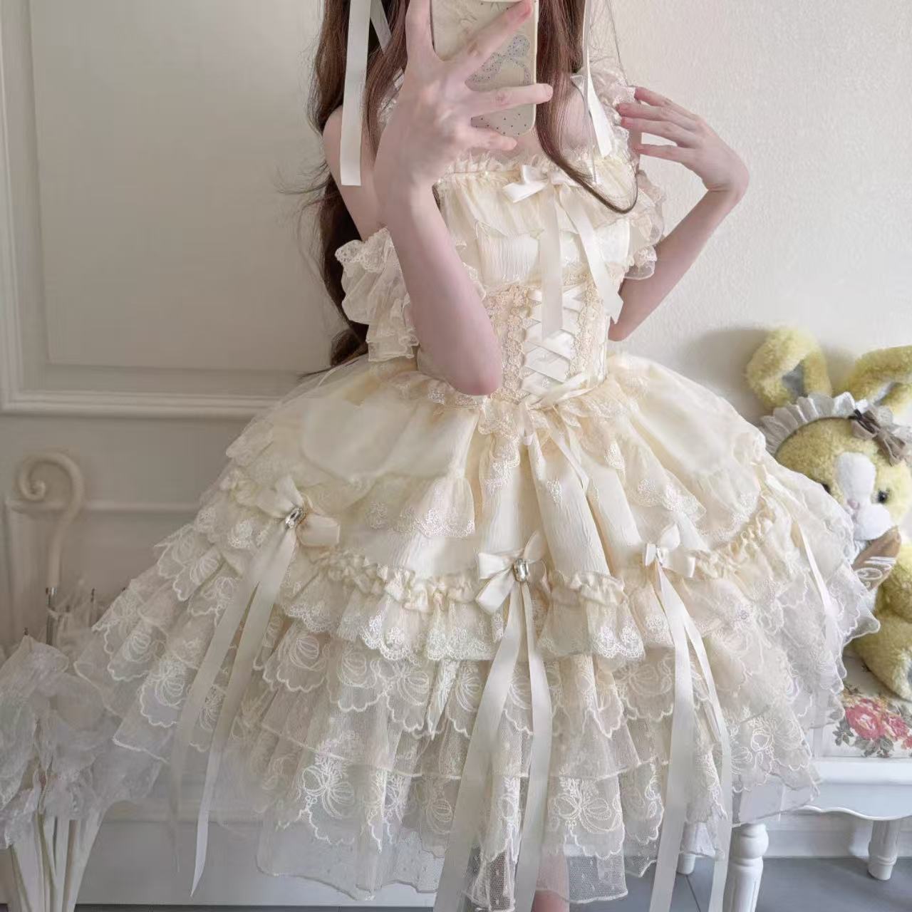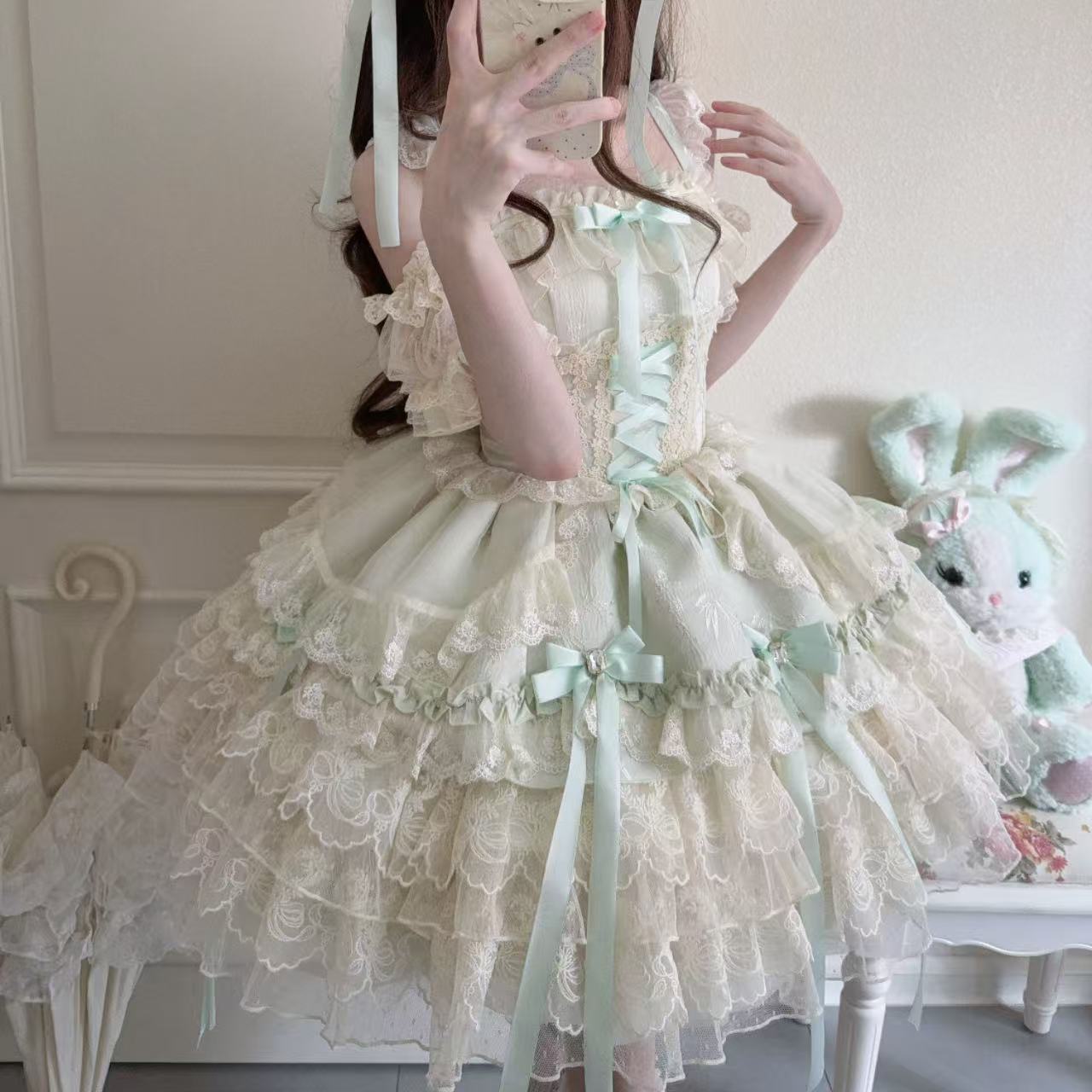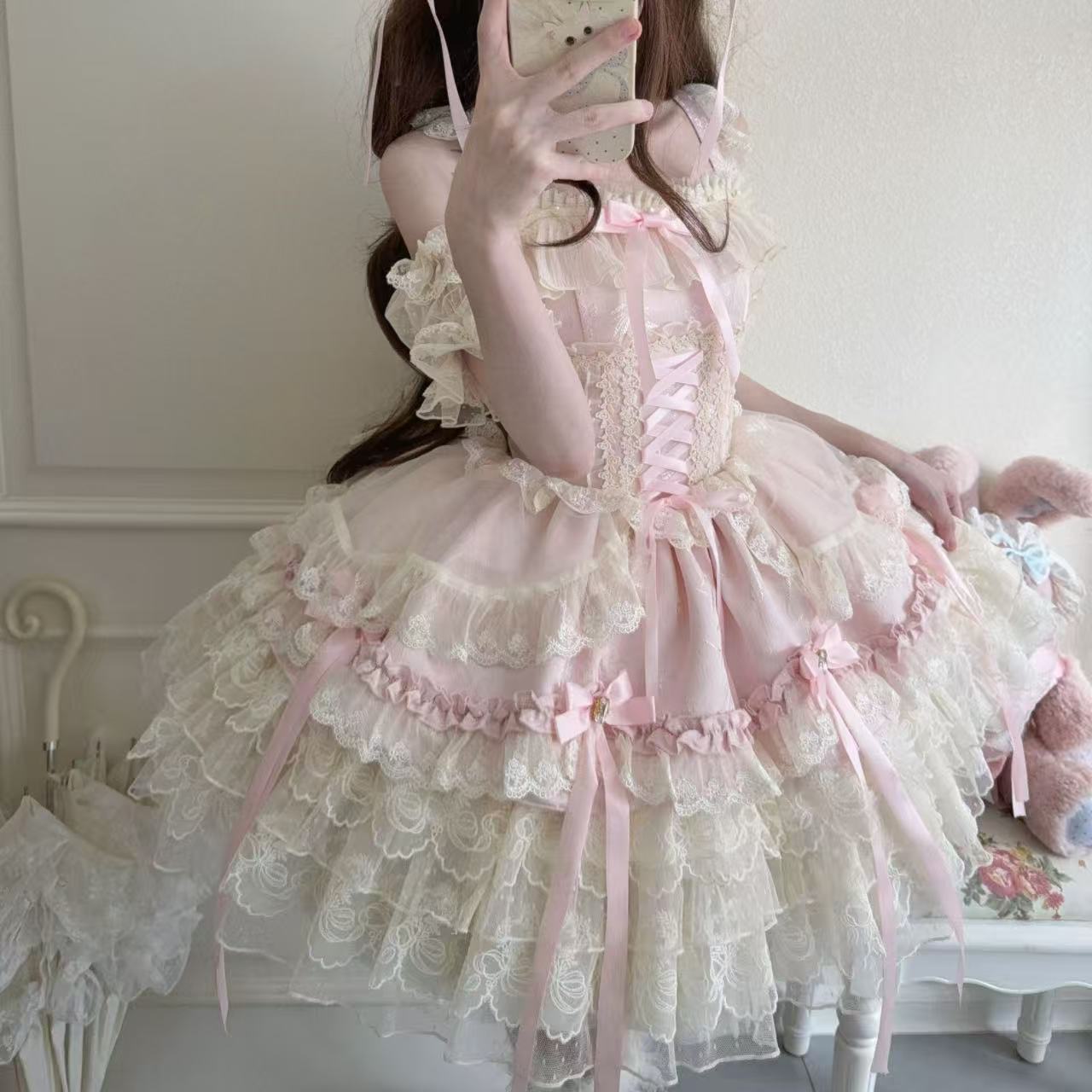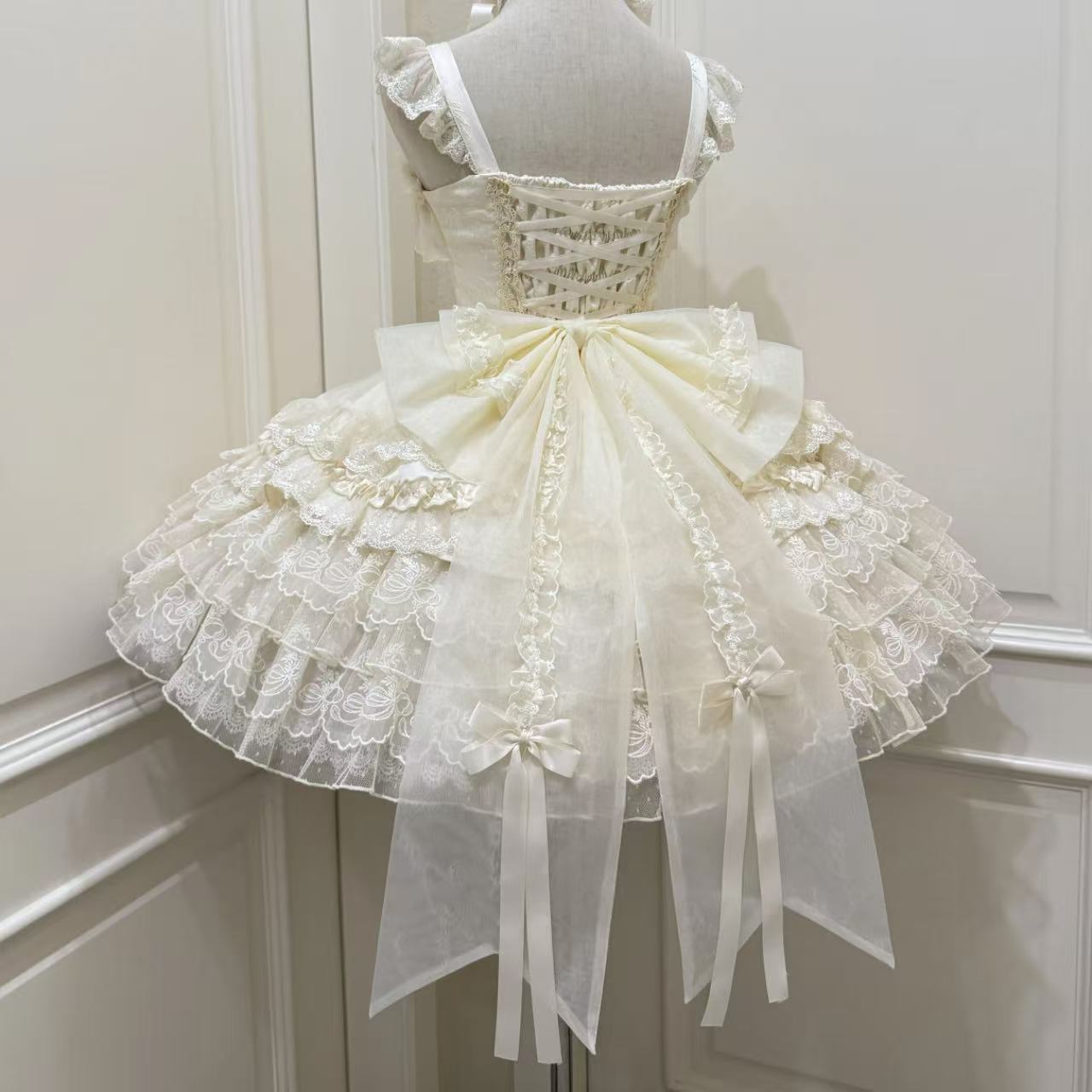 リボンハートラブ×ホワイトシュガーガールのオリジナル【ロリータドレス】。軽やかなバレエスタイルのJSKサスペンダードレスで、夏にぴったりの爽やかデザイン。リボンとハートのモチーフが甘く可愛く、特別な日のおしゃれにもおすすめです。