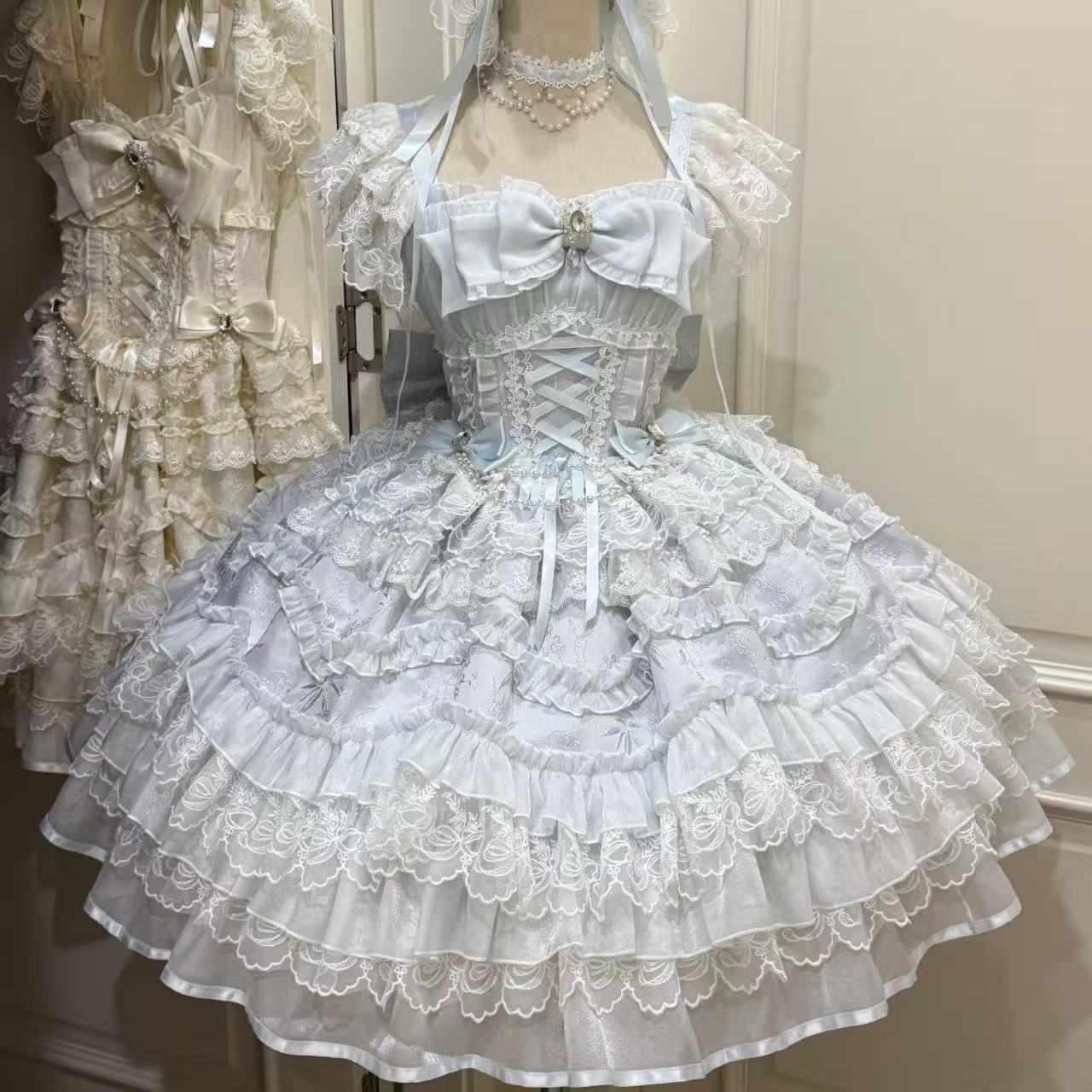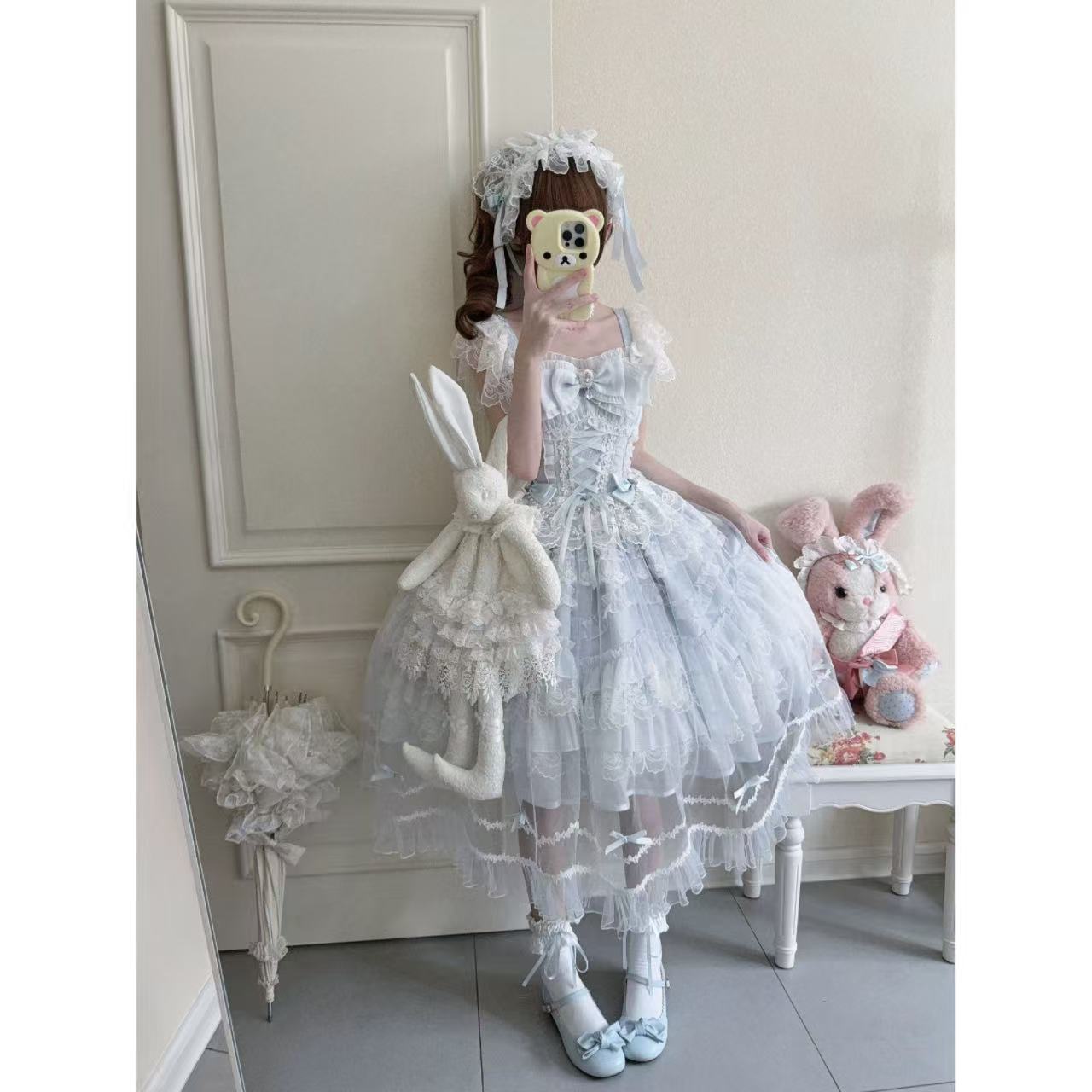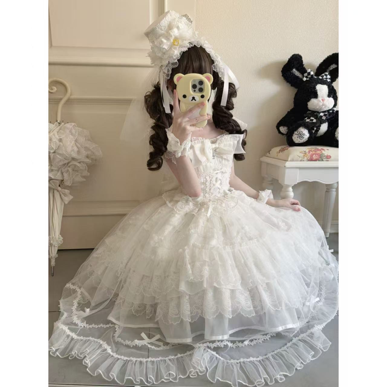 「永遠の誓い」ホワイトシュガーガールのオリジナルデザイン【ロリータドレス】。柔らかな色合いと繊細なレースが特徴のJSKサスペンダースカートです。清楚で優雅な雰囲気を演出し、誕生日や特別な日のコーデにぴったりな一着です。