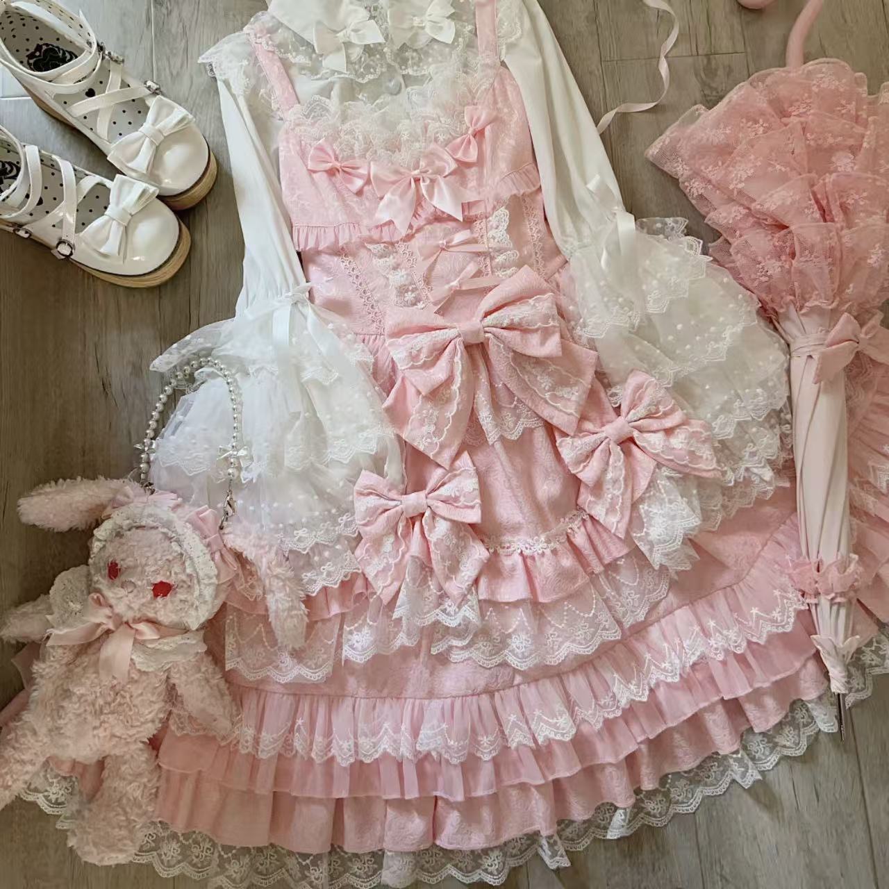 【ホワイトシュガーガール】オリジナルデザインの【ロリータドレス】。甘く愛らしいドールセンス漂うJSKサスペンダードレスです。繊細なレースとふんわりシルエットが魅力で、可憐な雰囲気を演出。特別な日のお出かけや撮影にもおすすめです。