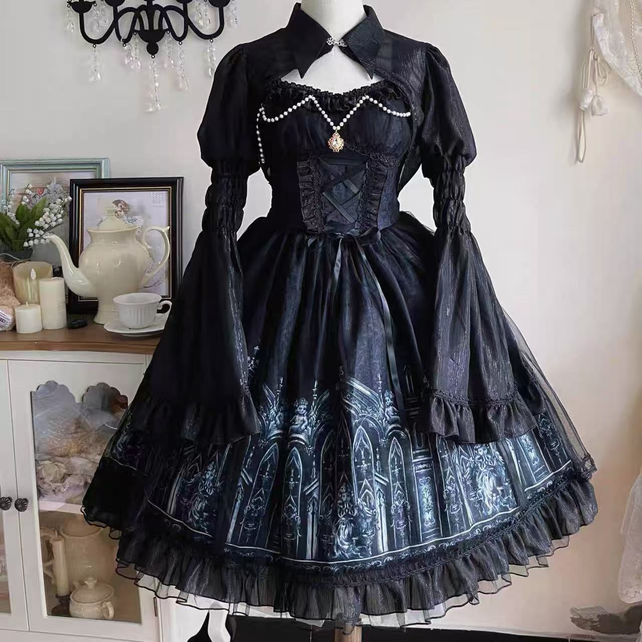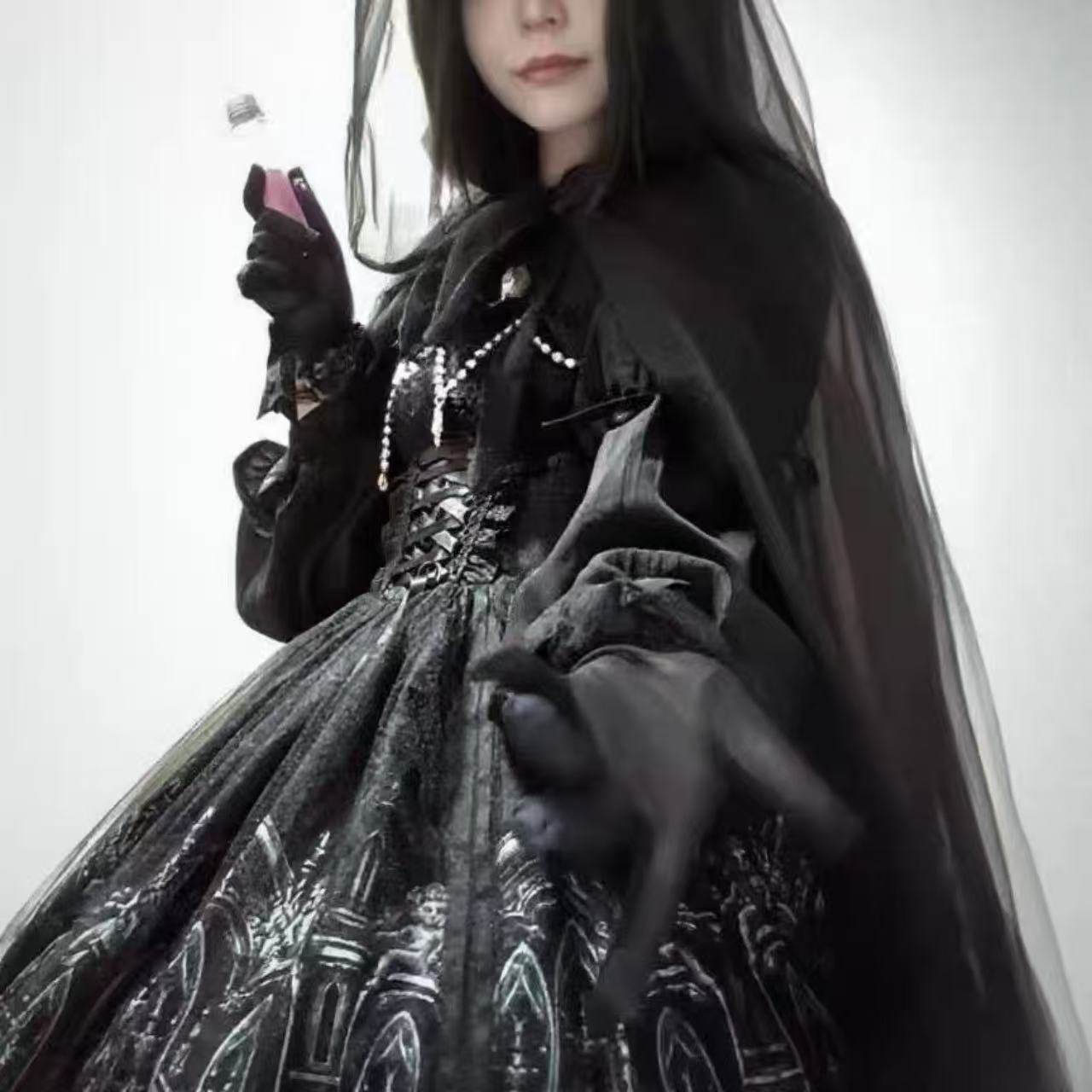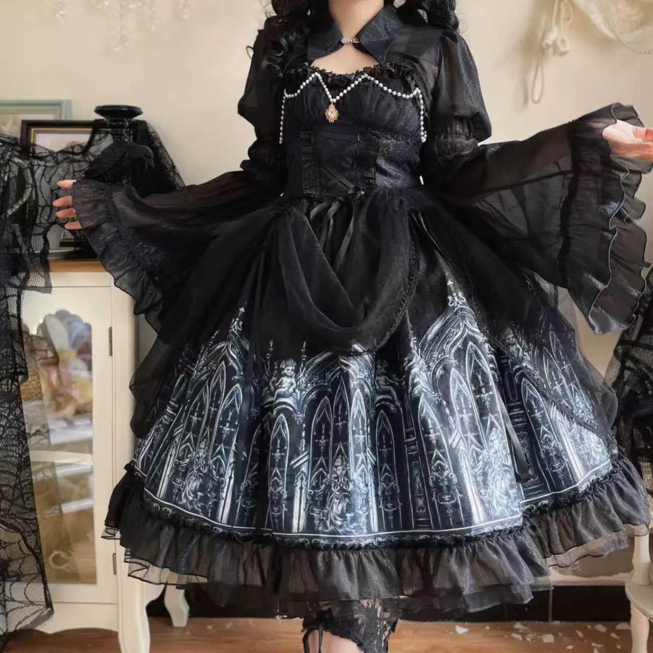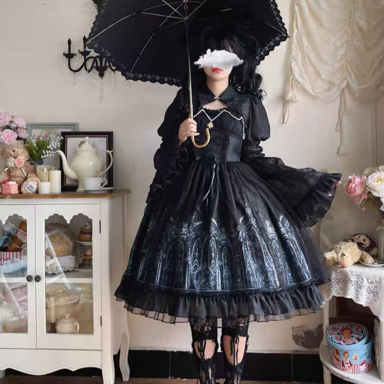 【ダークゴシック】サイレントナイトチャーチのオリジナルデザインJSKドレス。ホワイトシュガーガールによる夏の新作で、神秘的な雰囲気と優雅なシルエットが魅力。レースとリボンが織りなすダークな美しさで、上品かつ幻想的なロリータスタイルを演出します。