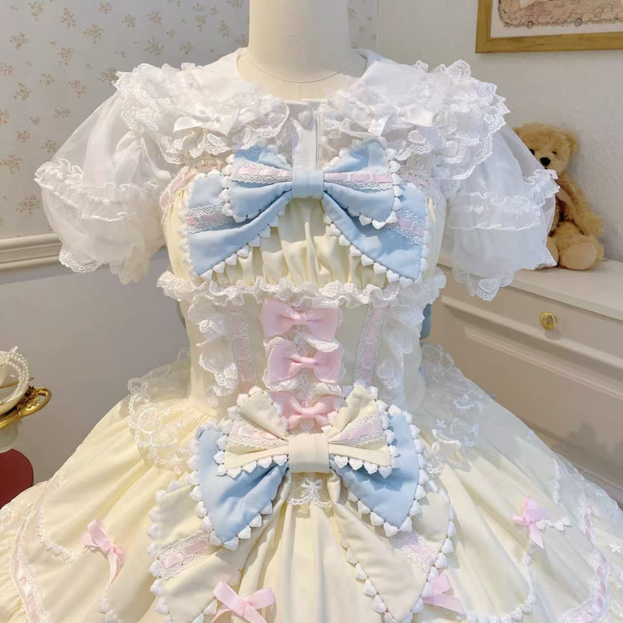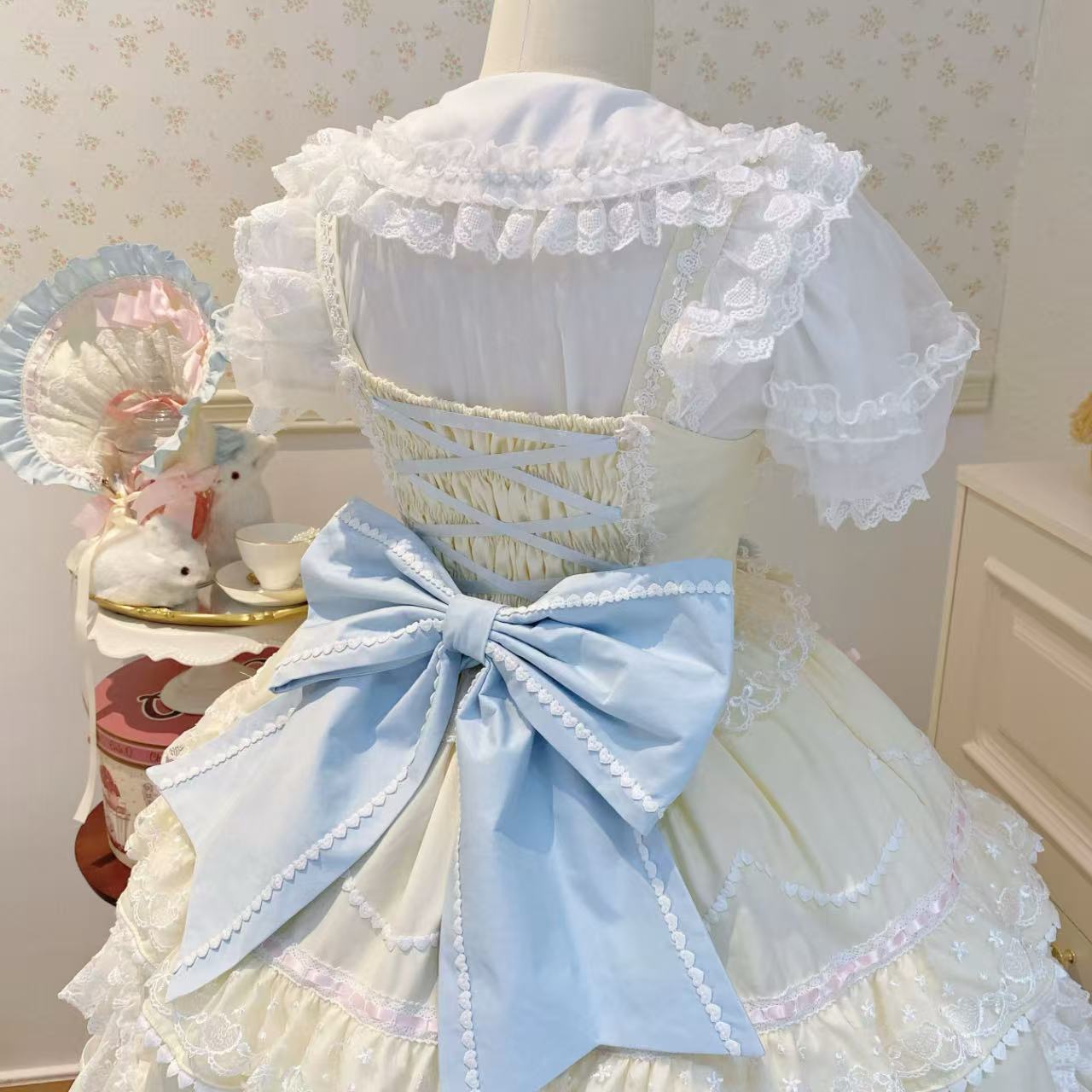 【ロリータドレス】ホワイトシュガーガールのオリジナルデザインによる日本のソフトガール風半袖トップス。夏にぴったりの軽やかな素材で、甘く優しい雰囲気を演出します。繊細なレースやリボンが乙女らしさを引き立て、カジュアルにもガーリーにも着こなせる一枚です。