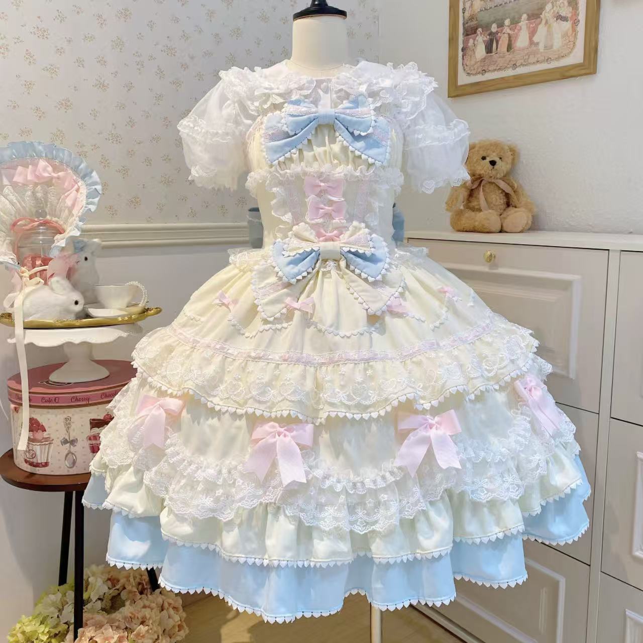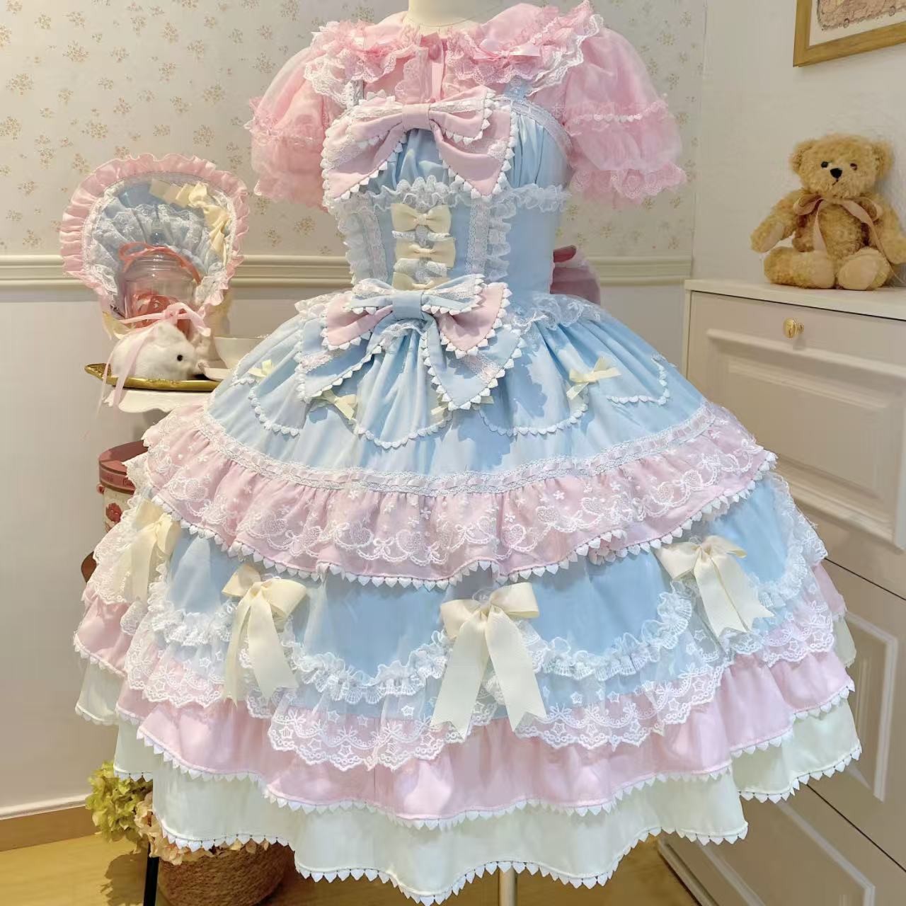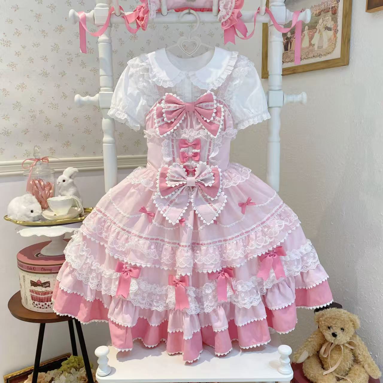 ホワイトシュガーガールのオリジナルデザインによるスイートロリータJSKサスペンダードレス。夏にぴったりの軽やかな素材で、可憐なリボンやレースがガーリーな雰囲気を演出します。清楚で甘いデザインが魅力の一着で、お出かけや撮影にもおすすめです。