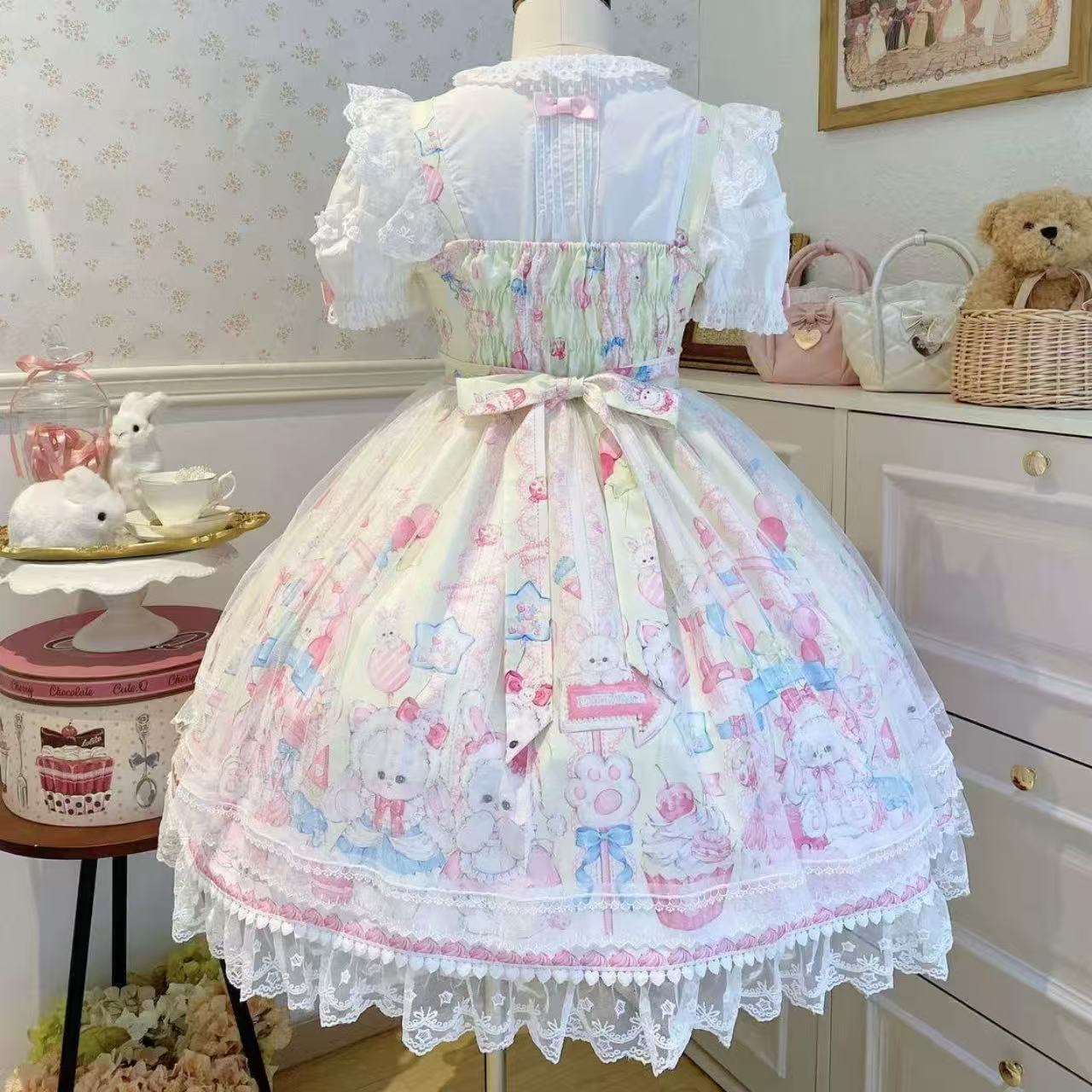 【ロリータドレス】ホワイトシュガーガールのオリジナル夏用JSKサスペンダードレスです。かわいいウサギと甘いケーキをモチーフにしたデザインで、ガーリーで夢のような雰囲気を演出します。軽やかな素材で涼しく着られ、夏のお出かけや撮影にもぴったりの一着です。