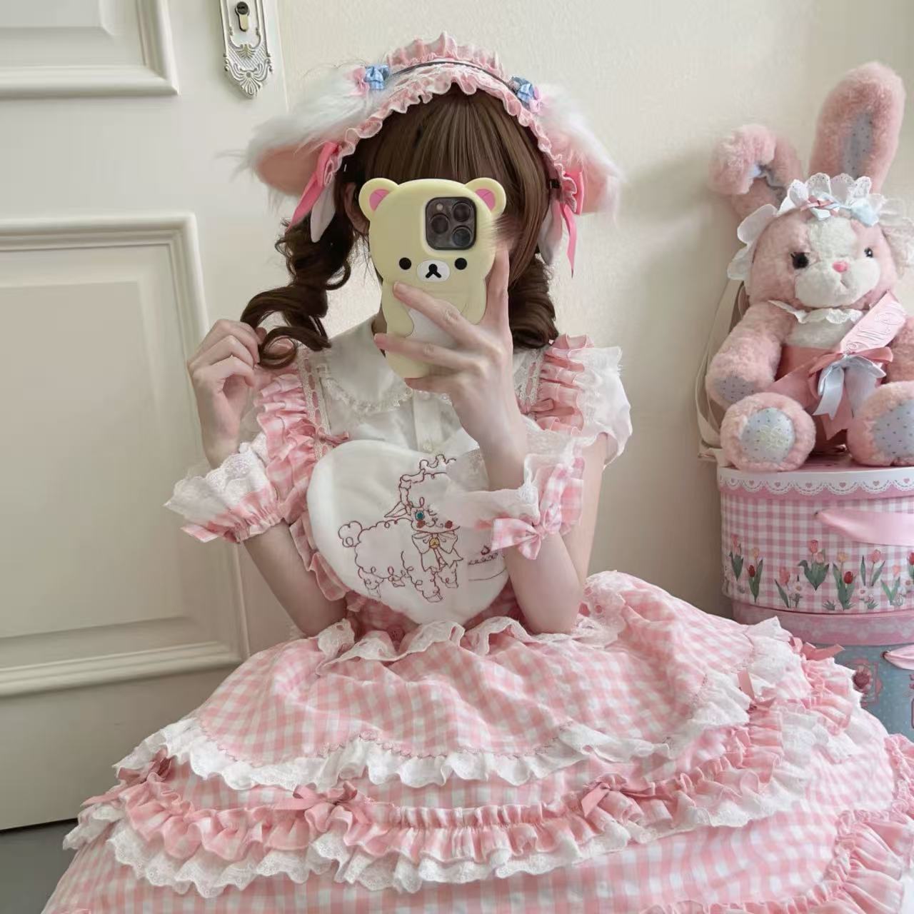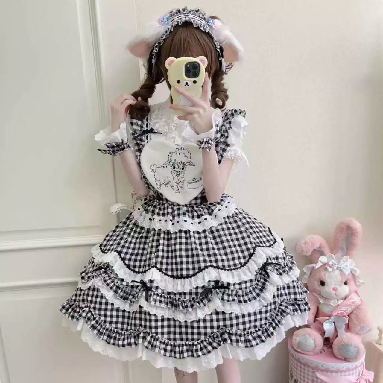 【ロリータドレス】ホワイトシュガーガールの新作オリジナルデザイン「リトルラムケーキ」JSKサスペンダードレス。ふんわりとしたケーキのような甘さと、子羊モチーフのやさしい雰囲気が魅力の一着です。繊細なレースと柔らかなシルエットが可憐な印象を与え、ロリータコーデや撮影にもぴったりなドレスです。
