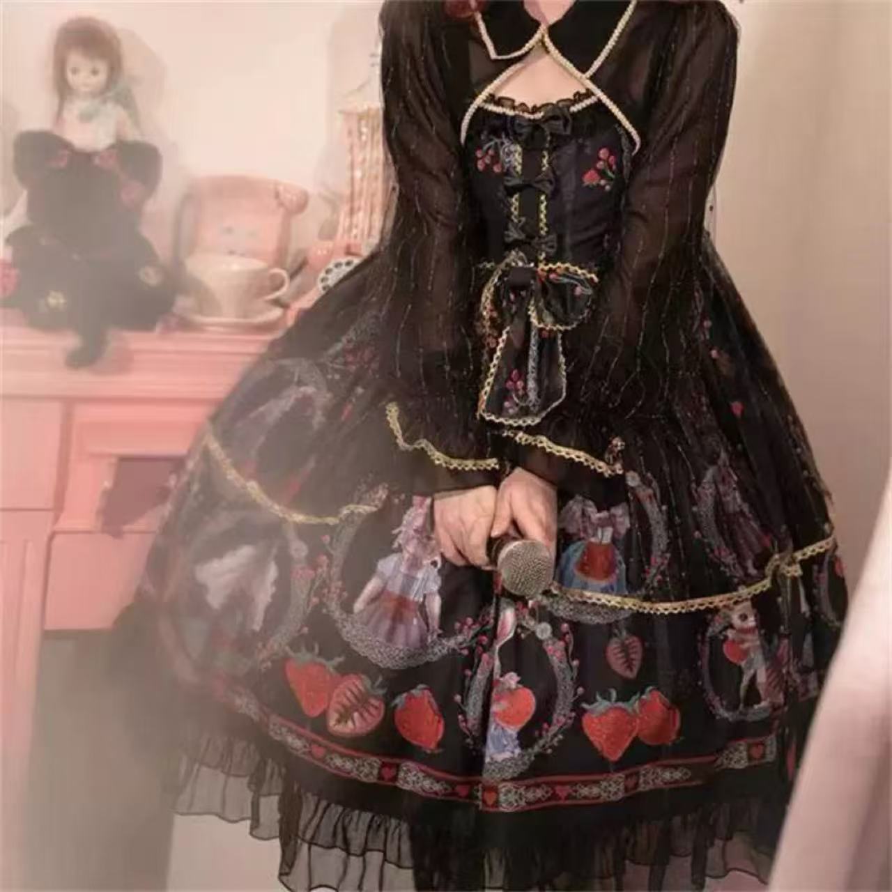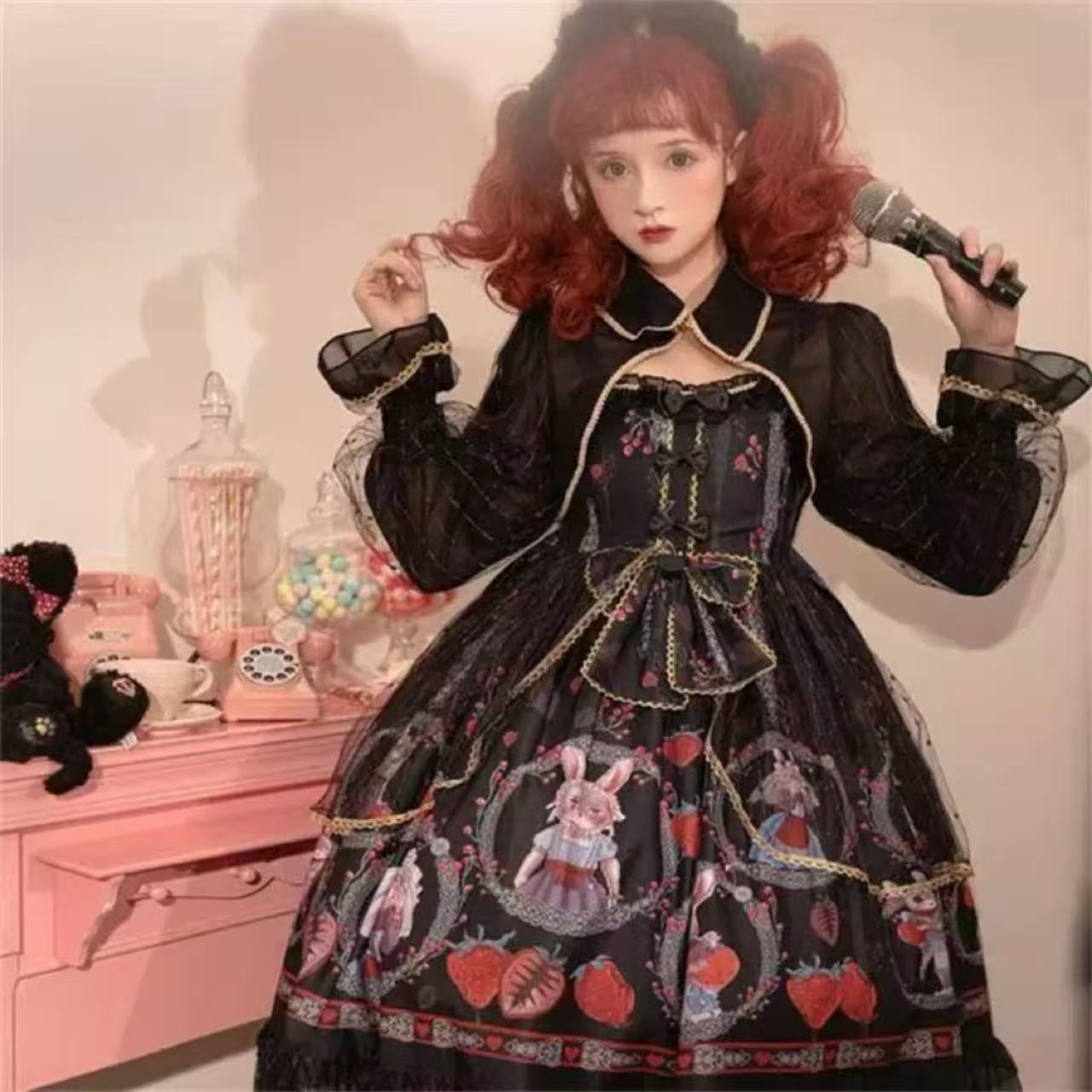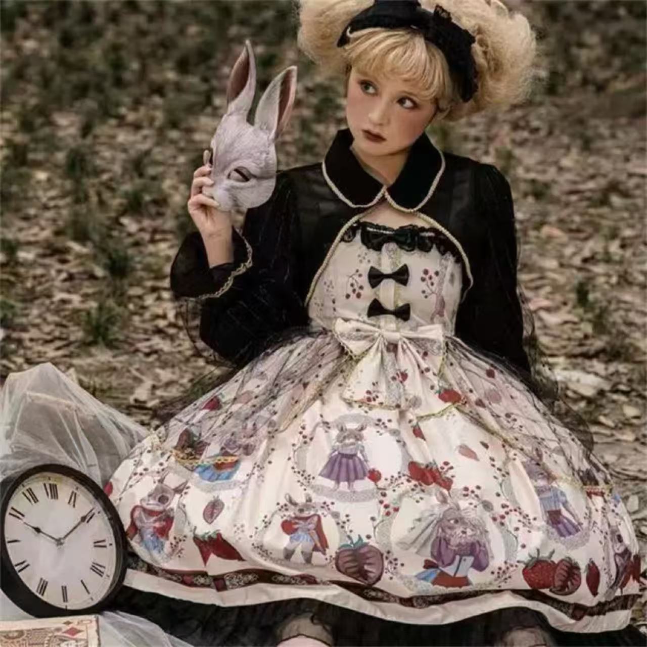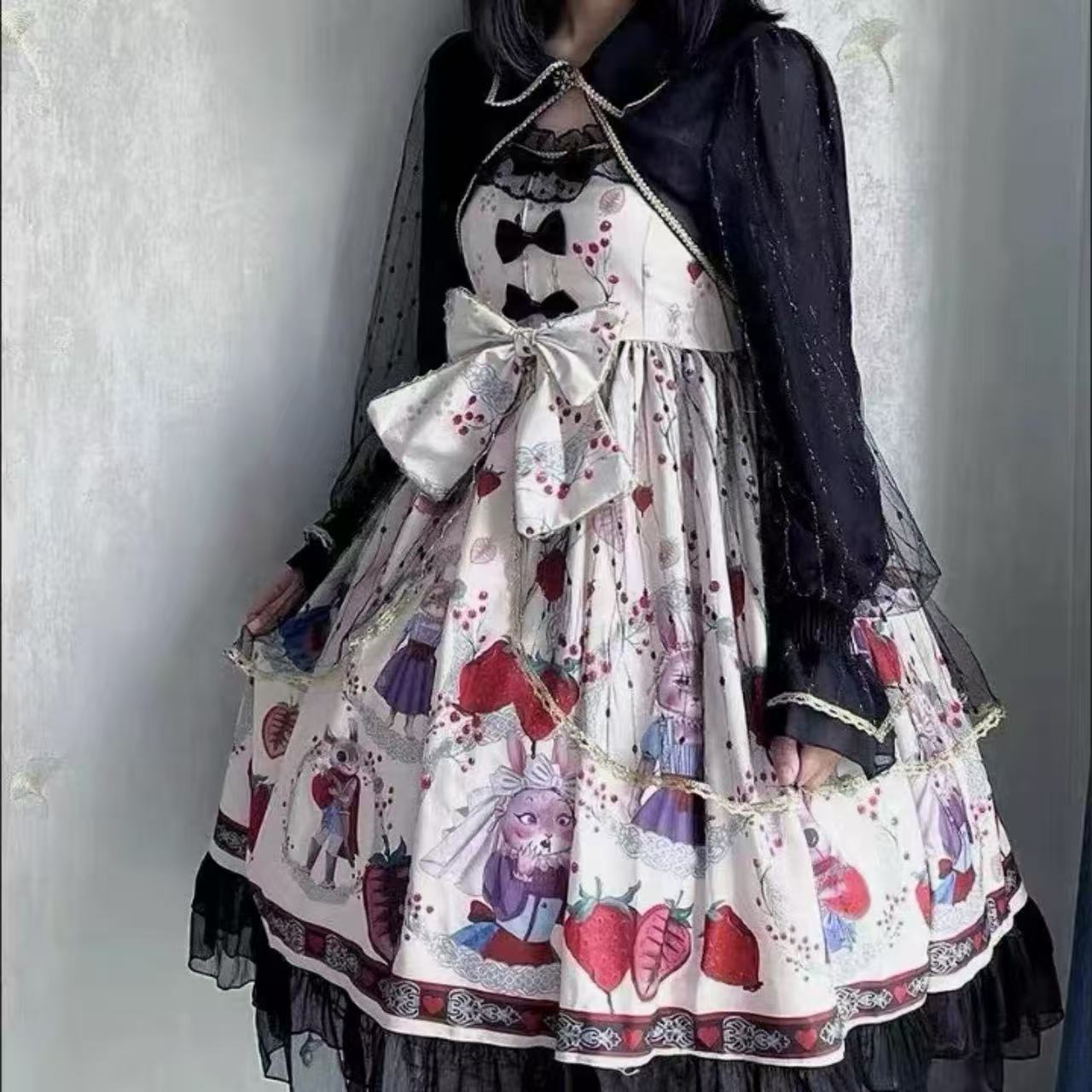 いちごとうさぎをモチーフにした、とびきりキュートな甘ロリータドレス。可愛らしさの中にほんのりとミステリアスな雰囲気を感じさせるデザインで、夢見るような世界観を演出します。繊細なディテールと愛らしいモチーフが調和し、身にまとうだけで物語の主人公になったような気分に。甘くて不思議な魅力が詰まった特別な一着です。