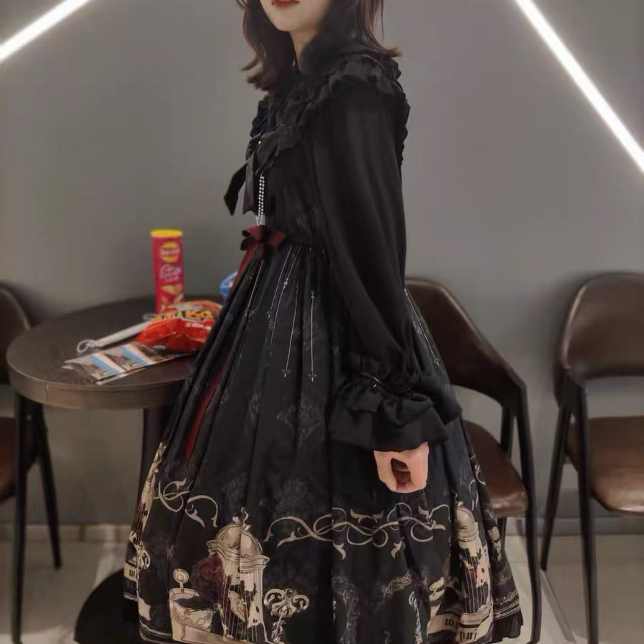 神秘的な雰囲気を纏う総柄のジャンパースカート。 裾にあしらわれたフリルと胸元のリボンが上品なアクセントとなり、全体に優雅な印象を与えます。 長袖ブラウスと合わせれば、クラシカルでありながらダークな魅力を演出。 薔薇のモチーフが儚くも美しい世界観を表現した、幻想的な一着です。
