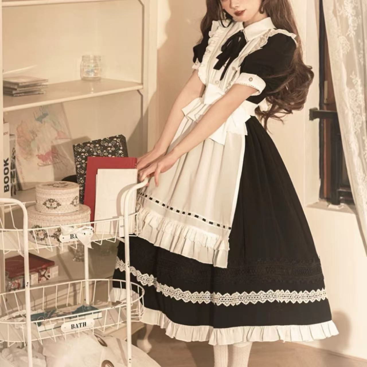 優雅な長め丈が魅力の、メイド風クラシカルロリータワンピースです。袖口やスカート、エプロンにまで贅沢にあしらわれたフリルとレースが、どの角度から見ても可憐な印象を演出します。肩まわりのふんわりとしたパフスリーブと、手首をきゅっと引き締めるデザインが手元を美しく見せ、上品なシルエットを実現。ワンピース・エプロン・ヘッドドレスの豪華3点セットで、ロリータ初心者の方でも手軽にクラシカルな世界観を楽しめる一着です。