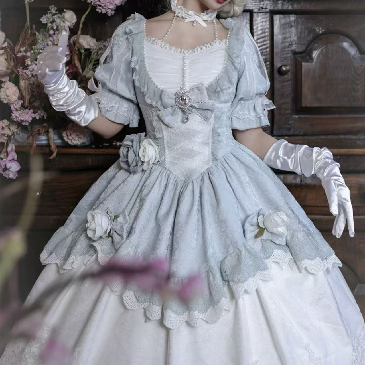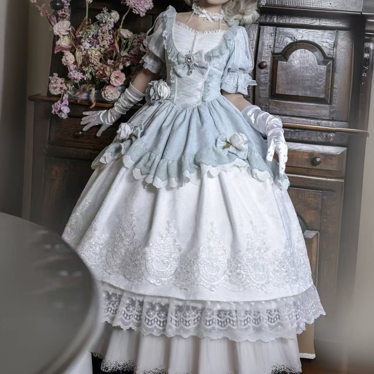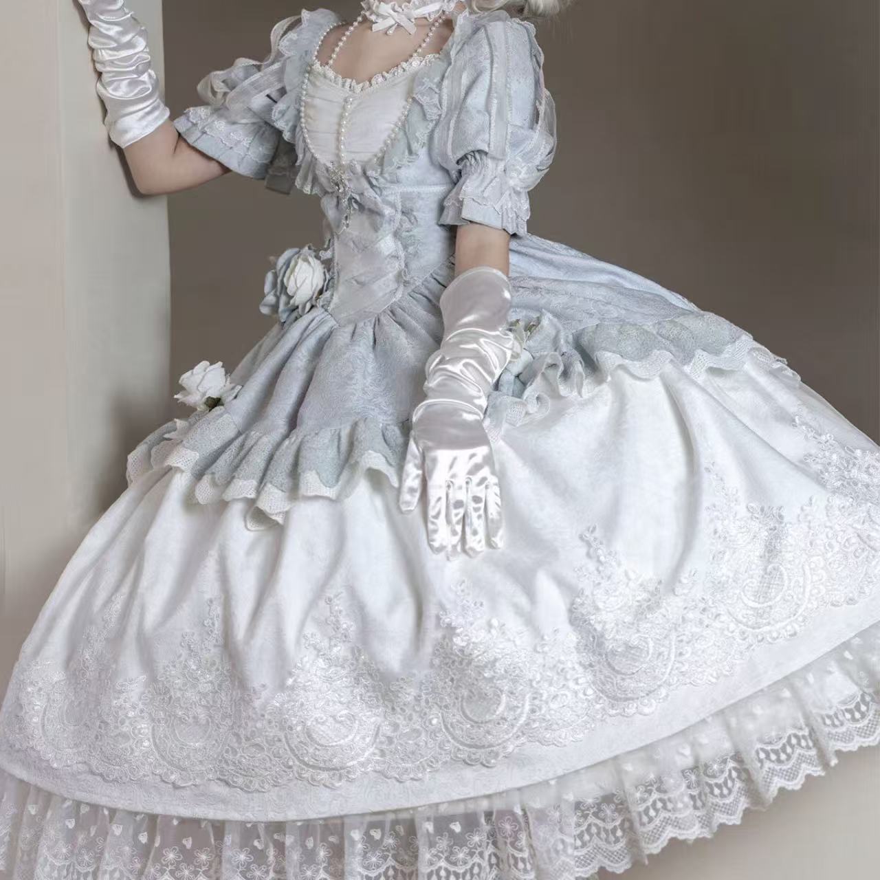淡くくすんだライトブルーが上品に映える、半袖のクラシカルロリータドレス。なんと13種類ものレースを贅沢に使用し、繊細で高貴な印象を演出します。ライトブルーとホワイトの優しいコントラストが可憐さを引き立て、白い花の装飾が美しいアクセントに。身にまとうだけで気品あふれるオーラを放ち、まるでおとぎ話の中のプリンセスのような優雅さを感じさせる特別な一着です。