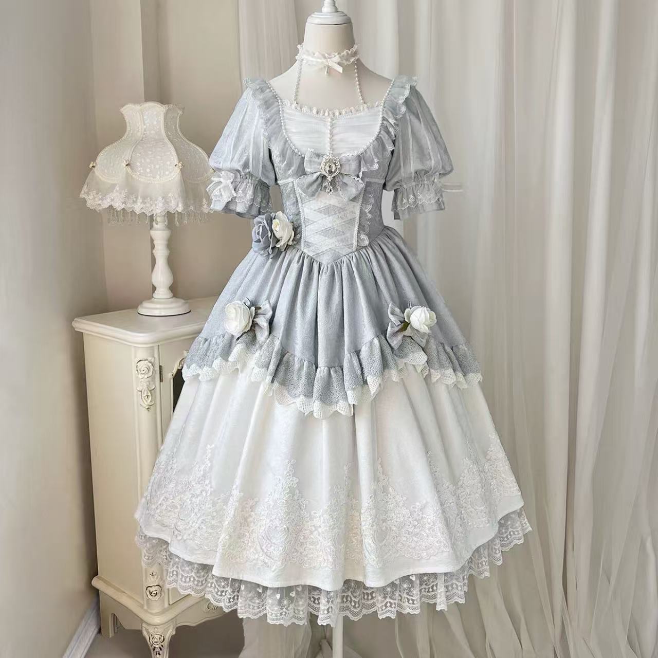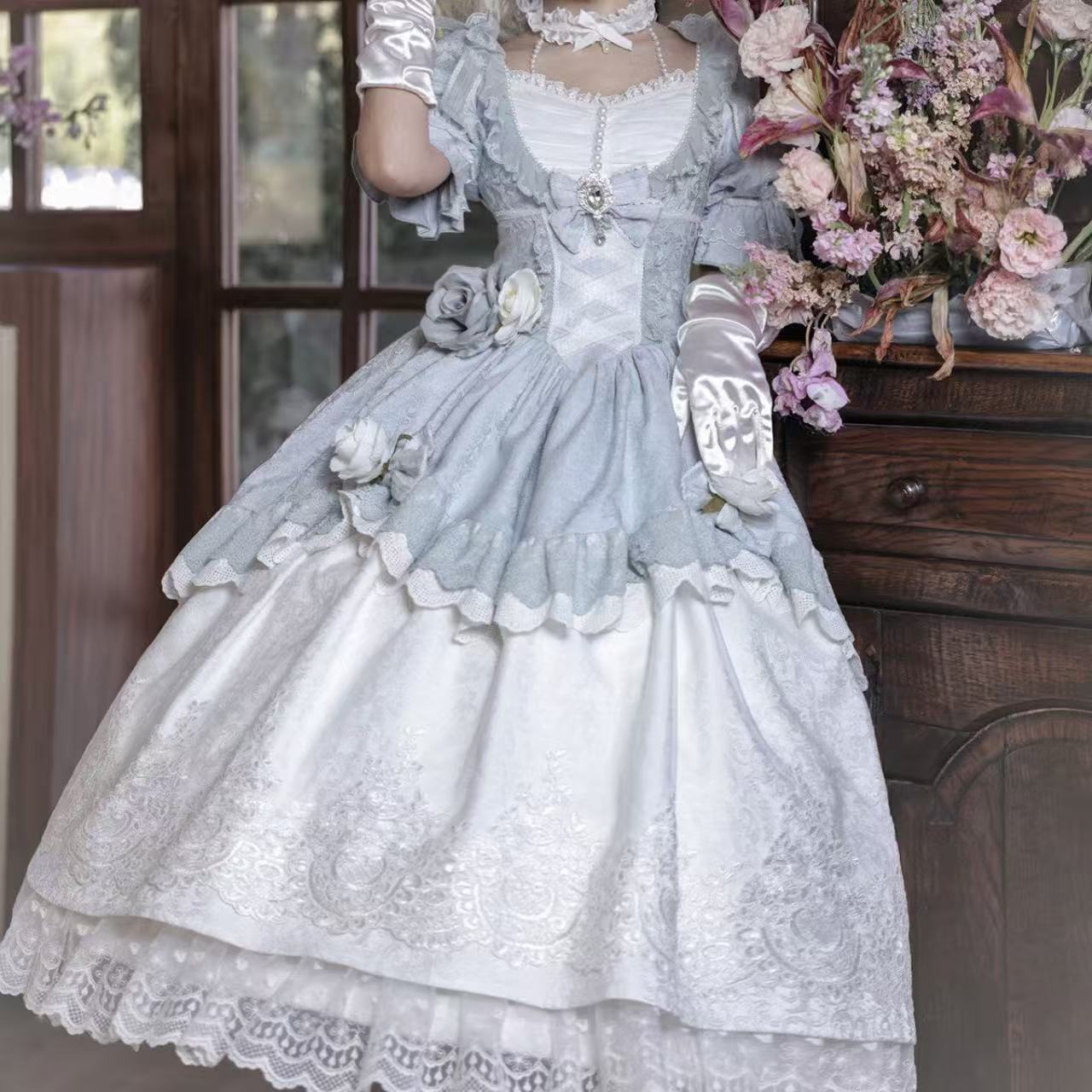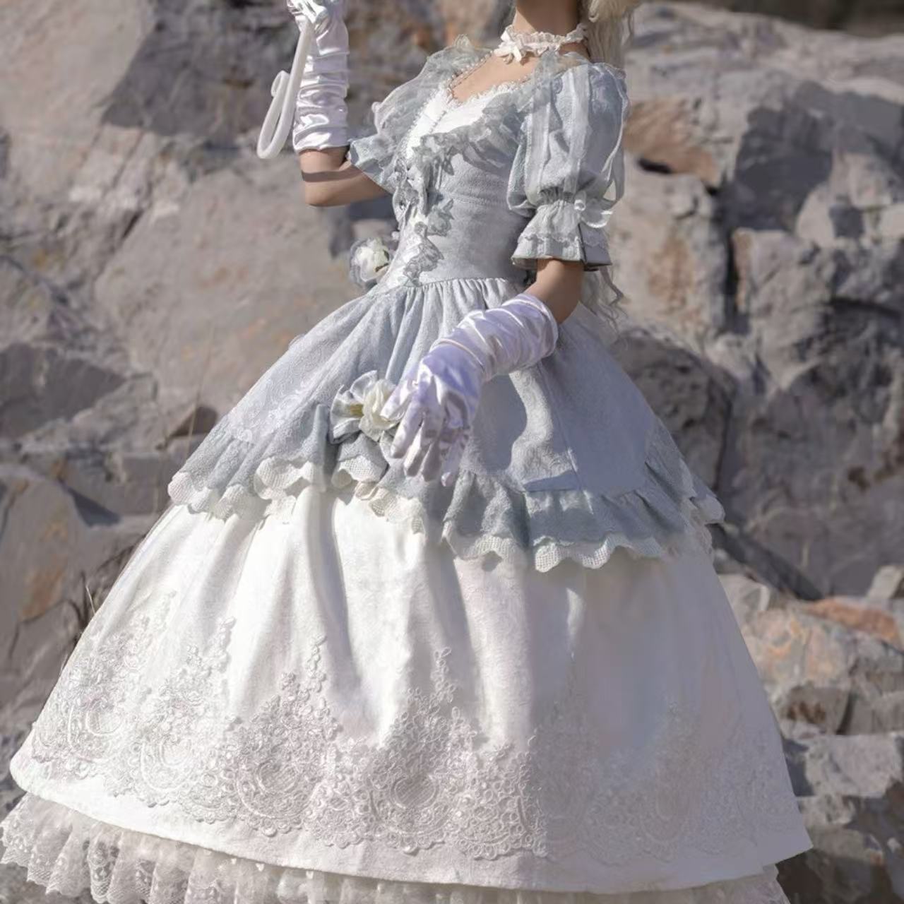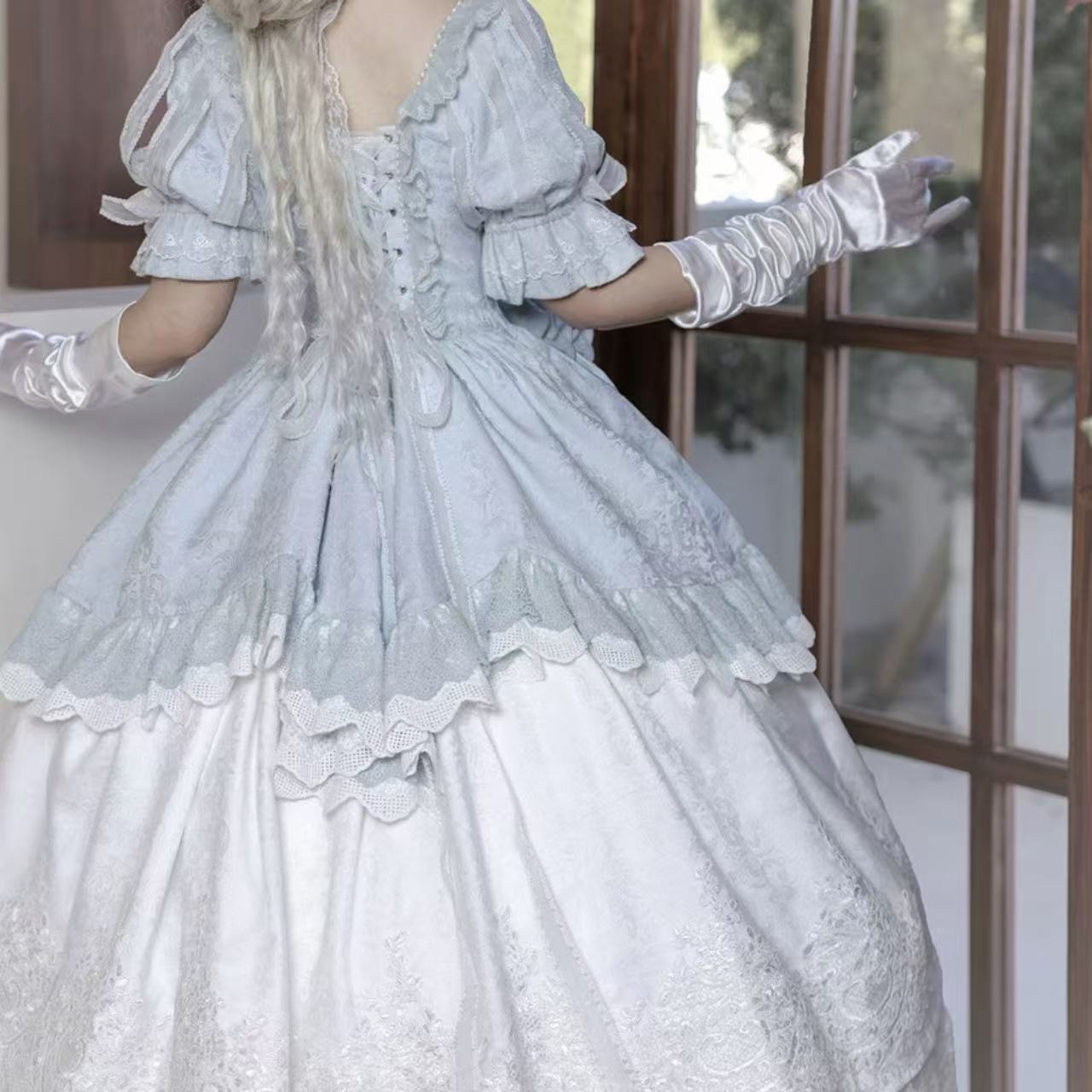 淡くくすんだライトブルーが上品に映える、半袖のクラシカルロリータドレス。なんと13種類ものレースを贅沢に使用し、繊細で高貴な印象を演出します。ライトブルーとホワイトの優しいコントラストが可憐さを引き立て、白い花の装飾が美しいアクセントに。身にまとうだけで気品あふれるオーラを放ち、まるでおとぎ話の中のプリンセスのような優雅さを感じさせる特別な一着です。