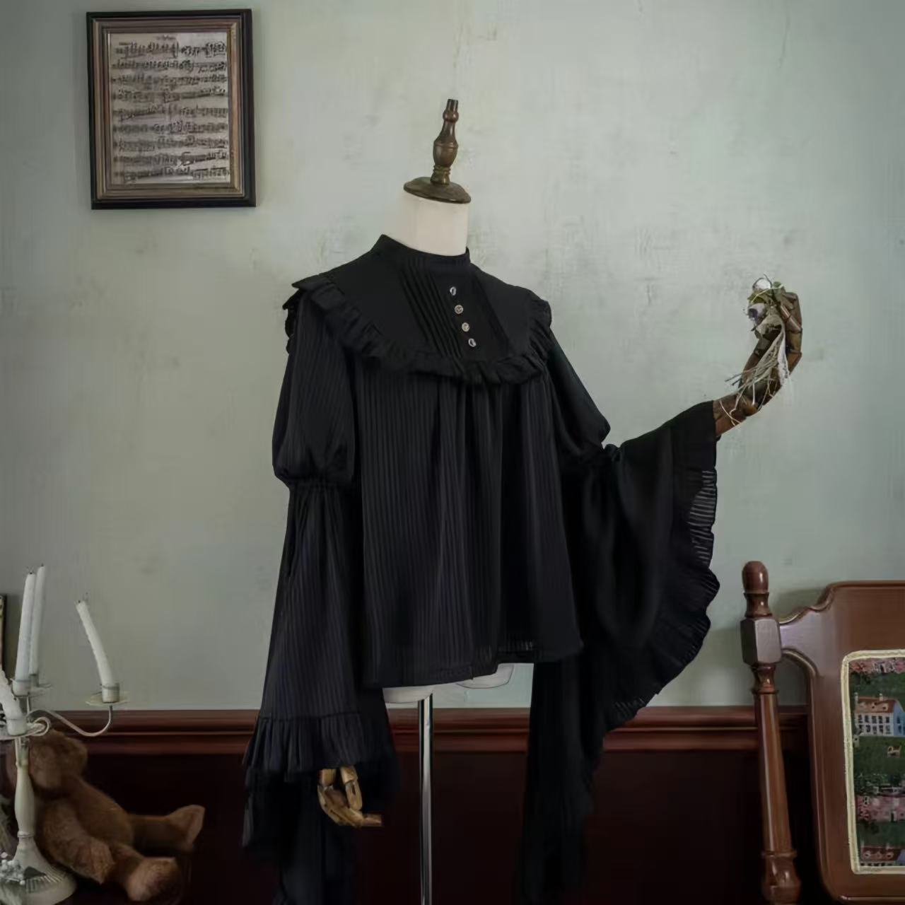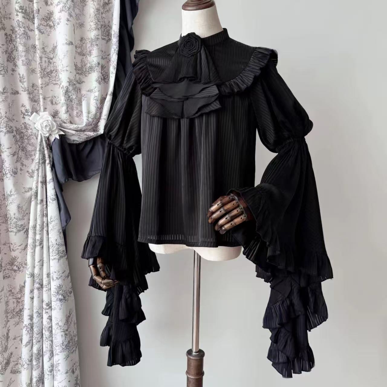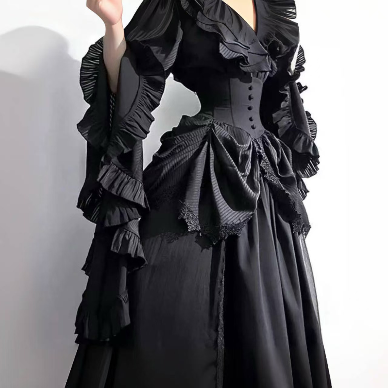 豪華な装飾が目を惹く長袖のクラシカルドレス。コルセット風のウエストラインが美しいシルエットを描き、重ねられたフリルやレースが優雅さを際立たせます。ボリュームたっぷりのスカートと流れるような袖のデザインが、まるで古典絵画の中の貴婦人のような気品を演出。手にした繊細な扇子が華やかさを添え、全体の雰囲気をより一層格調高く仕上げる特別な一着です。