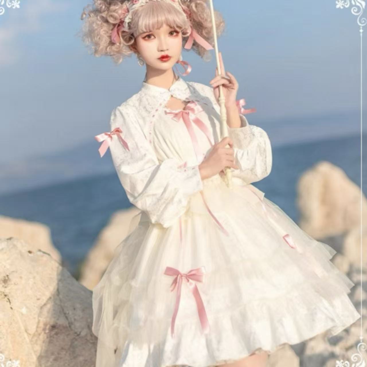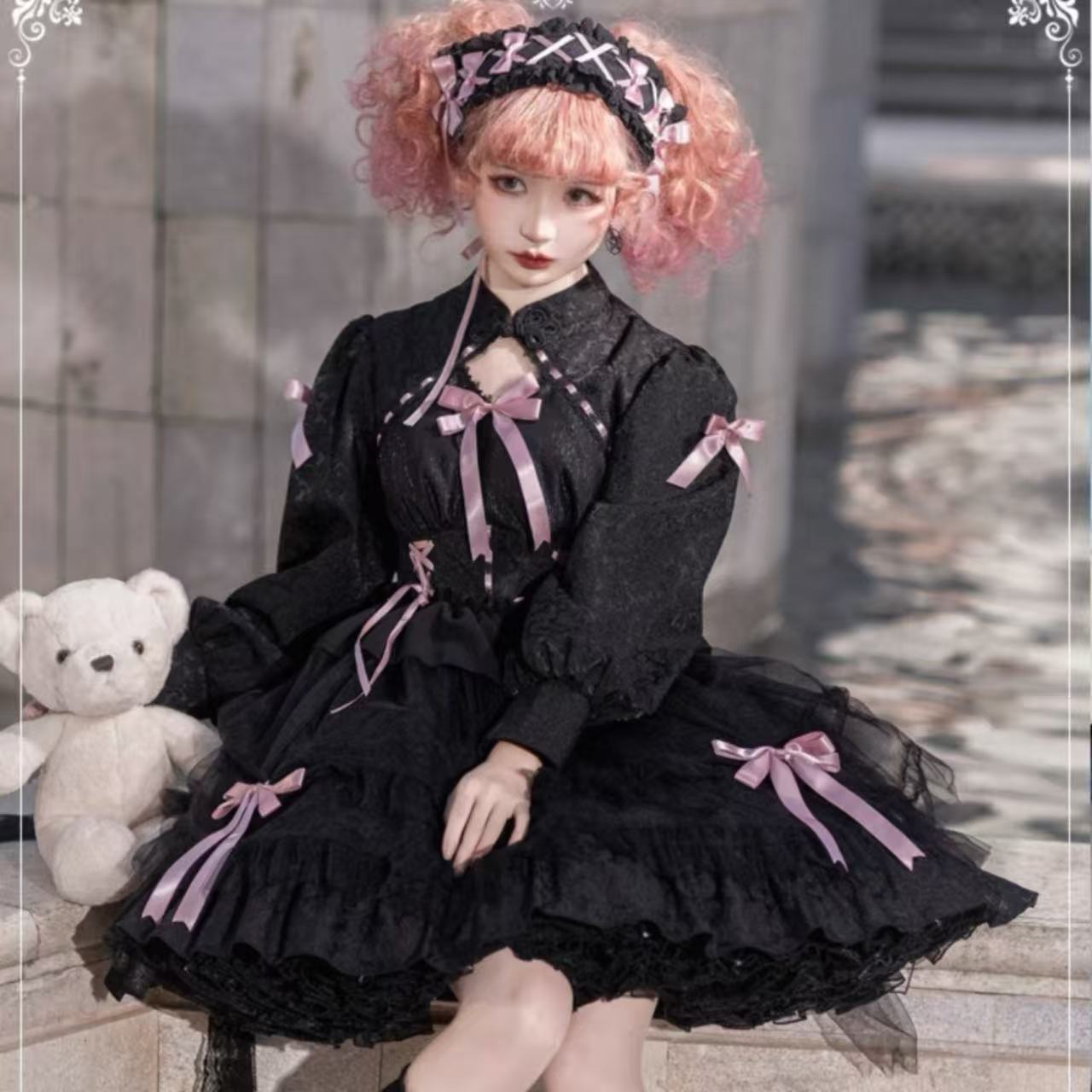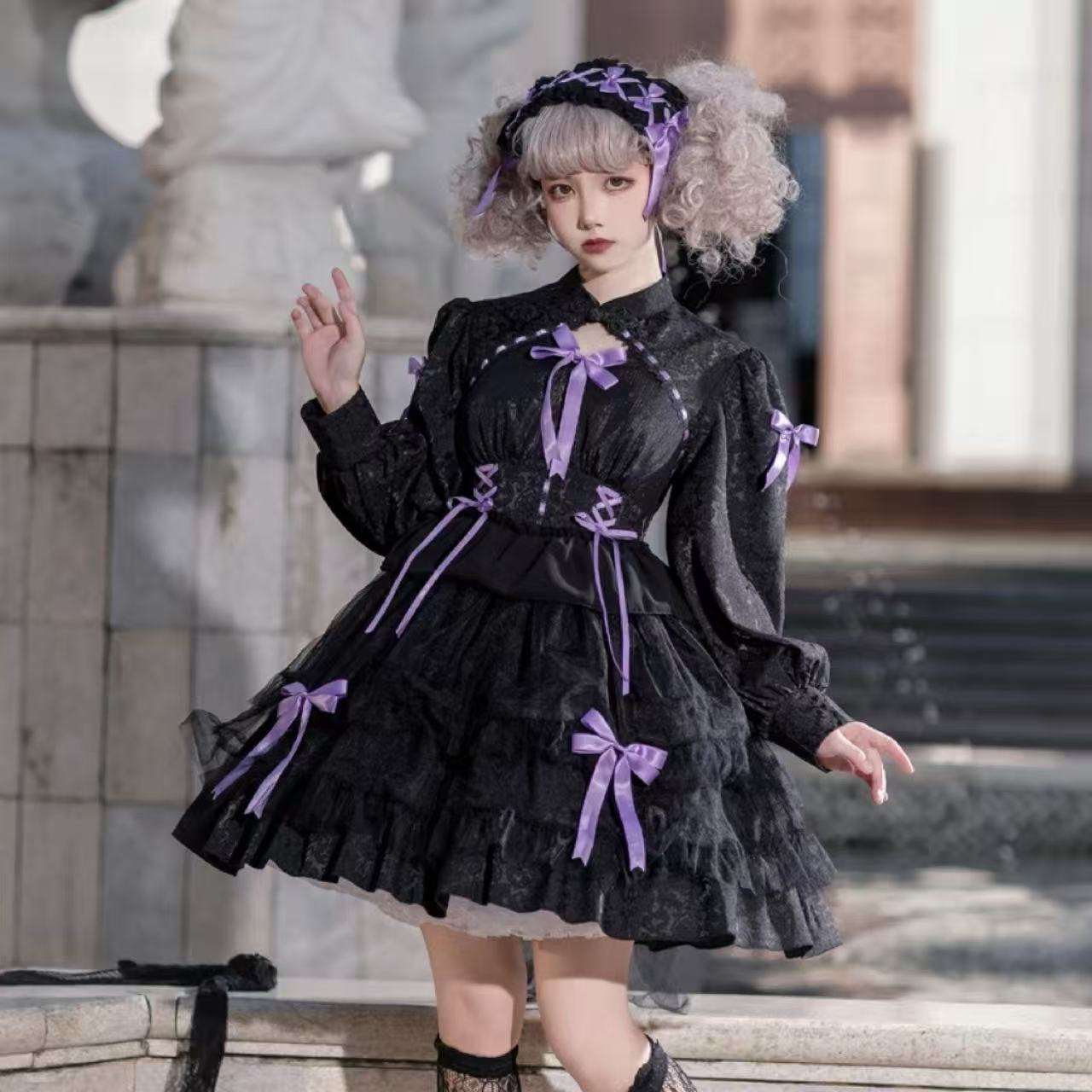 たっぷりあしらわれたリボンが愛らしい、キュートなゴスロリワンピース。ふんわりと広がるボリューム感のある膝上丈スカートが、幼さと可憐さを引き立てます。ブラックはクラシカルでミステリアスに、ホワイトはピュアで清楚な印象にと、色によってまったく異なる魅力を楽しめるのもポイント。甘さと個性を両立させた、視線を惹きつける特別な一着です。