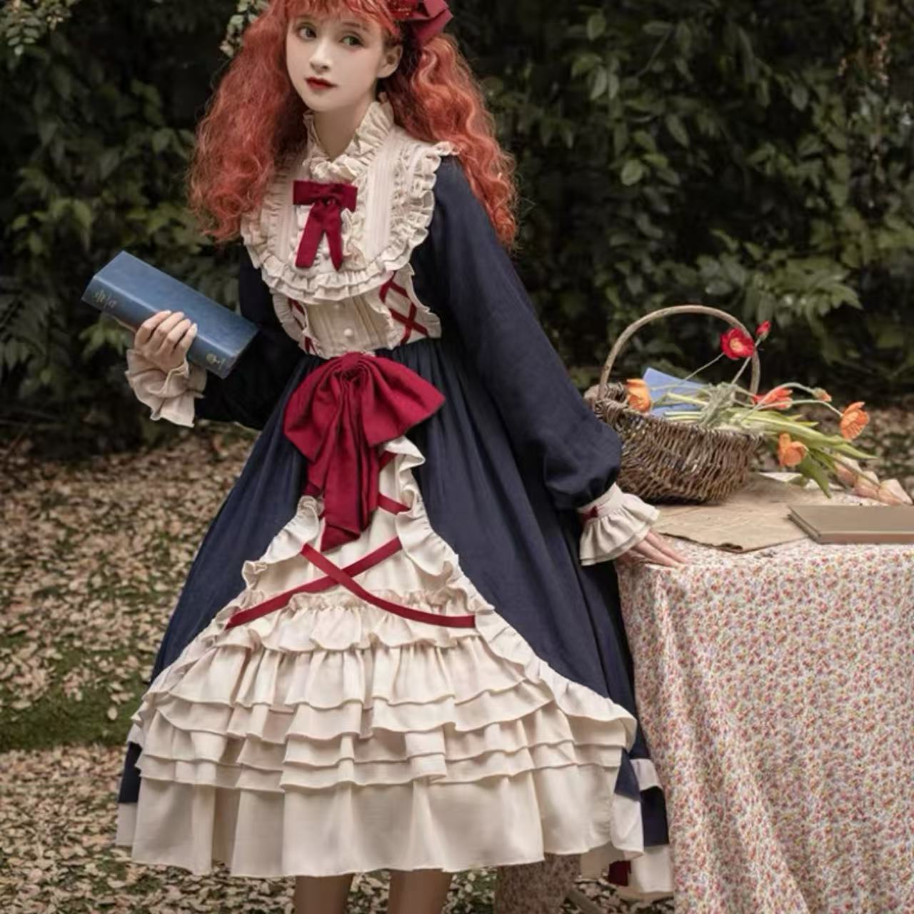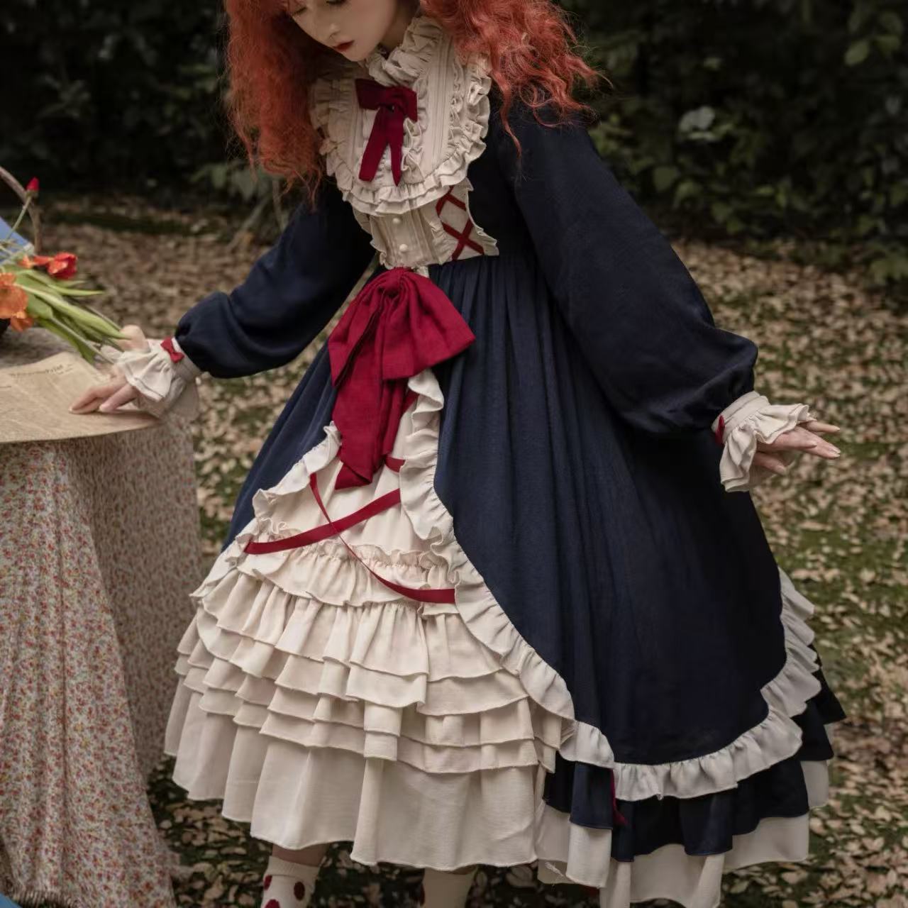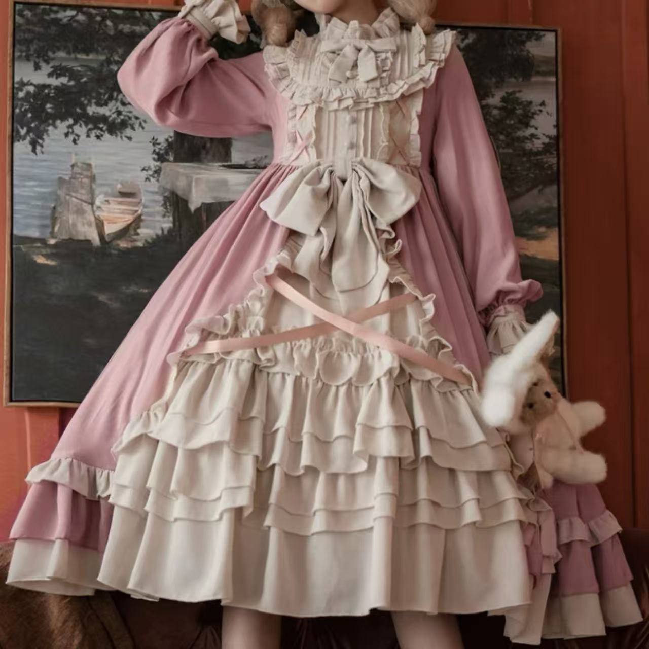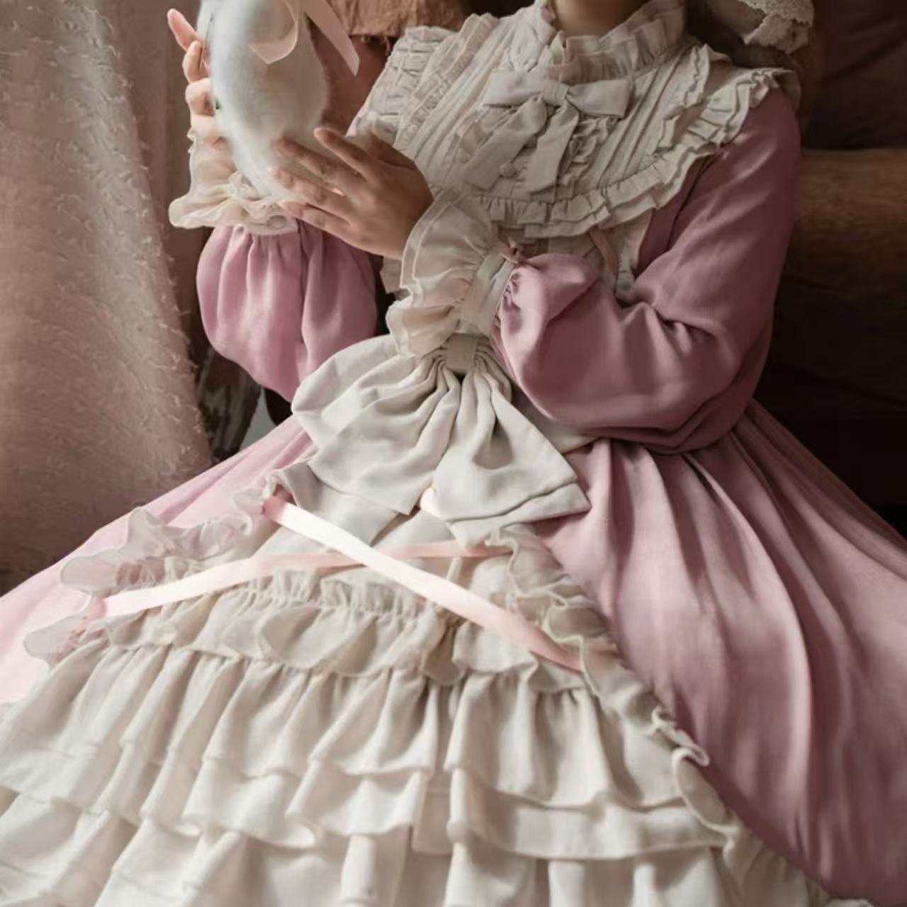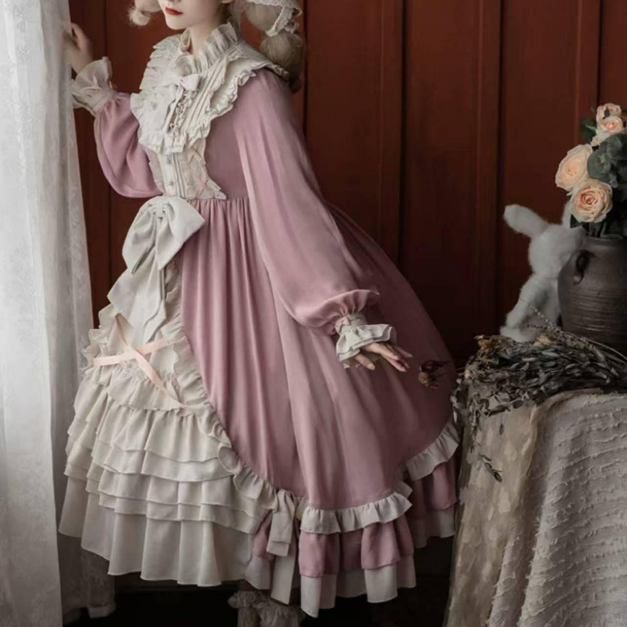 繊細なフリルを贅沢にあしらった、クラシカルな雰囲気漂うロリータワンピース。トップス部分には細やかな装飾が施され、スカートは幾重にも重なるフリルで華やかさと可憐さを演出します。ややくすんだ上品なカラーが落ち着いた印象を与え、ウエストの大きなリボンが全体をより愛らしく引き立てるポイントに。特別な日の装いにもぴったりの一着です。
