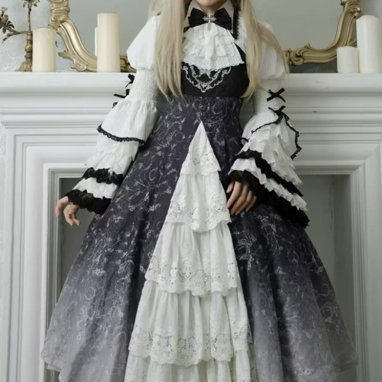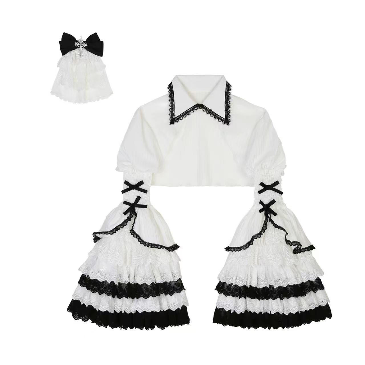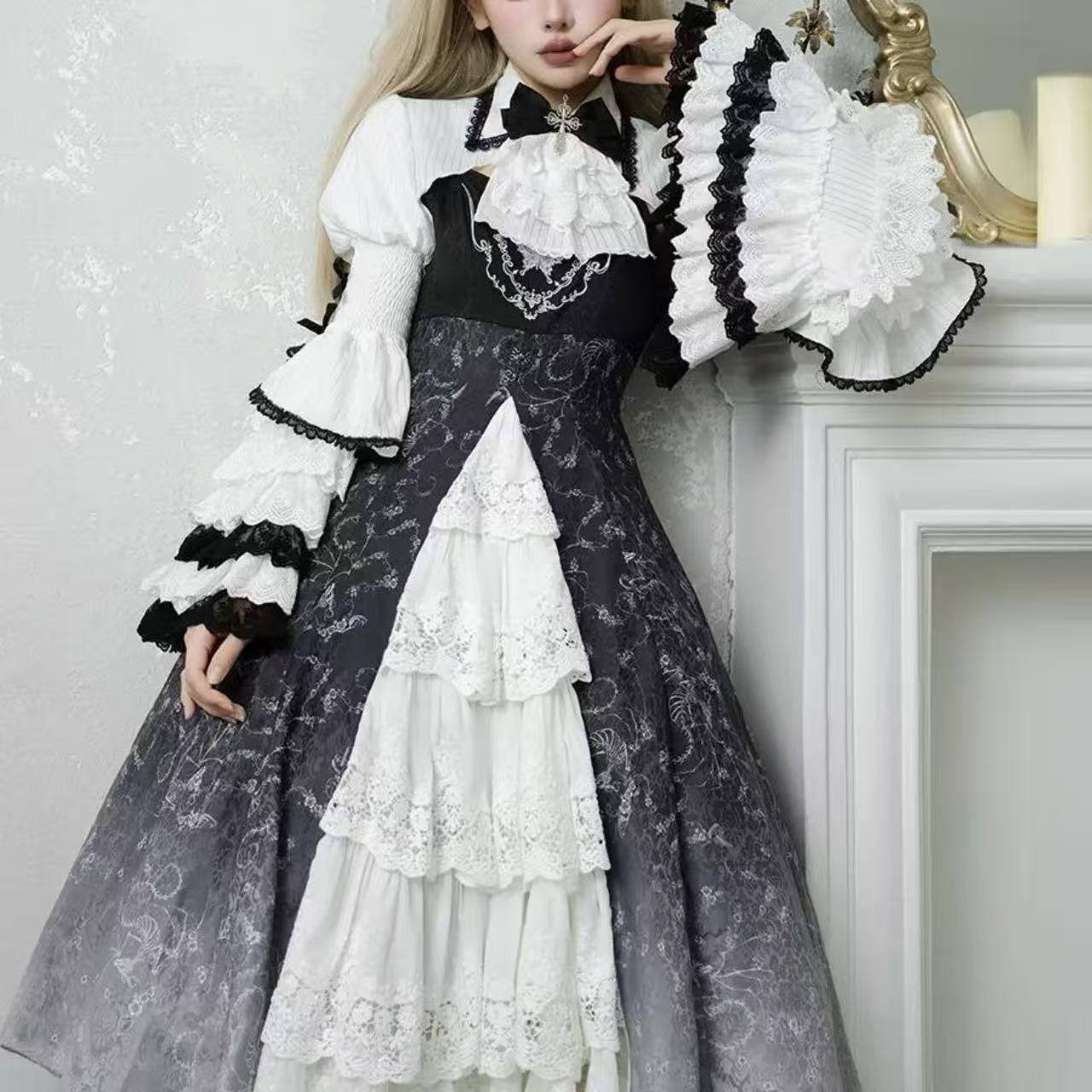 繊細な装飾が美しい、長袖ワンピースと小物の豪華なセット。 ふんわりと広がる多層レースのスカートが優雅なボリュームを生み出し、上品なシルエットを演出します。 黒リボンの髪飾りが全体のアクセントとなり、クラシカルで気品あふれる雰囲気に。 華やかさと優雅さを兼ね備えた、特別な日の装いにふさわしいロリータスタイルの逸品です。