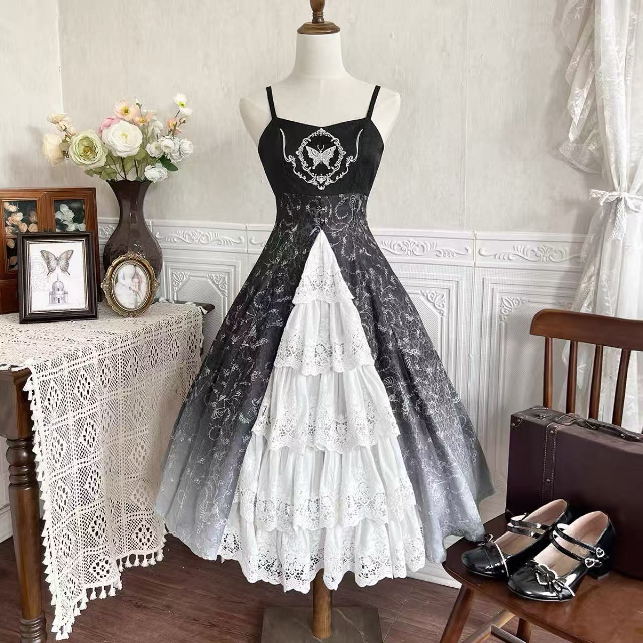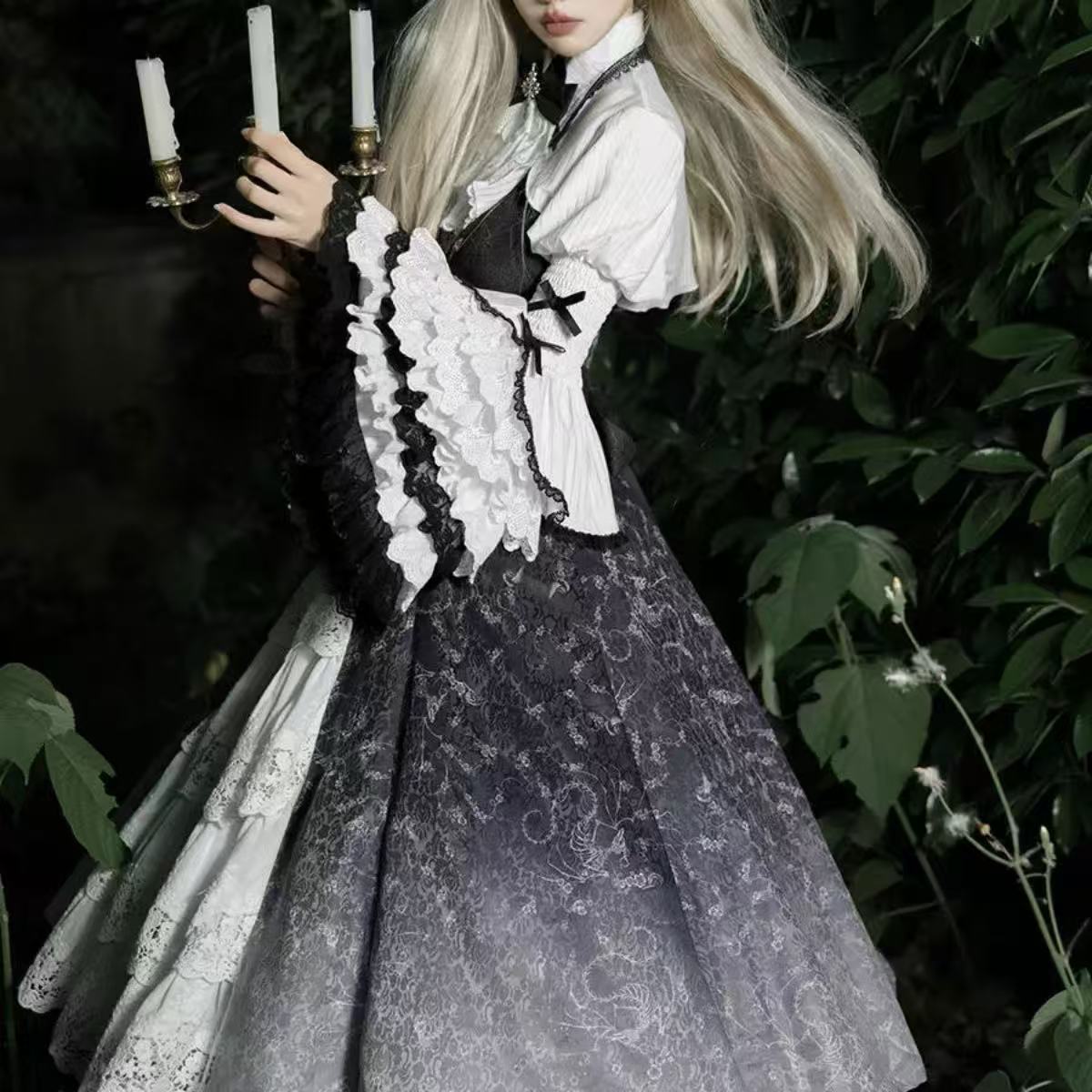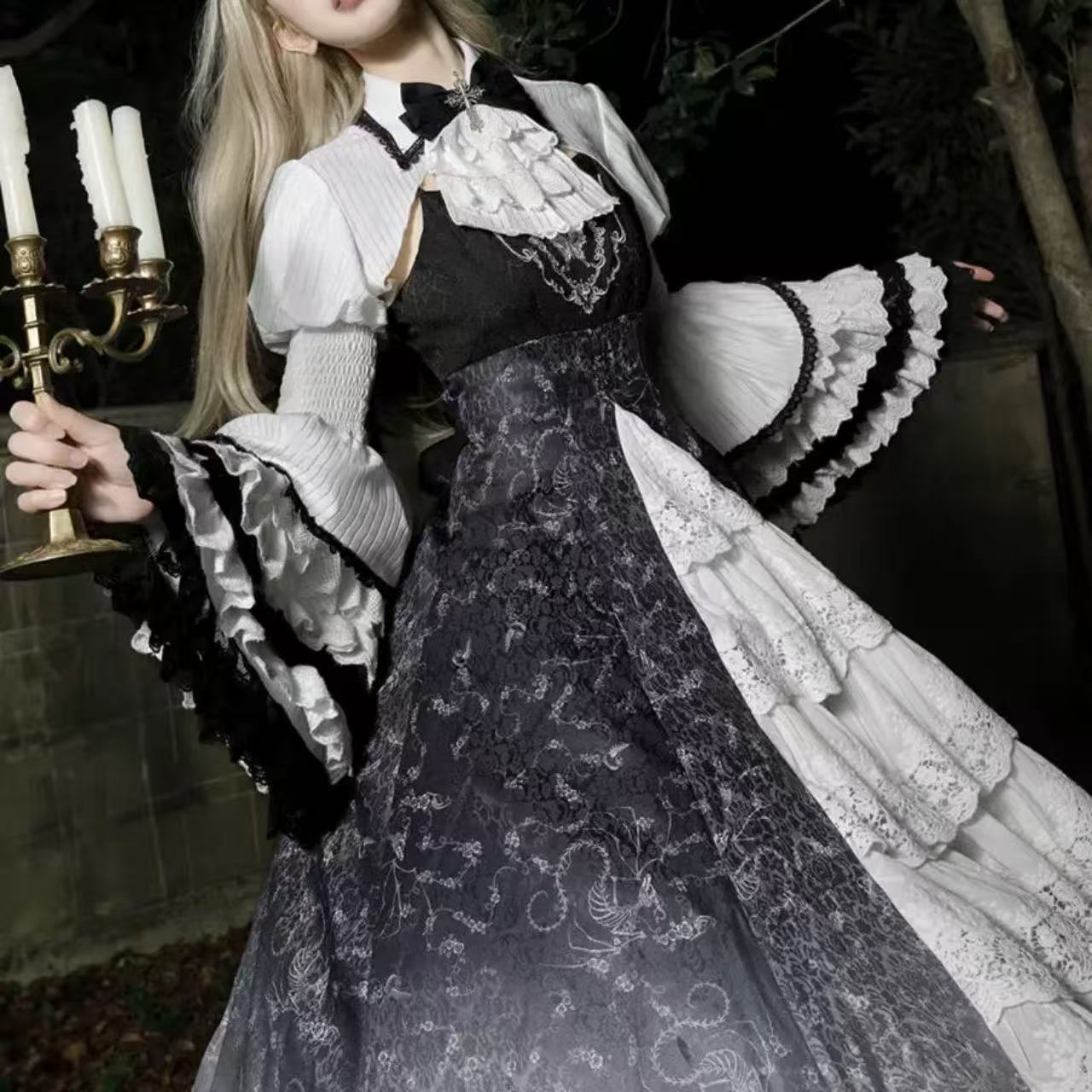 繊細な装飾が美しい、長袖ワンピースと小物の豪華なセット。 ふんわりと広がる多層レースのスカートが優雅なボリュームを生み出し、上品なシルエットを演出します。 黒リボンの髪飾りが全体のアクセントとなり、クラシカルで気品あふれる雰囲気に。 華やかさと優雅さを兼ね備えた、特別な日の装いにふさわしいロリータスタイルの逸品です。