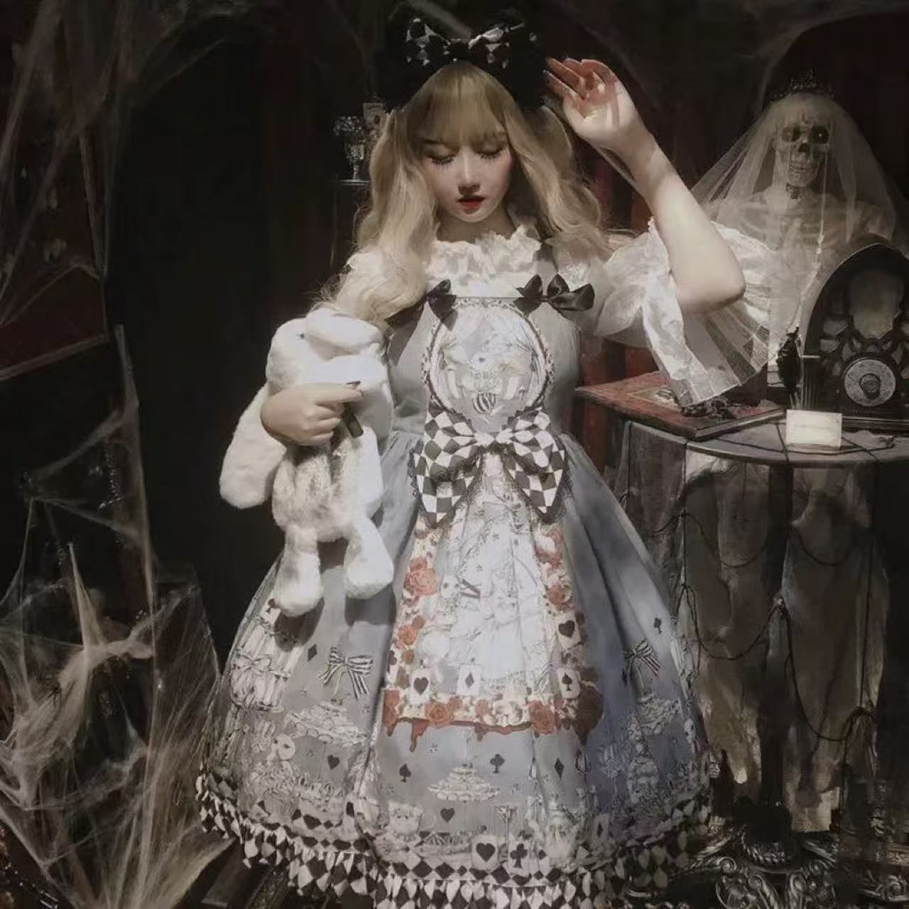 まるで不思議の国へ迷い込んだような、幻想的な魅力を放つロリータドレス。 ファンタジックでロマンチックなデザインが、上品さの中にどこかアンニュイな雰囲気を漂わせます。 繊細なフリルやレースの装飾、夢のように美しいプリントが重なり合い、物語のヒロインのような存在感を演出。 このドレスを身に纏えば、まるで夢の世界を旅する愛らしくも神秘的な少女に変身できます。