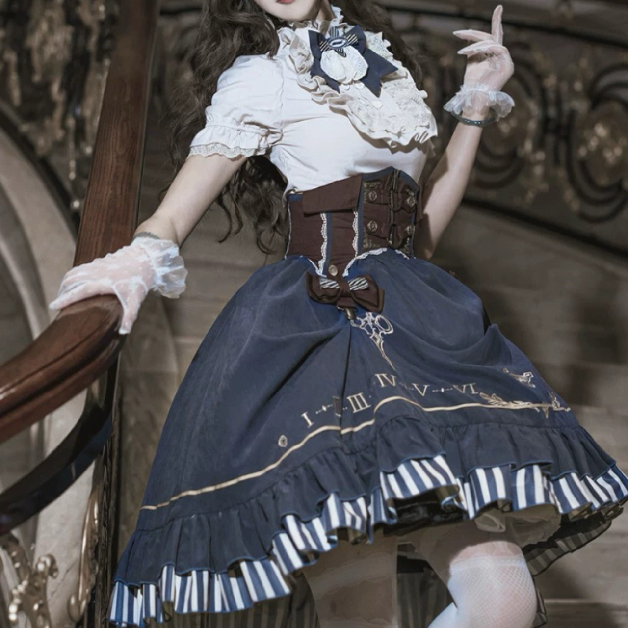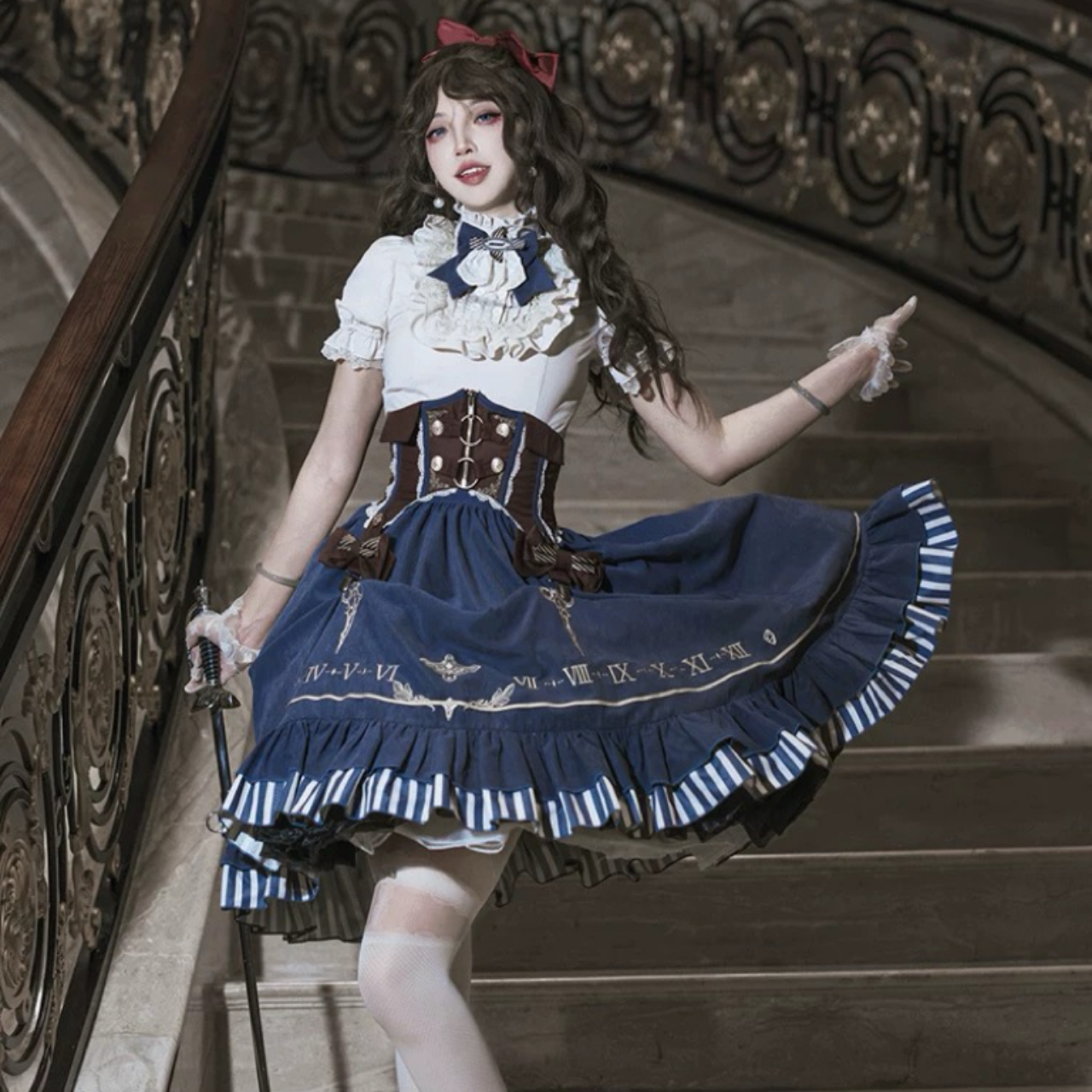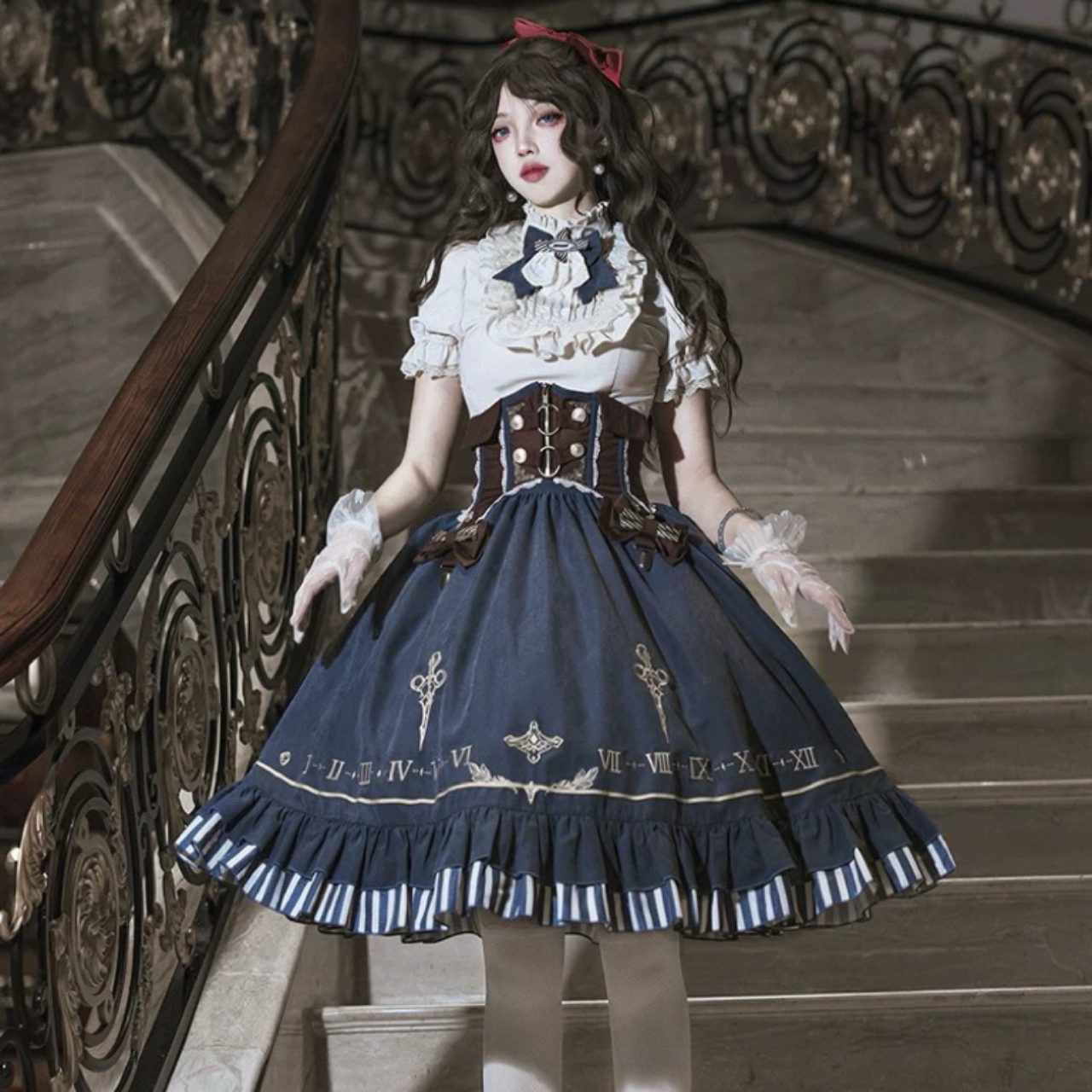 優雅な階段で映える、時計モチーフが印象的なゴシックロリータドレス。フリルたっぷりの襟元とコルセット風ウエストでクラシカルな美しさを演出。スカートにはローマ数字の刺繍が施され、細部までこだわり抜かれています。手袋や剣のアクセサリーを合わせれば、貴族の剣士のような上品で個性的なスタイルが完成。特別なイベントや撮影にぴったりの一着です。