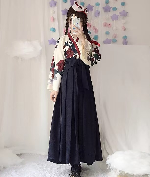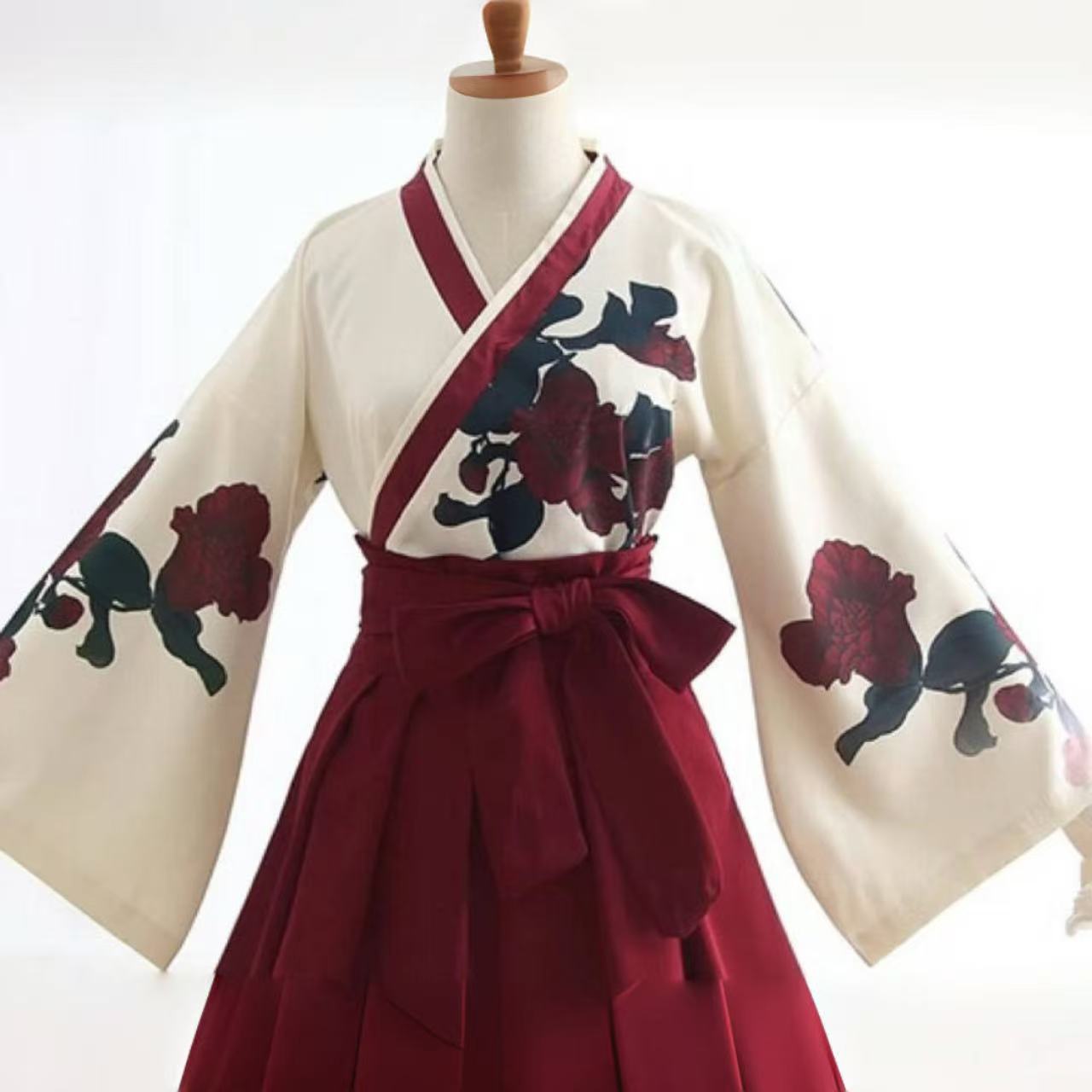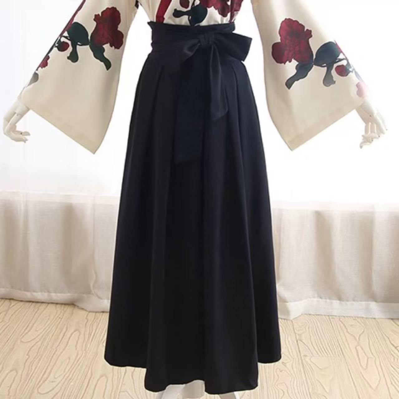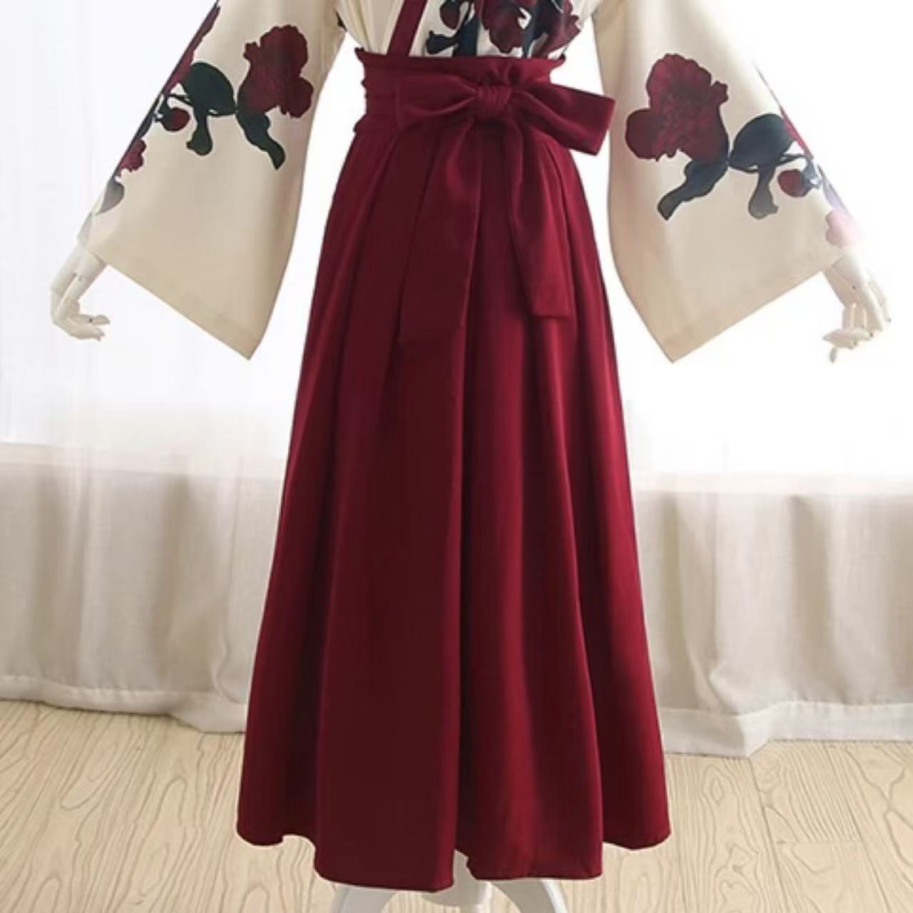 着物風デザインのトップスとロングスカートがセットになった、華やかな和風ロリータです。 真っ赤な花が咲き誇るデザインが目を惹き、足首まで広がるスカートが優雅さを演出。 伝統的な美しさとロリータの可愛らしさを融合させた、特別な一着です。 【セット内容】シャツ、ロングスカート