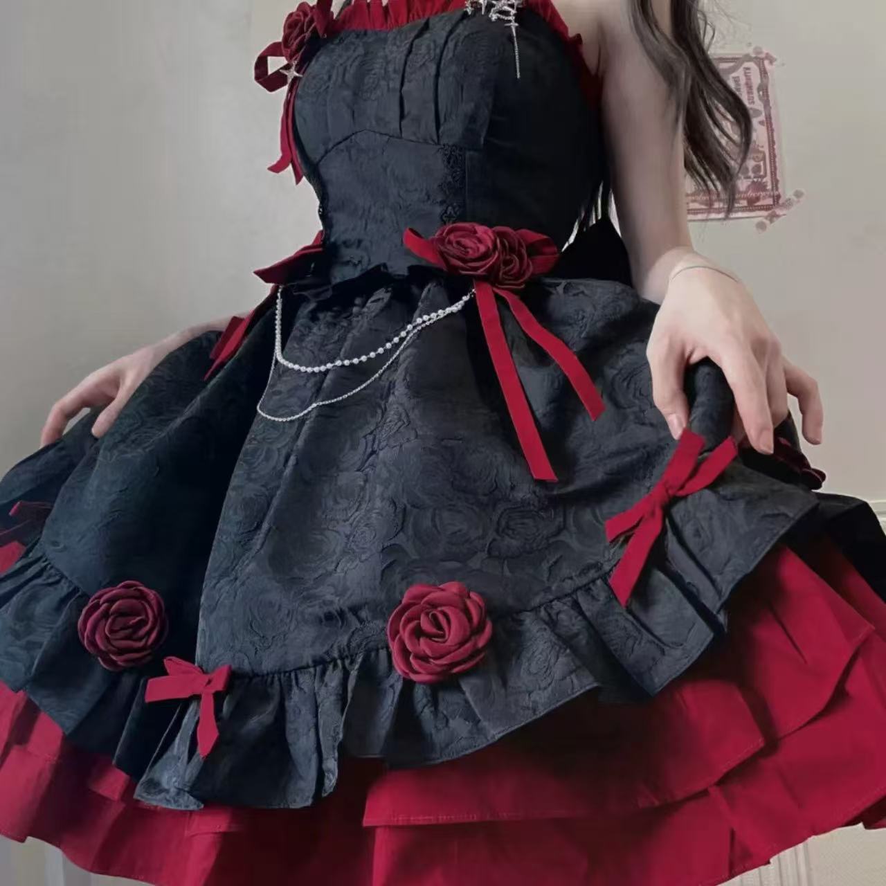 色違いのフリルと薔薇の装飾が可愛いゴスロリジャンパースカート。背中の大きなリボンが華やかさをプラスし、後ろ姿まで魅力的に演出します。上品で可憐な雰囲気を楽しめる一着です。