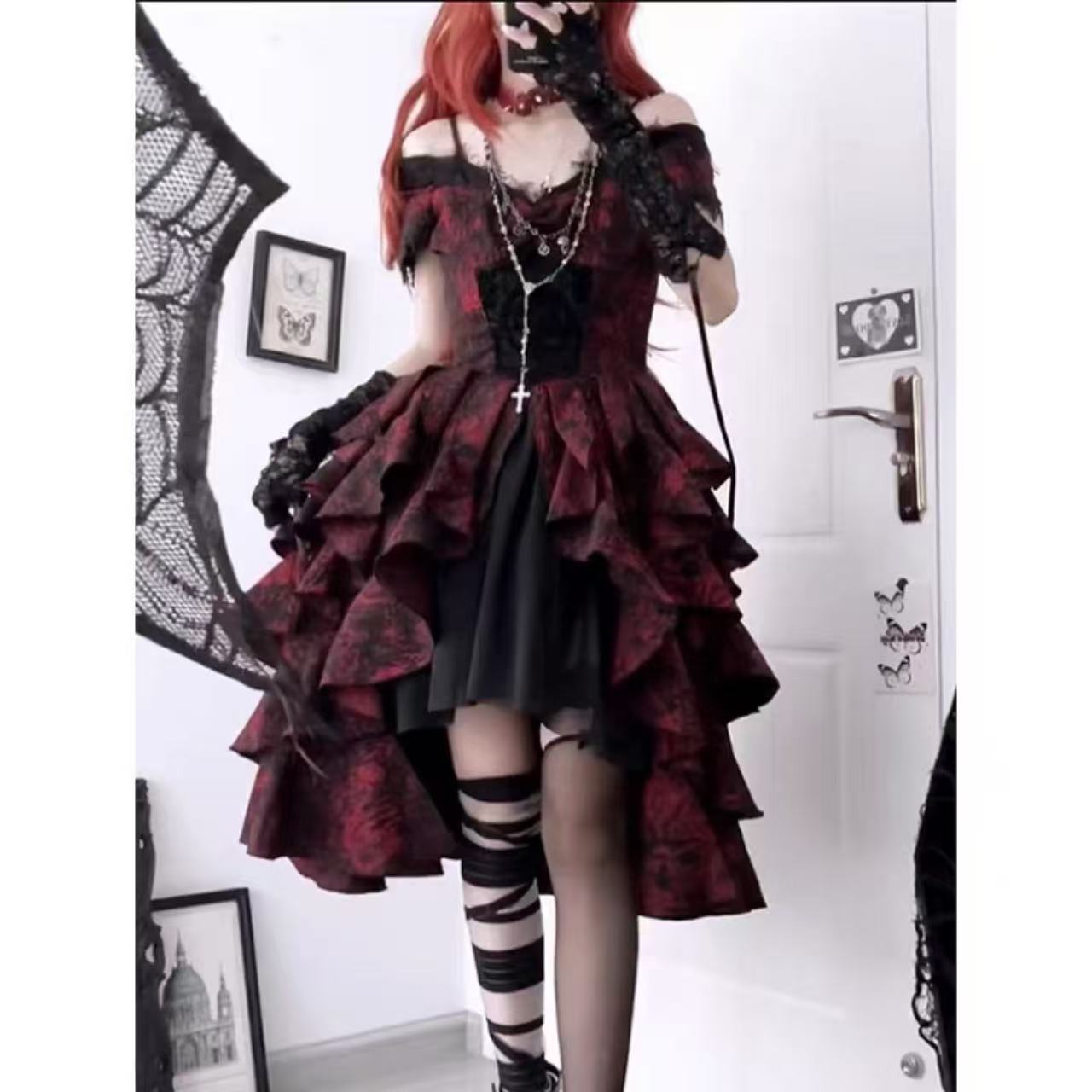 【ゴスロリ】ダークゴシックロリータ ワインレッド プリンセスドレス。深みのあるワインレッドが妖しく美しい、存在感抜群の半袖ワンピースです。豪華なレースと重厚感のあるスカートが、シルエットを華やかに演出。胸元の装飾や陰影のあるデザインが、ミステリアスなプリンセスのような雰囲気を引き立てます。特別なイベントやハロウィン、撮影会にもおすすめの一着です。