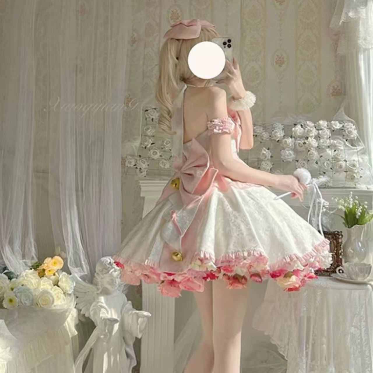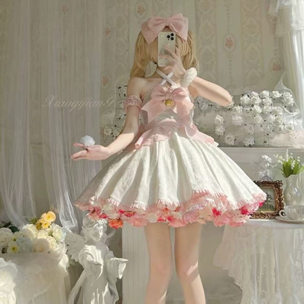 【ロリータ】春夏にぴったりの魔法少女風プリンセスドレス。白とピンクの配色が可愛らしく、ホルターネックのリボンデザインが首元を華やかに演出。軽やかな生地で動くたびに揺れる、甘くロマンチックな雰囲気の一着です。