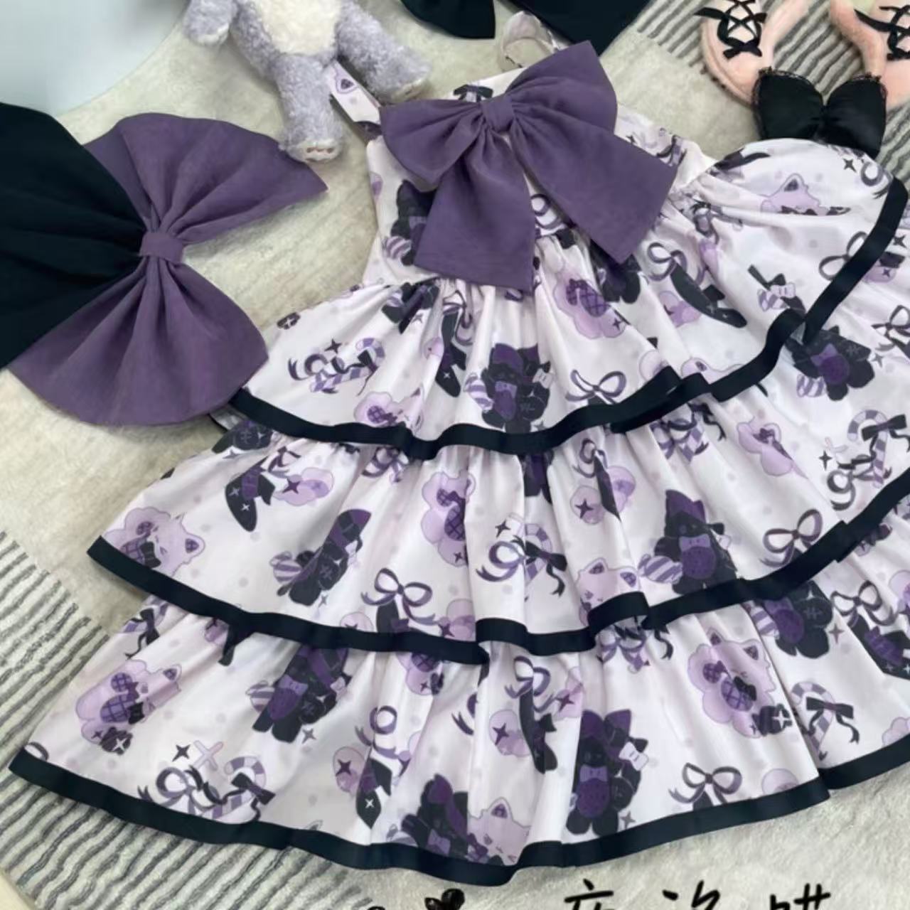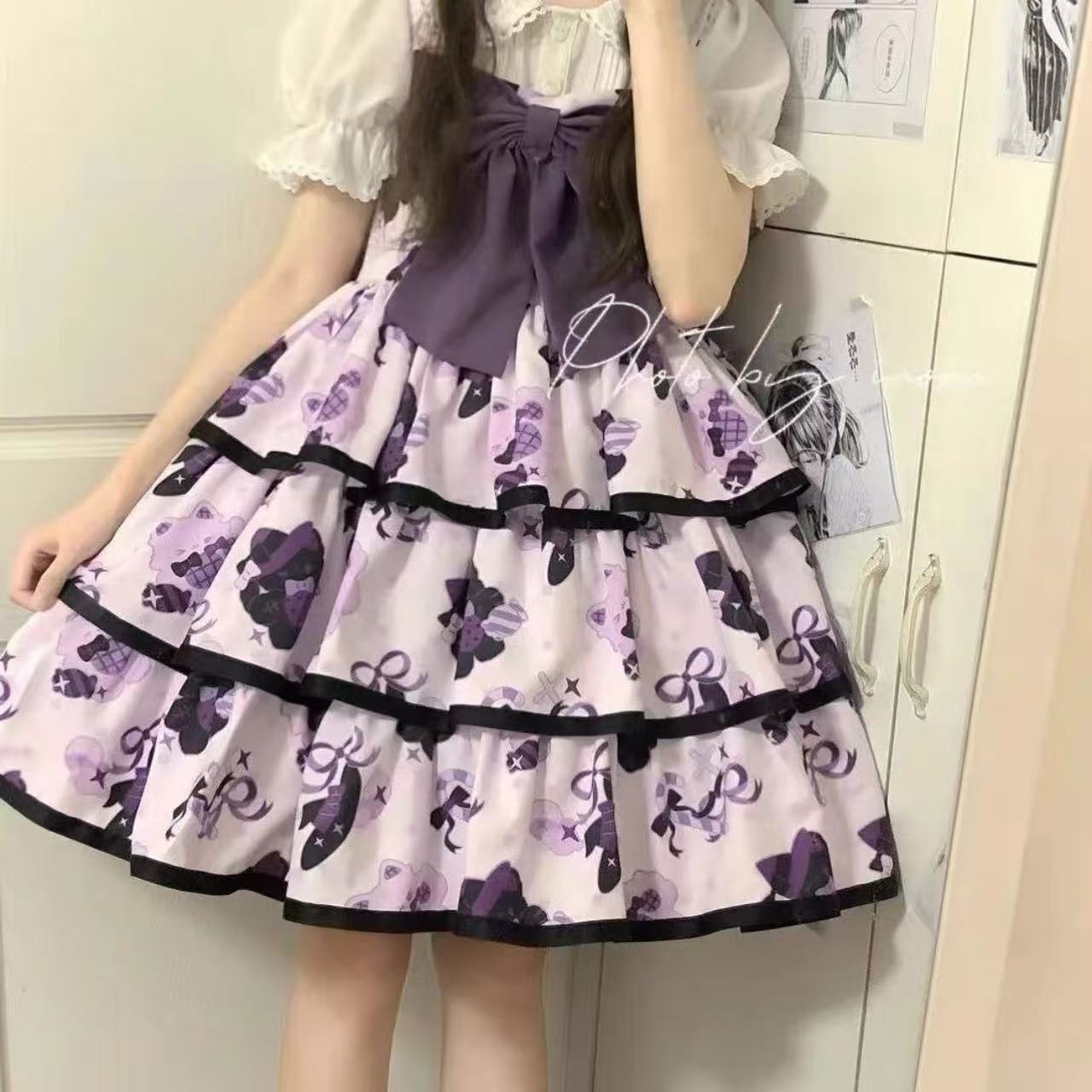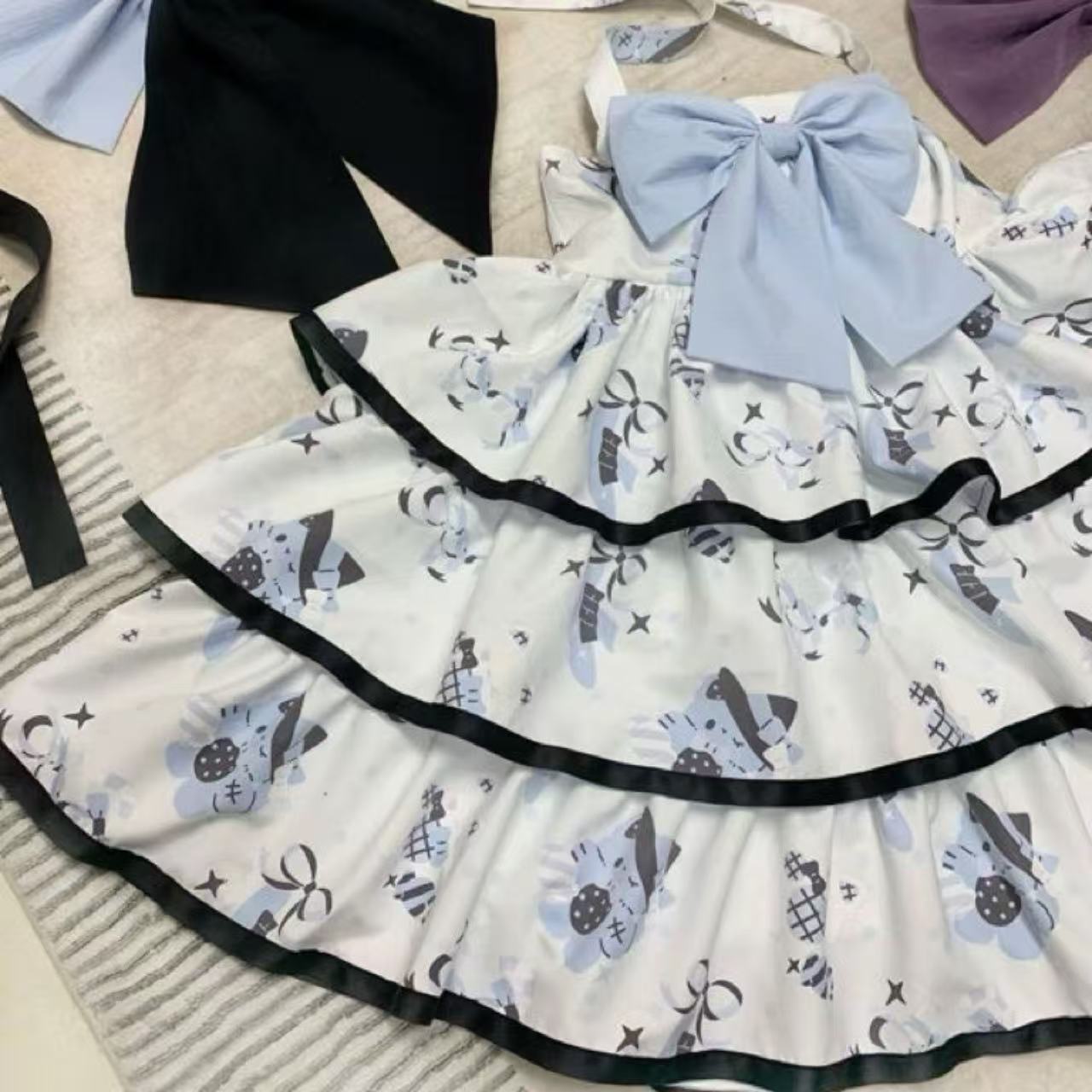 【ロリータ】人形襟のシャツとフリルリボンが愛らしいサスペンダースカートスーツ。スカートには小さなペンギンと猫のプリントが施され、遊び心あふれるデザインです。クラシカルなシルエットとガーリーな雰囲気が調和した、ロリータ初心者にもおすすめの一着です。