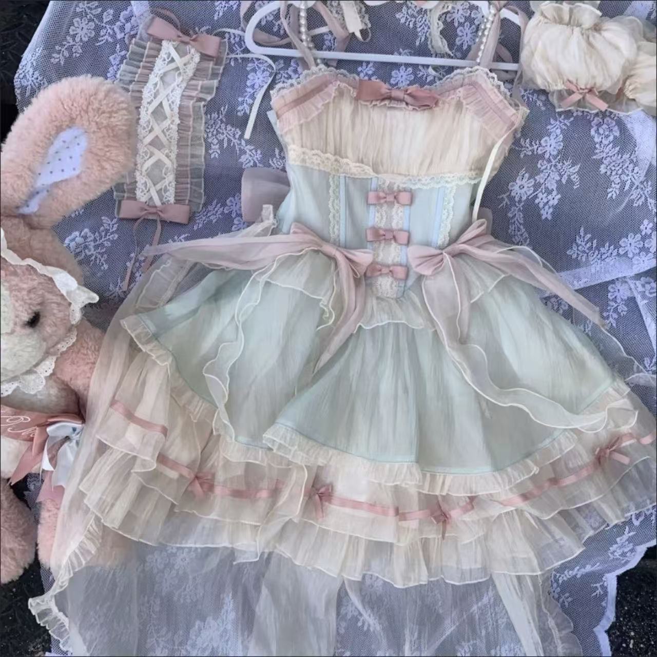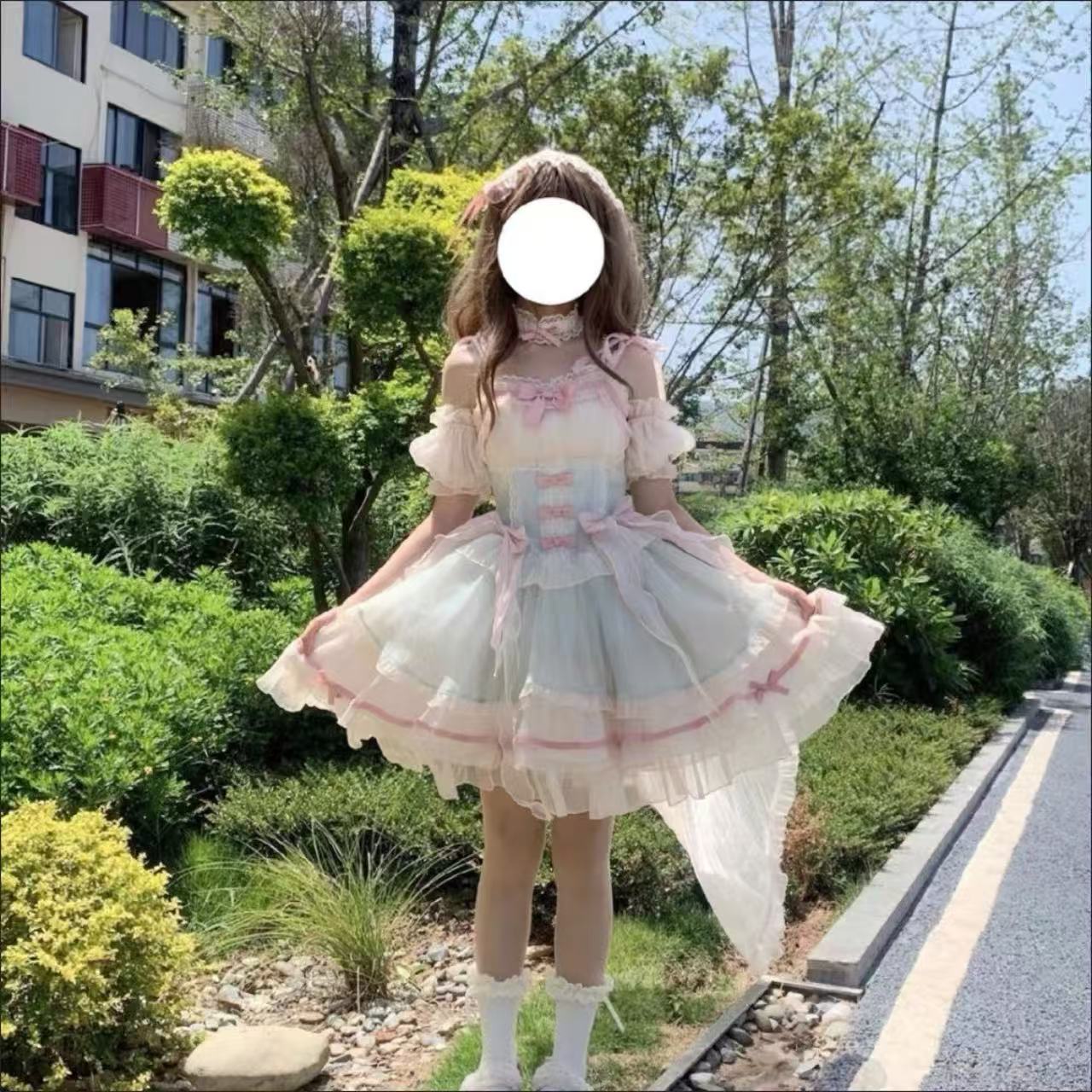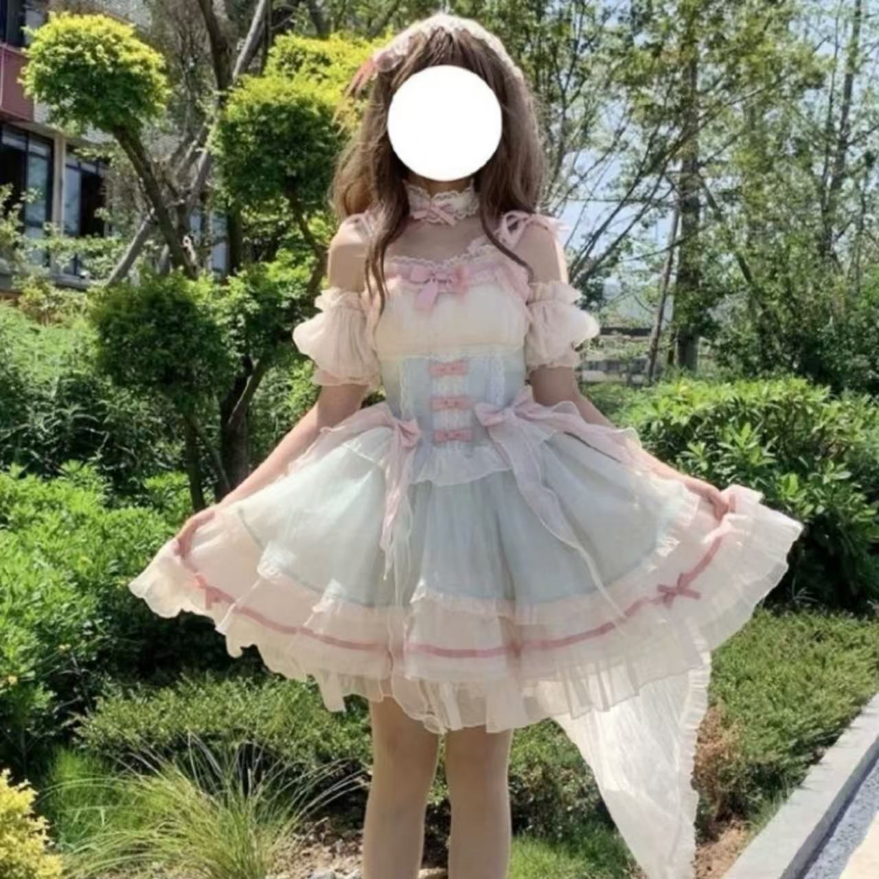 【ロリータドレス】ミントグリーンと桜ピンクの淡い色合いが可憐なスイートフェアリーバレエスタイルのJSK。軽やかなスリングデザインとチュールスカートがふんわり広がり、誕生日や成人式など特別な日にぴったりの華やかな一着です。