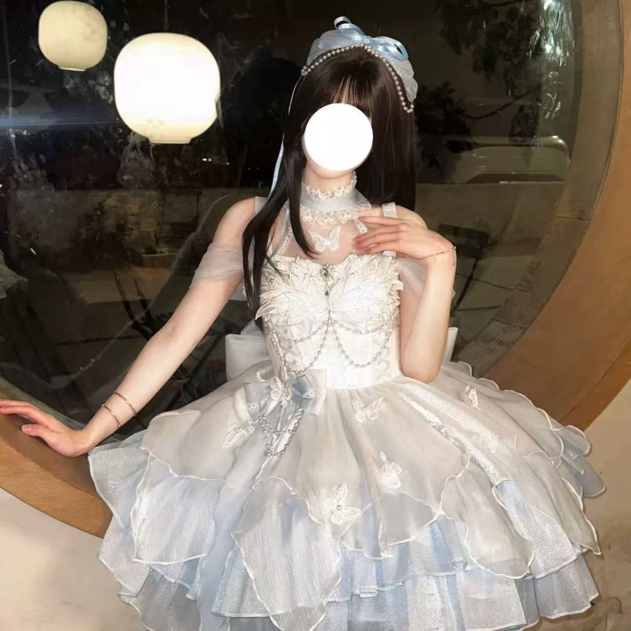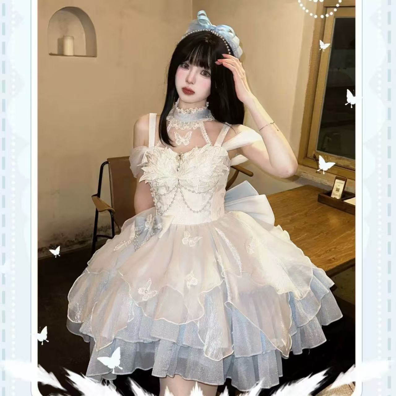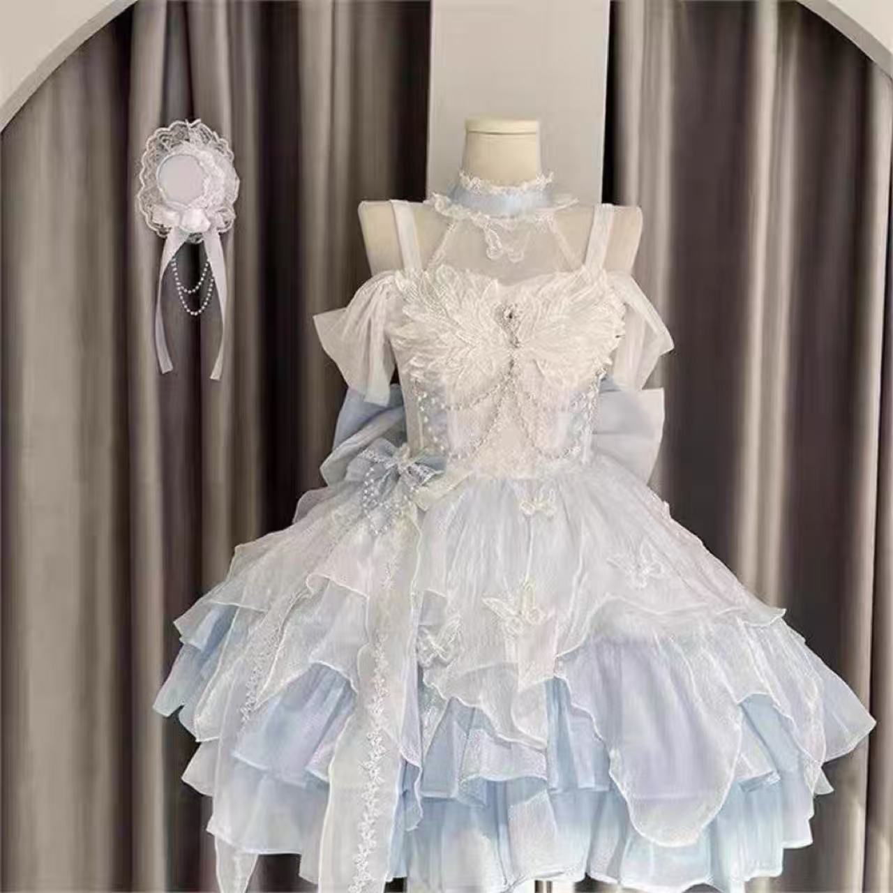 【ロリータドレス】白鳥の湖をイメージした青と白のエレガントなウェディング風ドレス。大きな蝶結びが華やかさを添え、上品でロマンチックな雰囲気を演出します。誕生日や成人式など特別な日の装いにぴったりの一着です。