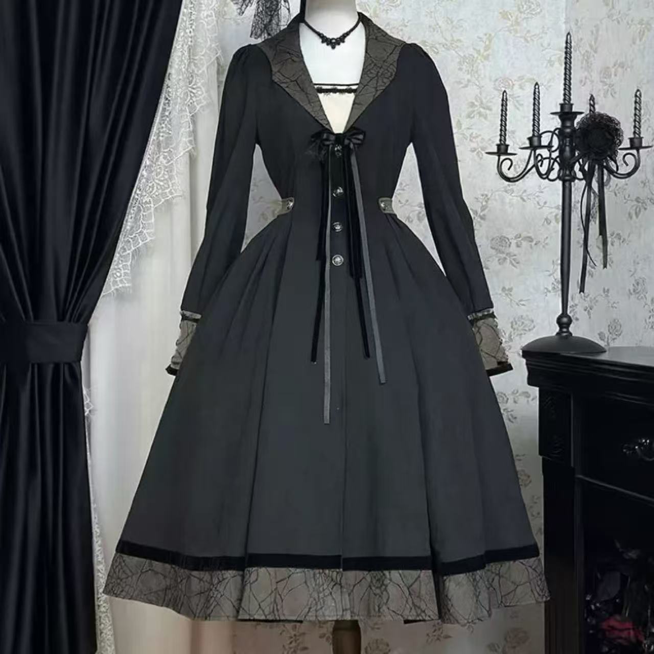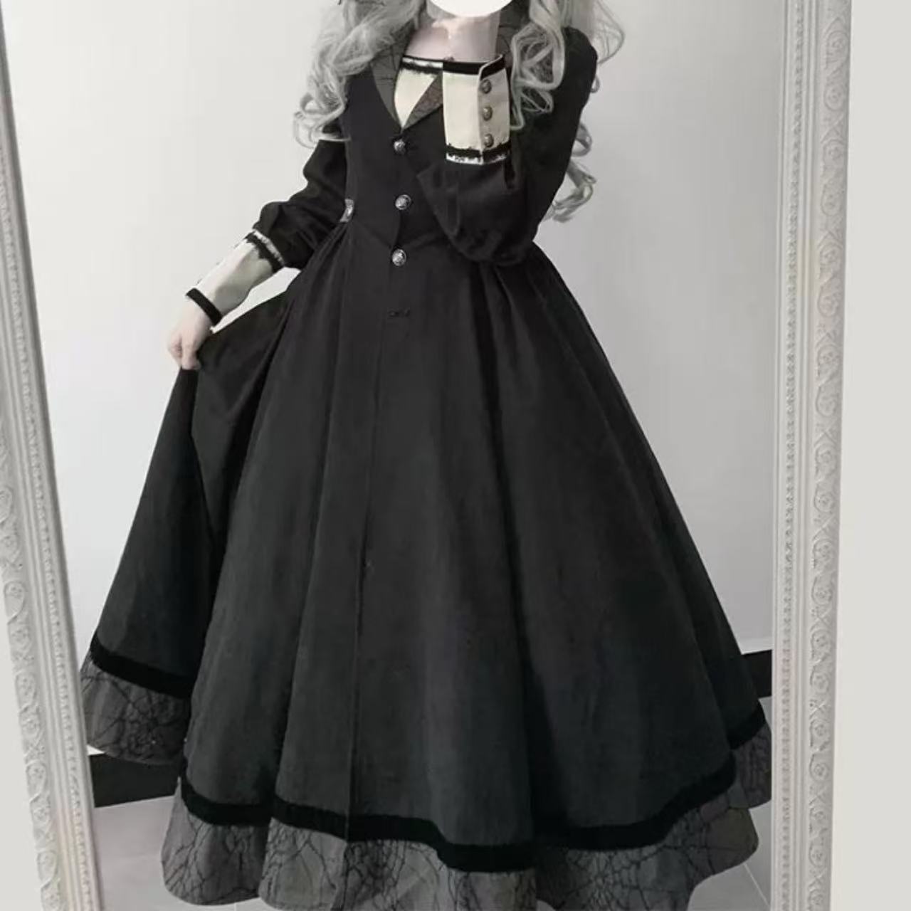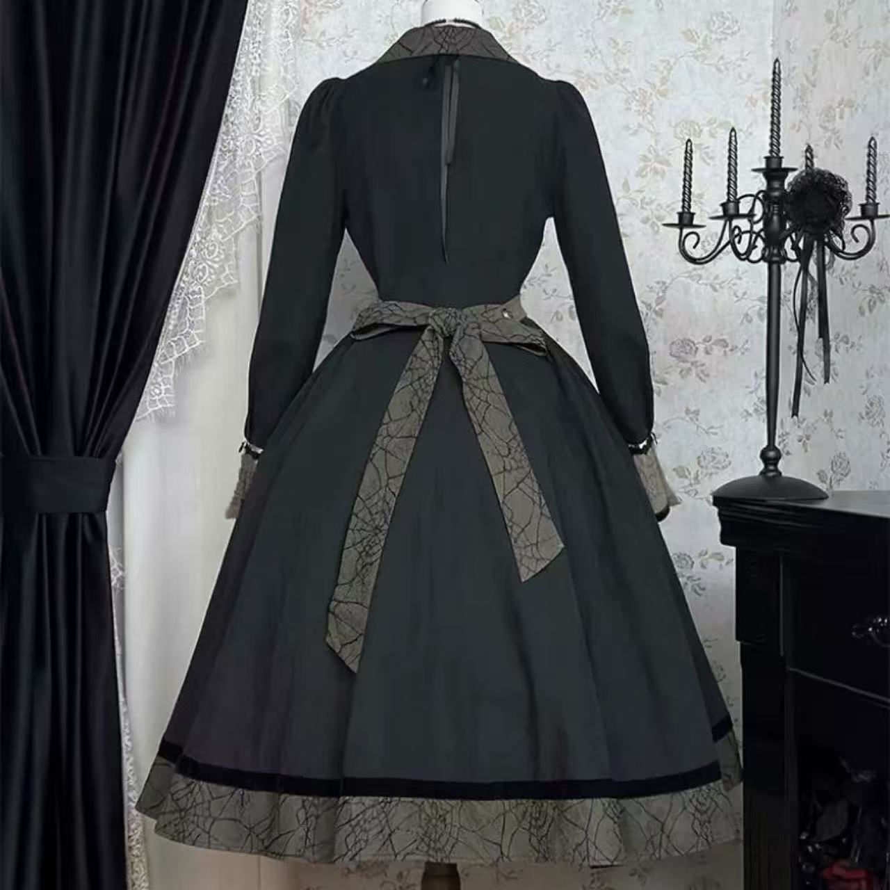 【ゴスロリ】ハロウィンナイトにぴったりのスパイダーモチーフゴシックロリータドレス。蜘蛛の巣デザインとレースの装飾がダークでミステリアスな雰囲気を演出します。光沢のある生地とフリルが、妖艶で上品な魅力を引き立てる一着です。