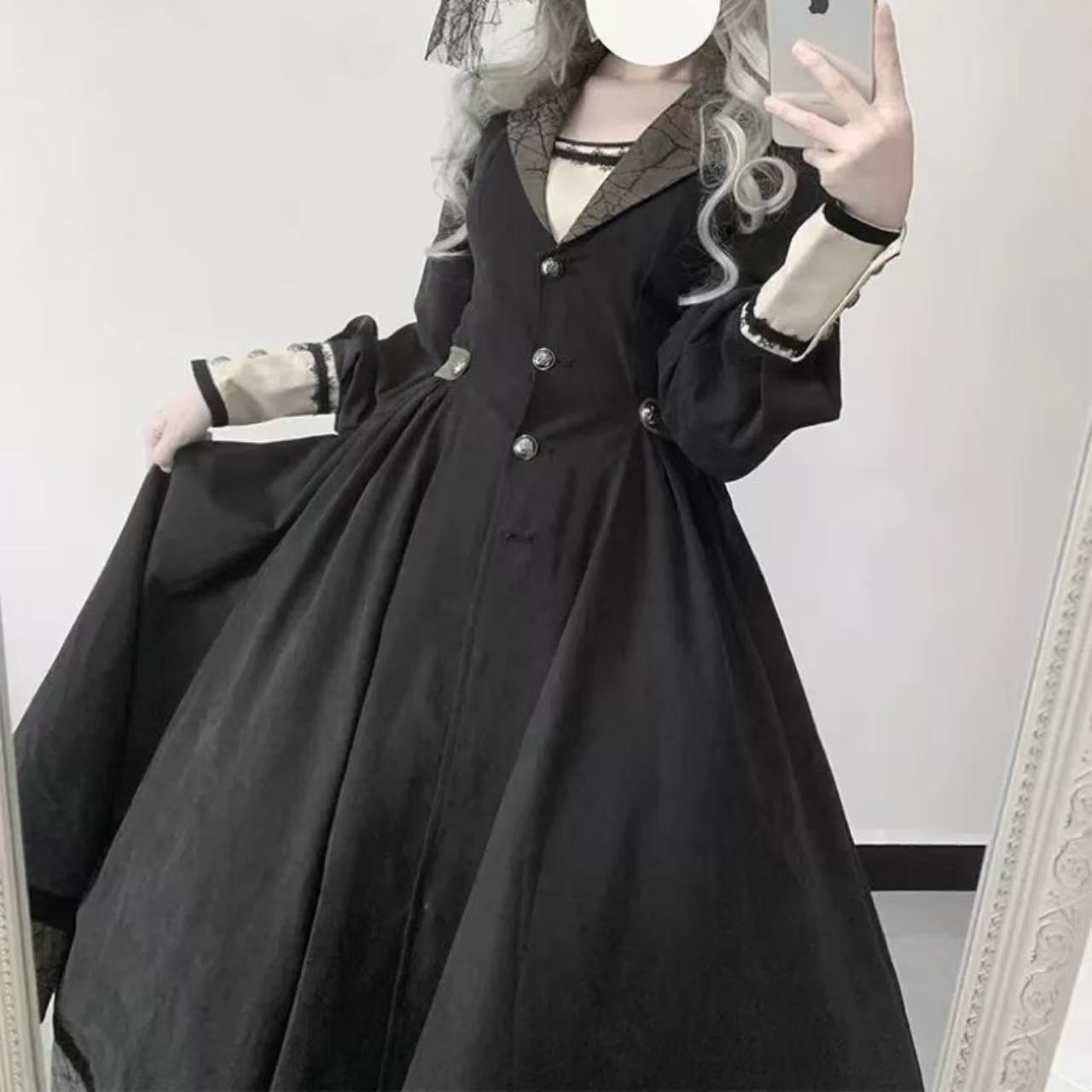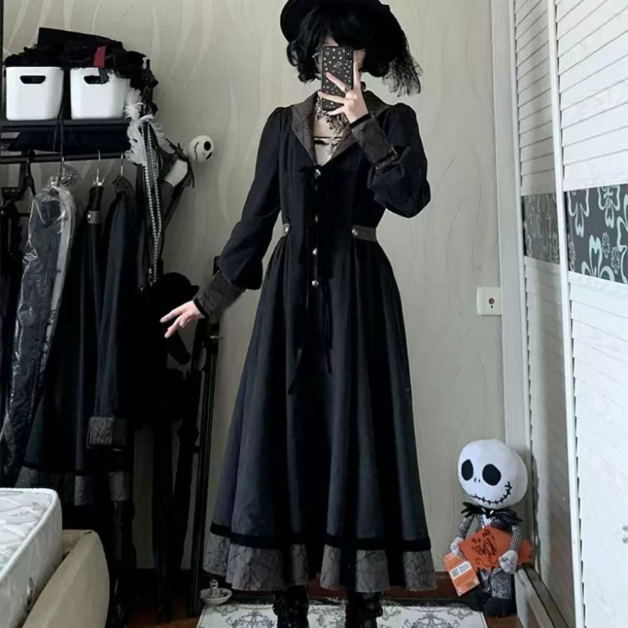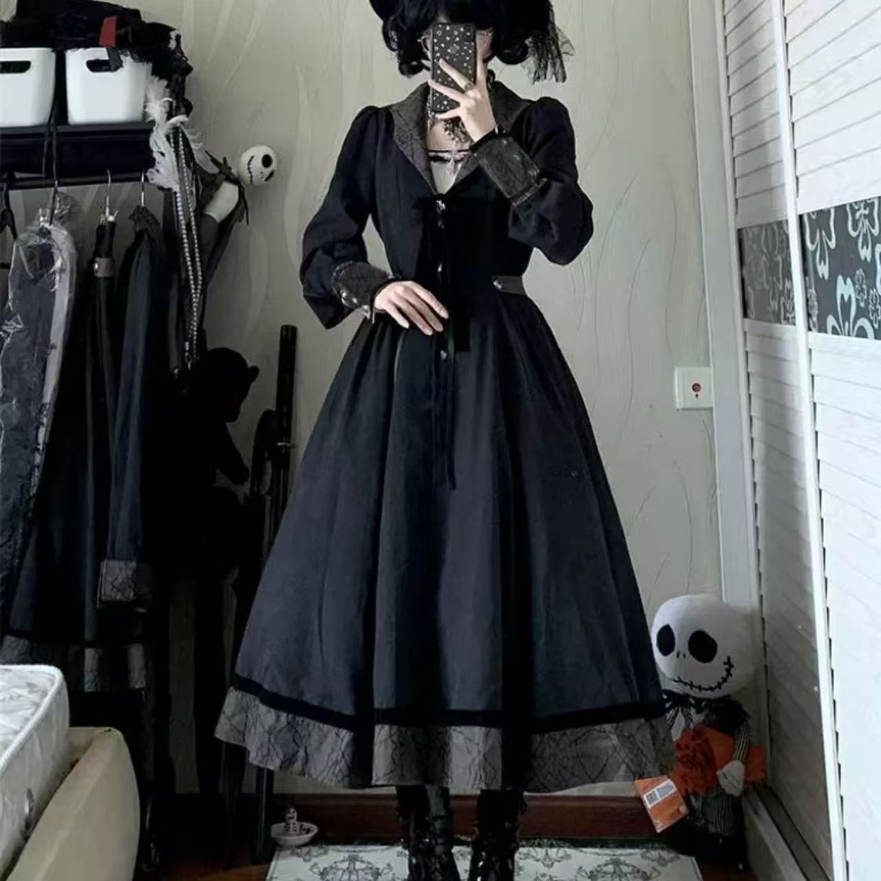 【ゴスロリ】ハロウィンナイトにぴったりのスパイダーモチーフゴシックロリータドレス。蜘蛛の巣デザインとレースの装飾がダークでミステリアスな雰囲気を演出します。光沢のある生地とフリルが、妖艶で上品な魅力を引き立てる一着です。