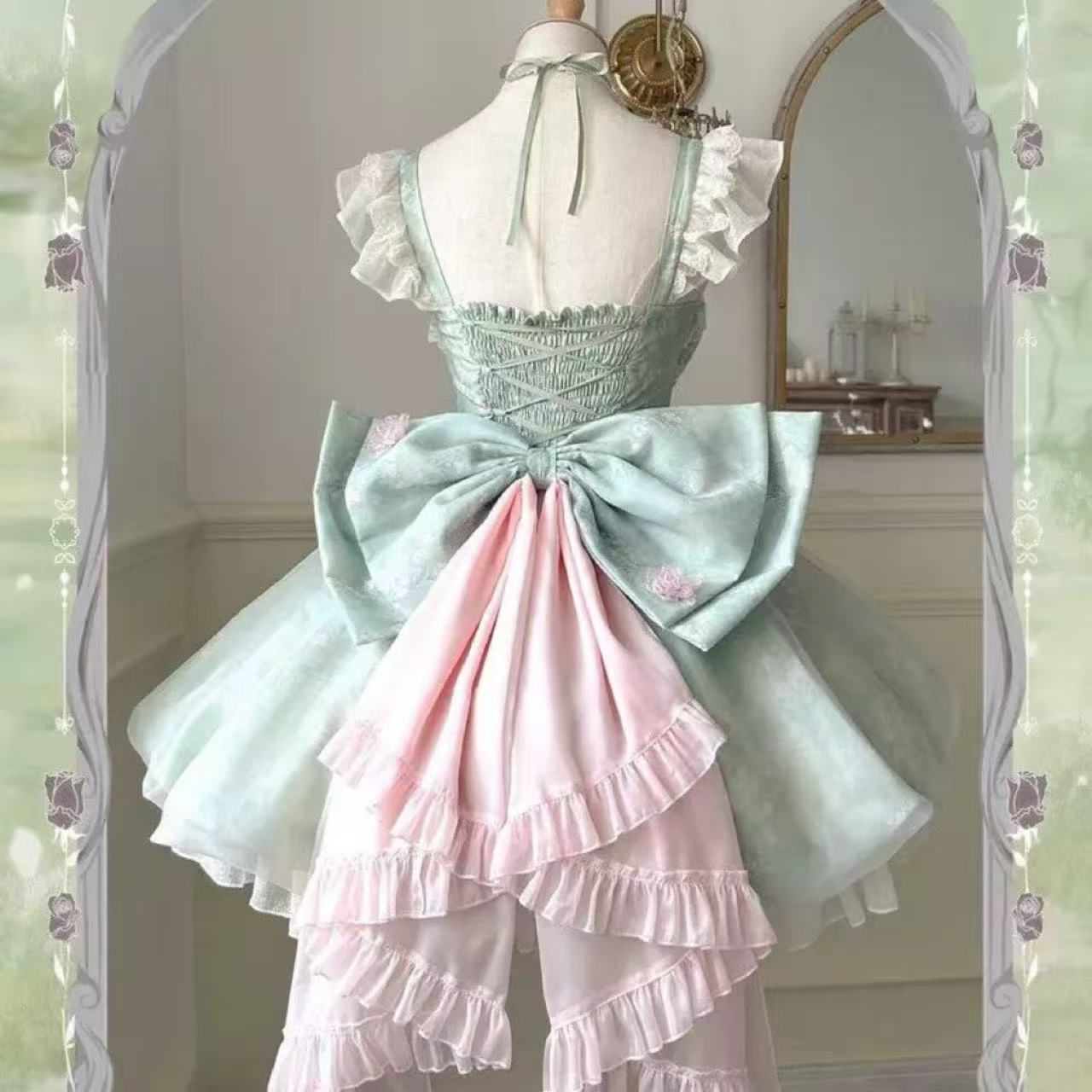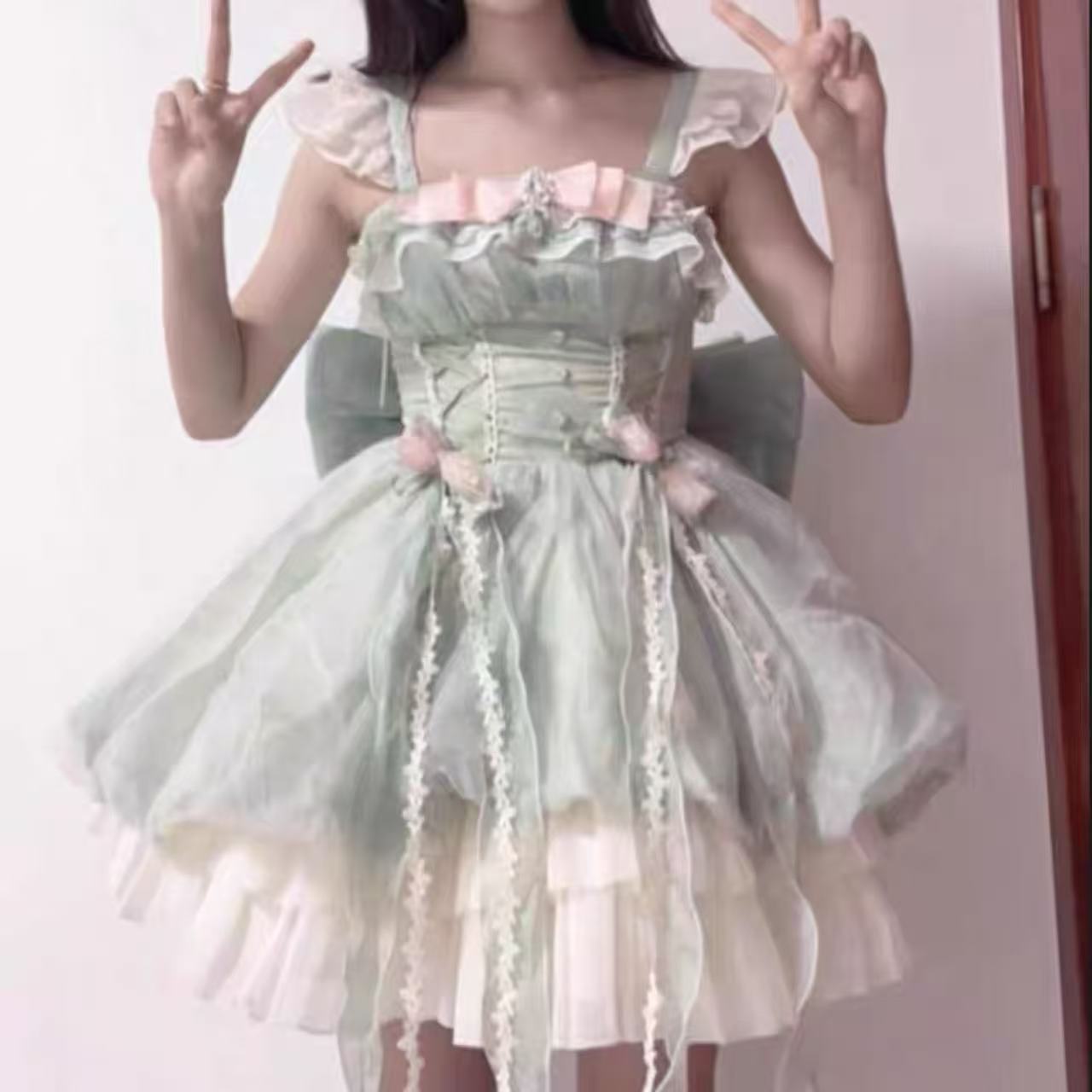 【ロリータ】小さなリボンが可愛い本格バレエスタイルのサスペンダースカートドレス。ふんわり広がるプリンセススカートが華やかさを演出し、夏の装いにもぴったりな甘く可愛い一着です。