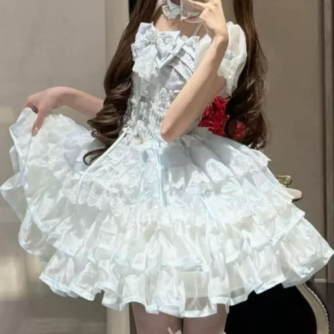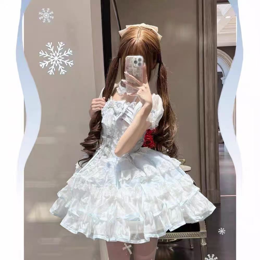 氷と雪をイメージした夏向け半袖ロリータドレス。バレエチュチュ風のふんわりスカートが優雅な印象を演出し、誕生日やデートなど特別な日にもぴったり。軽やかな素材で動きやすく、涼しげなデザインが夏の装いに最適です。清楚で可愛らしいお嬢様スタイルを楽しめる一着です。
