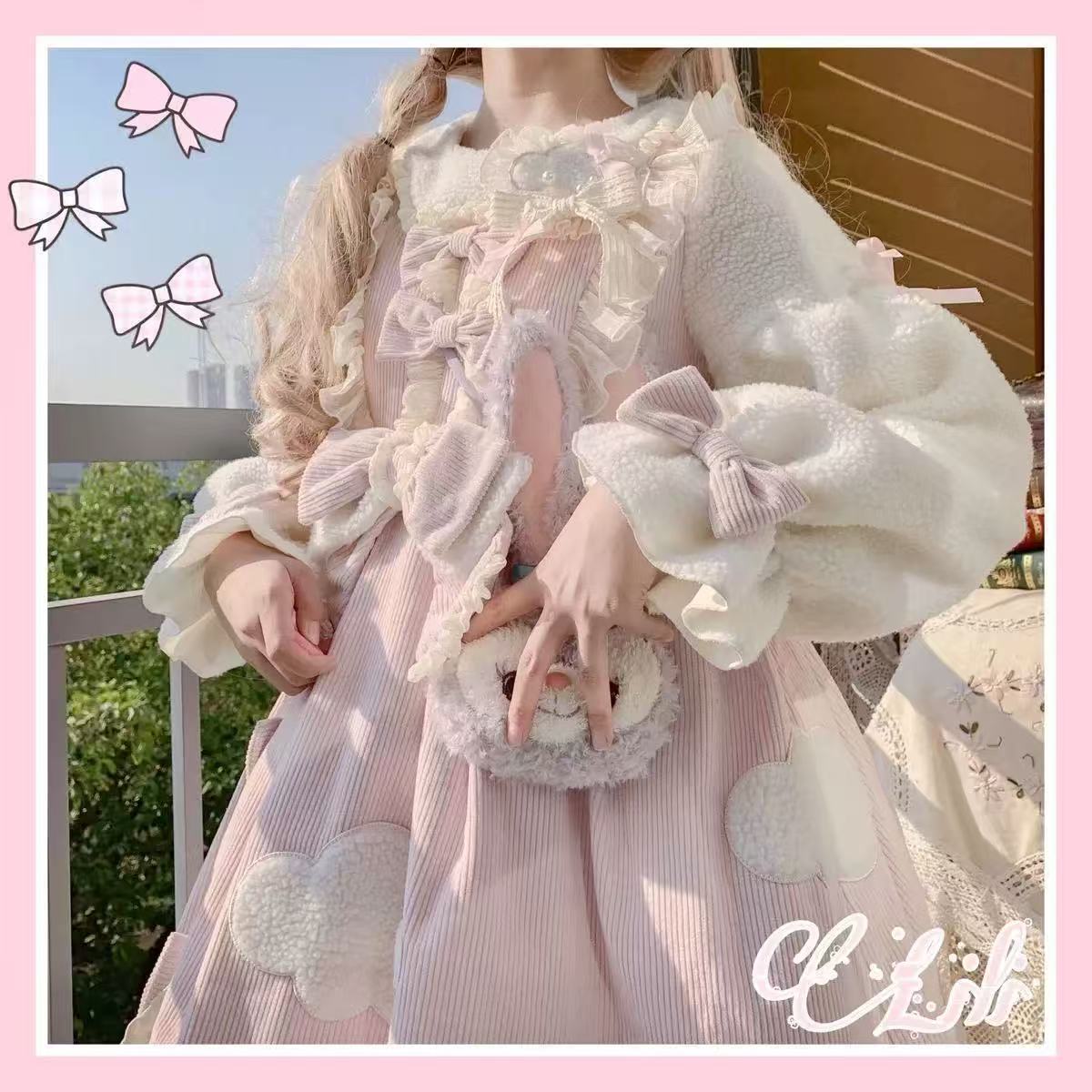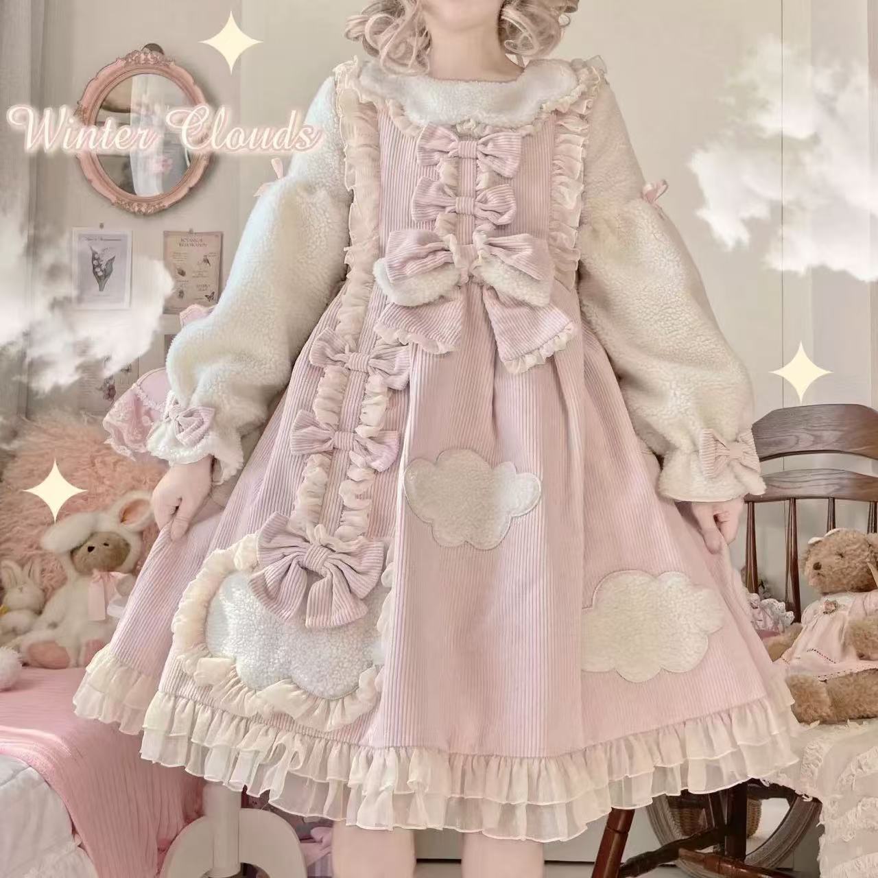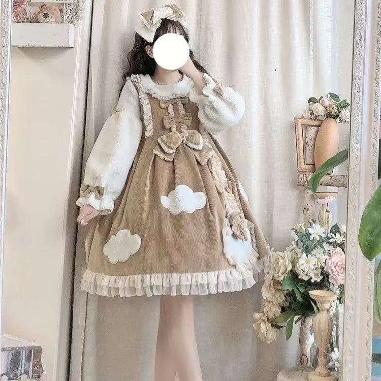 【ロリータ】冬の雲晴れロリータ超厚手OPドレス。ふんわり温かい素材で、秋冬にぴったりの長袖デザイン。学生にも嬉しい大きいサイズ展開で、寒い季節でも可愛さをキープ。優しいカラーとクラシカルなシルエットが魅力のロリータワンピースです。