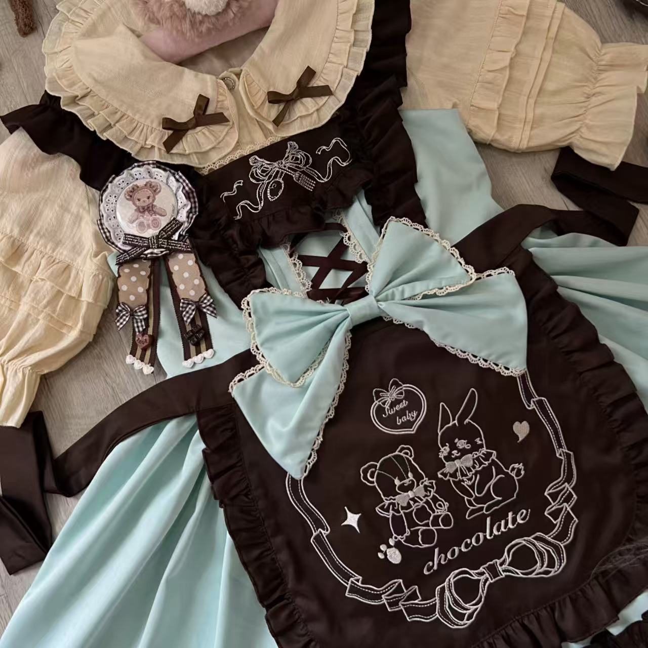 オリジナルデザイン【ホワイトシュガーガール】のロリータJSKサスペンダードレス(夏用)。軽やかで涼しげな素材を使用し、甘く可愛いサスペンダースタイルが魅力。夏のお出かけやイベントにもぴったりの一着です。