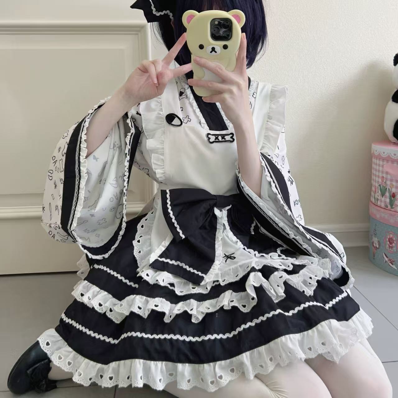 和の要素を取り入れた甘くて可愛い和風ロリータドレスです。メイド風のデザインで、上品さとガーリーさを兼ね備えています。繊細なレースやリボンがポイントで、特別な日のおしゃれにもぴったりな一着です。【ロリータ】