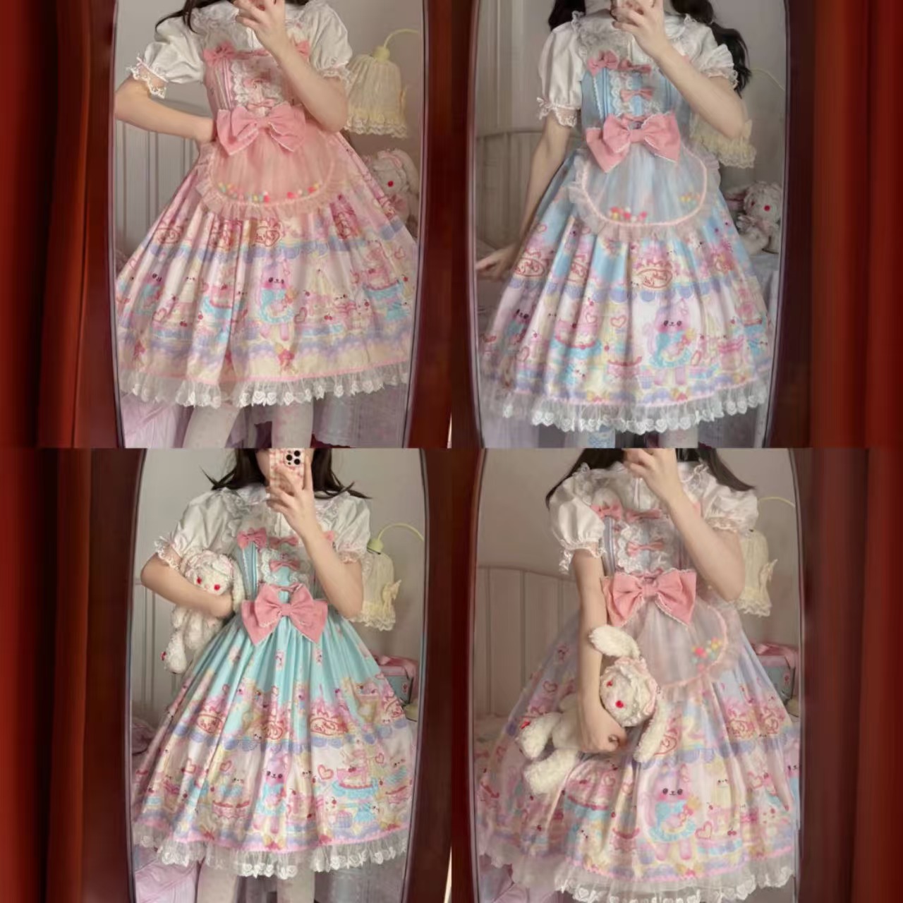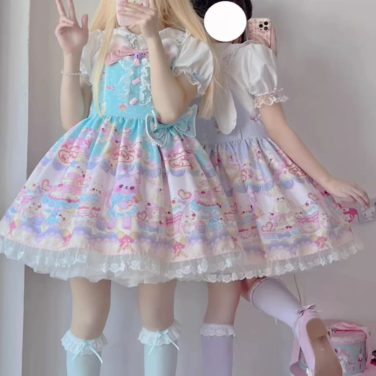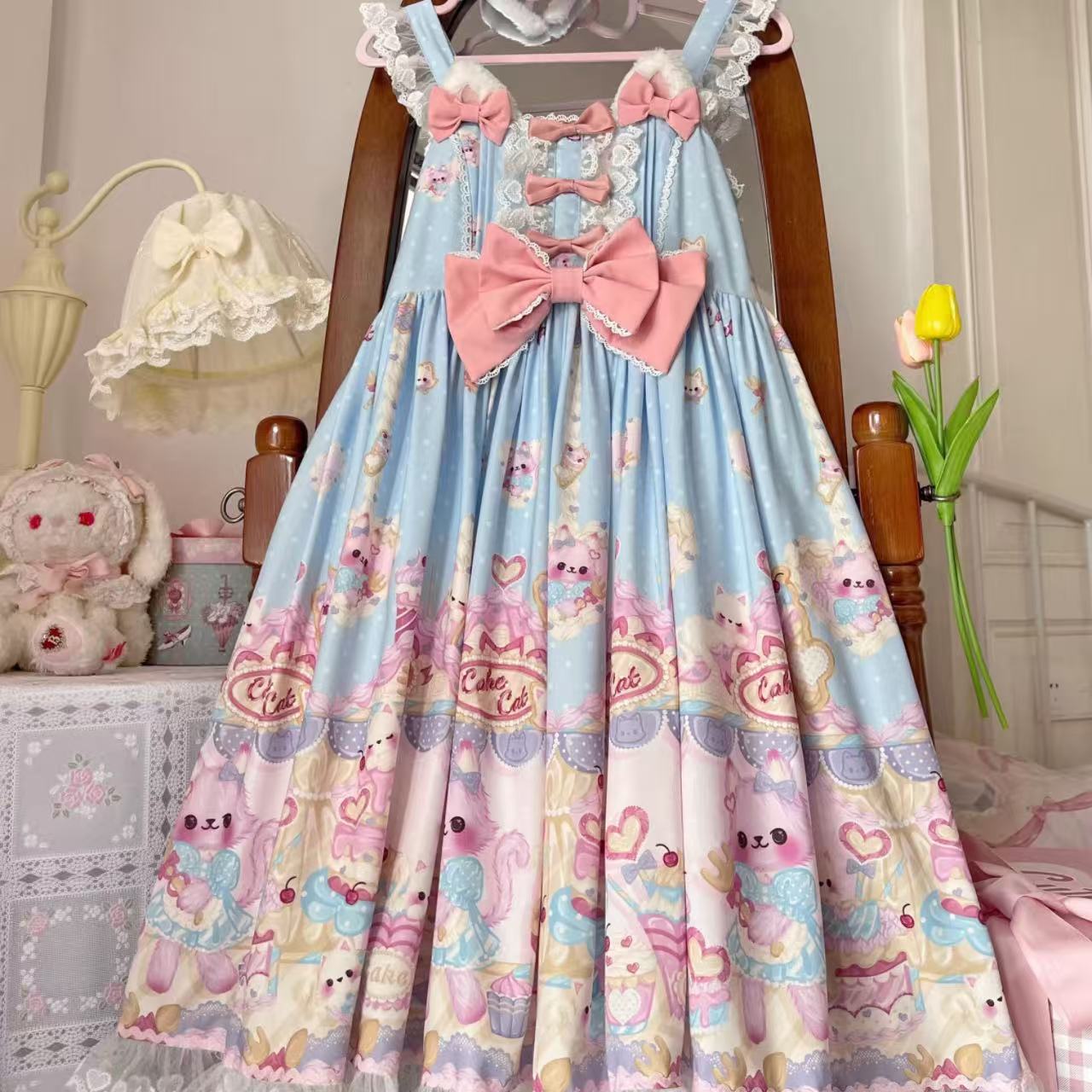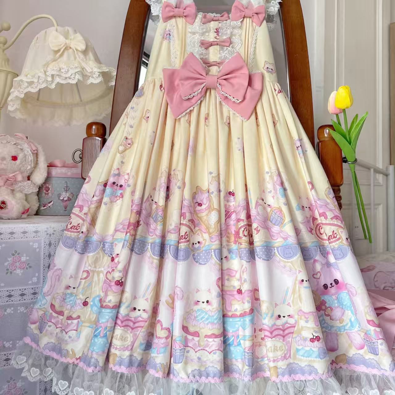 【ロリータ】ホワイトシュガーガールのオリジナルデザイン「猫パティシエ」シリーズのサスペンダースカート。スイートな猫モチーフと繊細なレースが魅力で、ふんわりと広がるシルエットがロリータらしい華やかさを演出します。可愛さと上品さを兼ね備えた人気アイテムです。