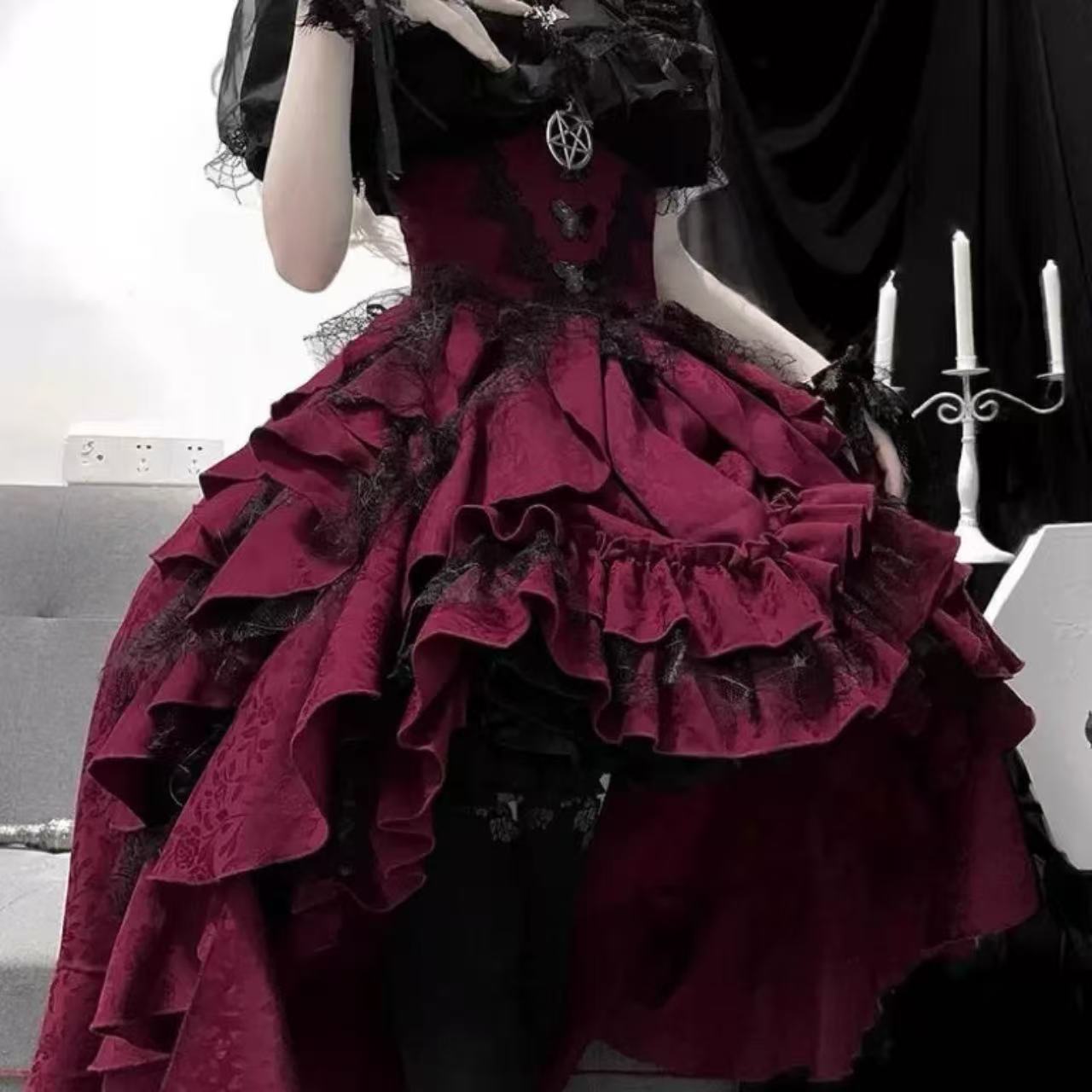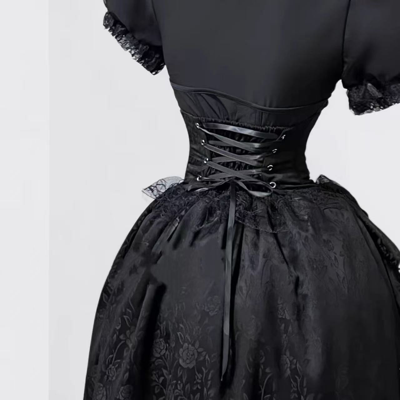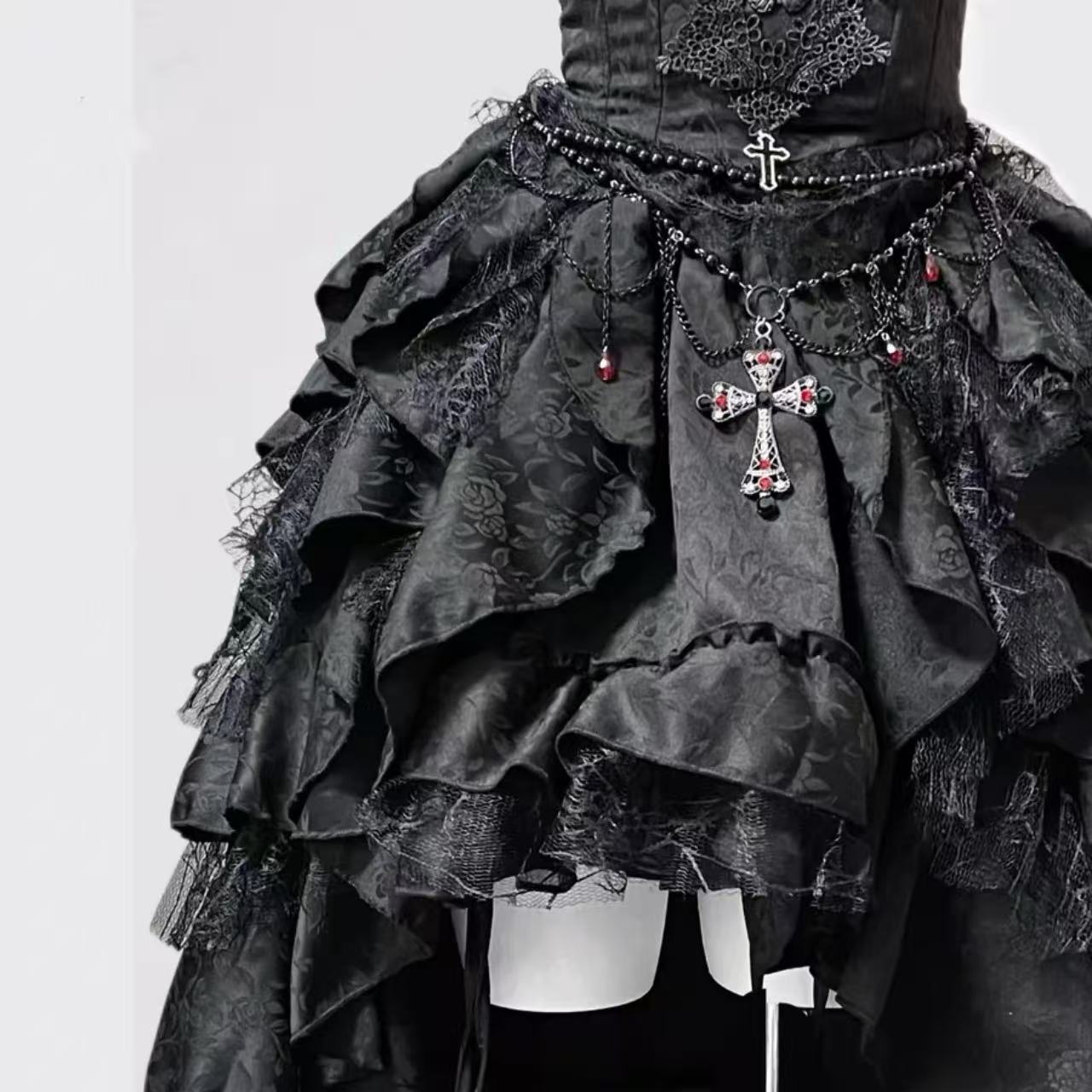 ナイチンゲール風のダークゴシックロリータスカート。高級感のあるジャカード生地を使用し、レースや装飾がエレガントな印象を与えます。ウエストを美しく引き締めるスリムなシルエットで、上品さと妖しさを兼ね備えたデザイン。ハロウィンやパーティー、撮影衣装にもぴったりの一着です。
