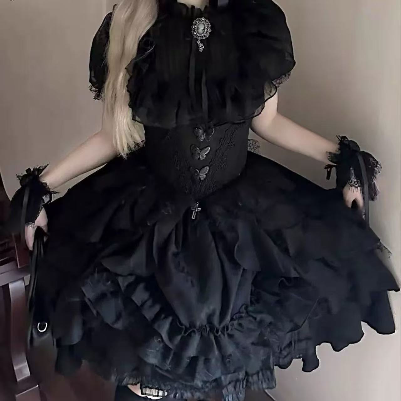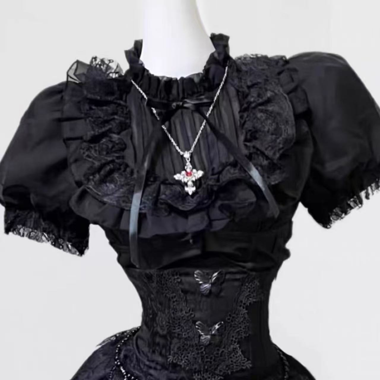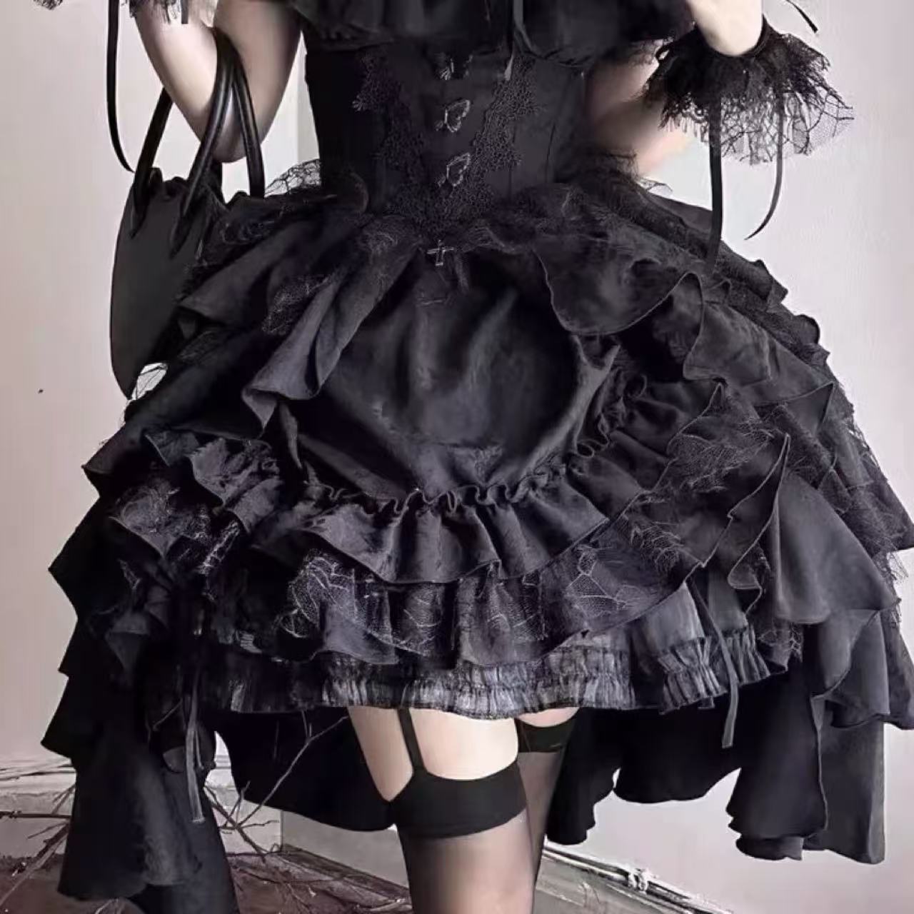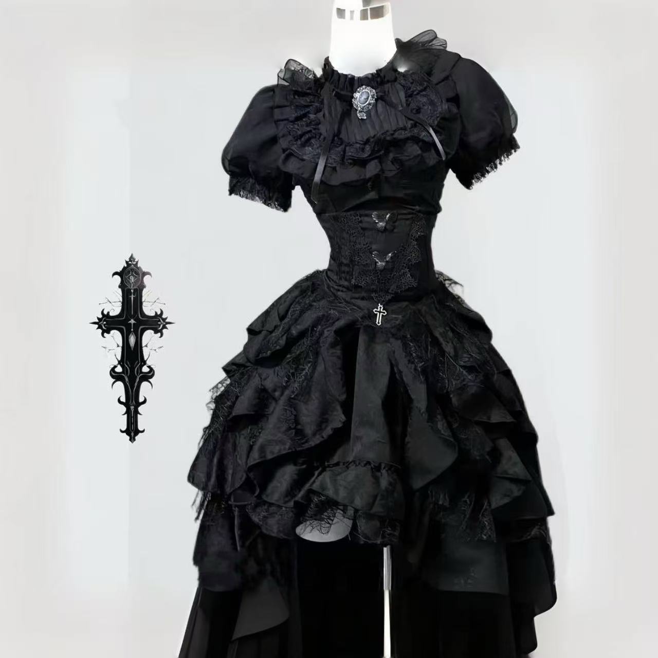 ナイチンゲール風のダークゴシックロリータスカート。高級感のあるジャカード生地を使用し、レースや装飾がエレガントな印象を与えます。ウエストを美しく引き締めるスリムなシルエットで、上品さと妖しさを兼ね備えたデザイン。ハロウィンやパーティー、撮影衣装にもぴったりの一着です。