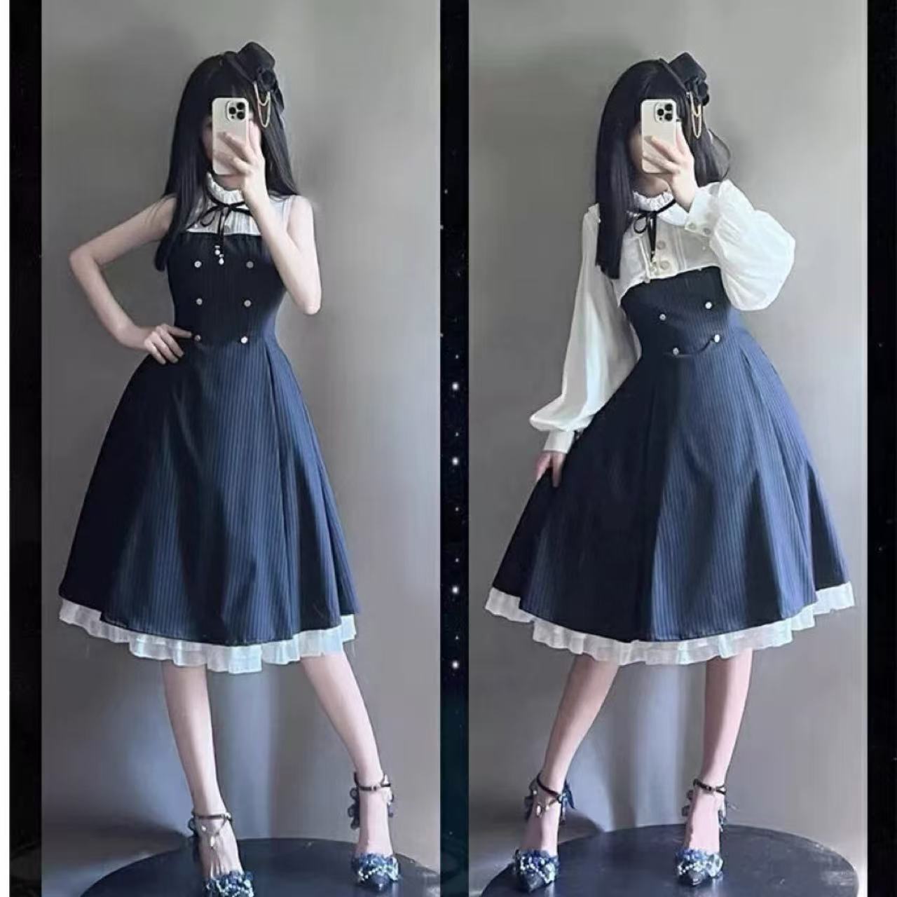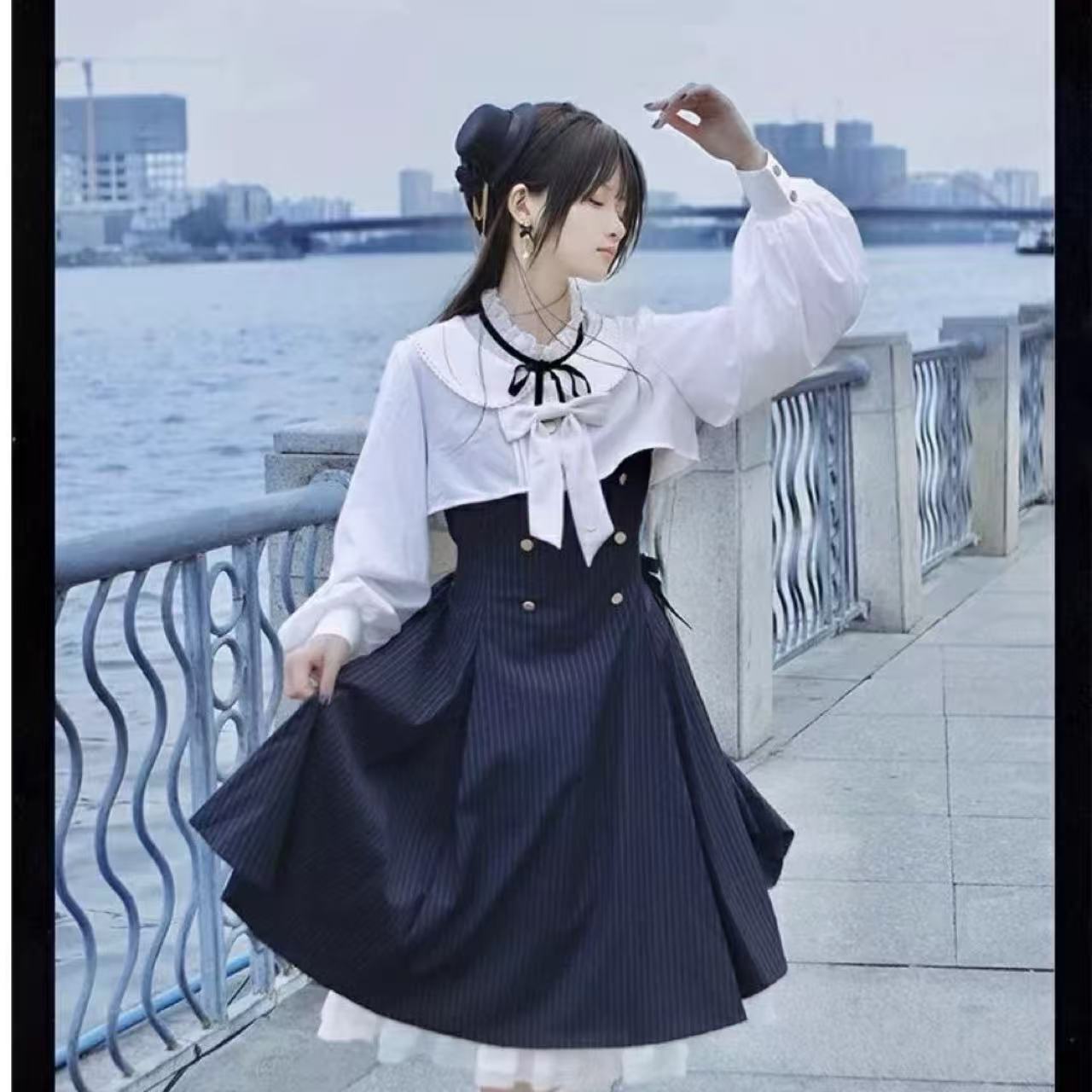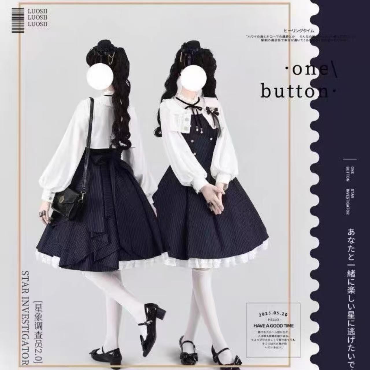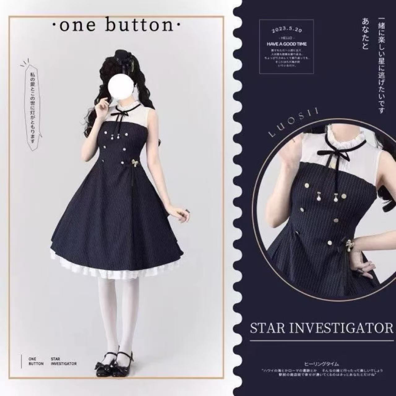【ロリータ】占星術調査官をテーマにした、エレガントでスリムなシルエットの8点セットドレスです。カラーストライプのドレスにショートジャケットを組み合わせ、知的で上品な雰囲気を演出。占星術の神秘さとクラシカルロリータの気品を融合させた特別なデザインです。
