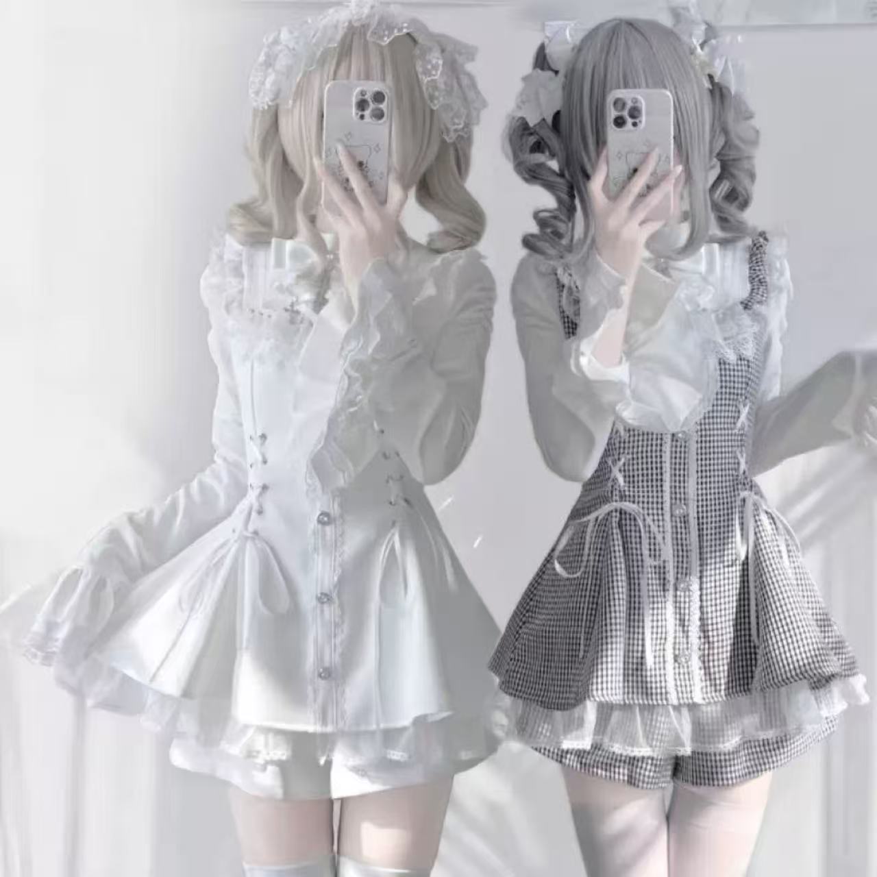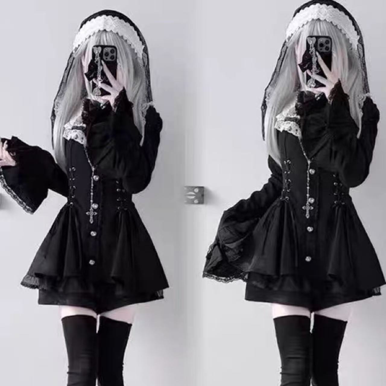 甘ロリータ トランペットスリーブ・黒白ロングドレス