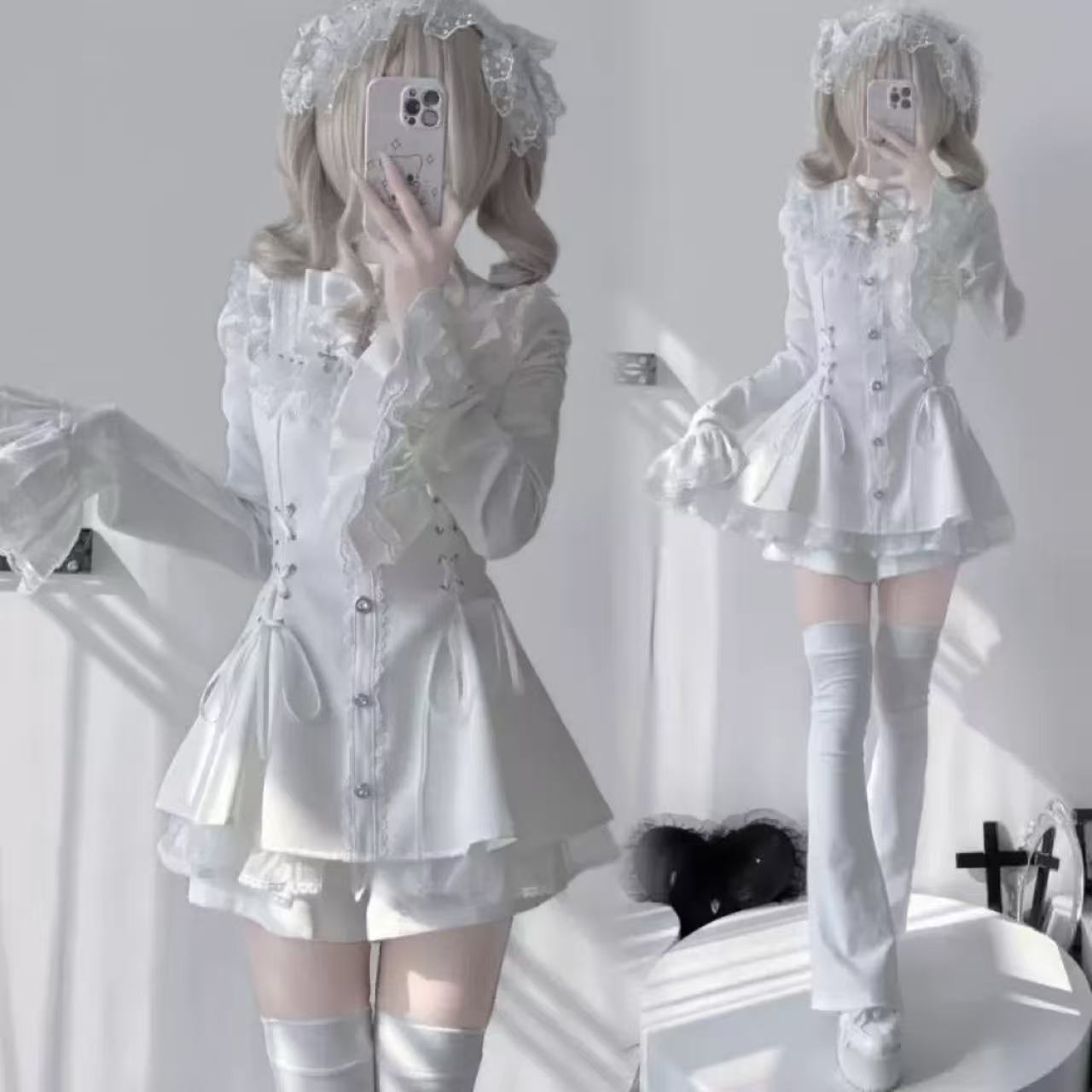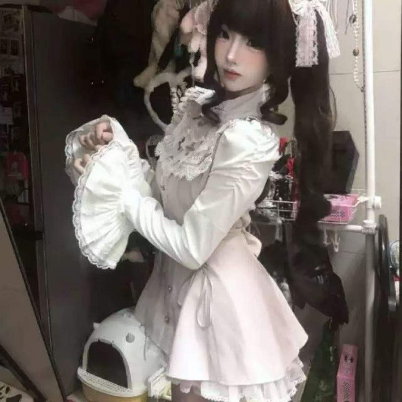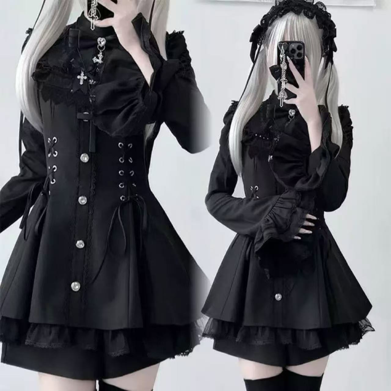 【レイレイガール】出会いの予感を感じさせる、量産型トランペットスリーブの黒白ロングドレス。繊細なレース使いが女性らしさを引き立て、袖から裾にかけて優雅に広がるシルエットが魅力。上品で可憐な雰囲気を演出する、特別な日のための一着です。