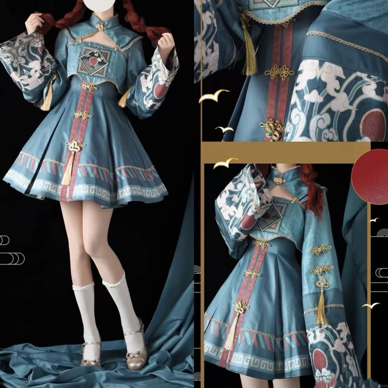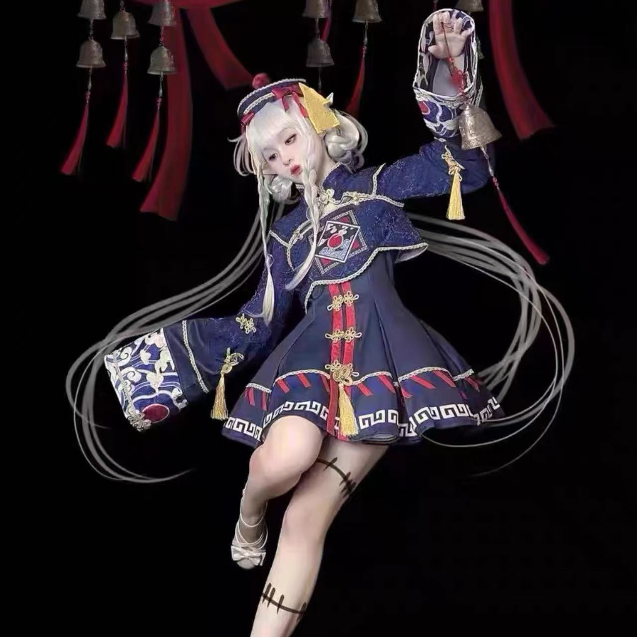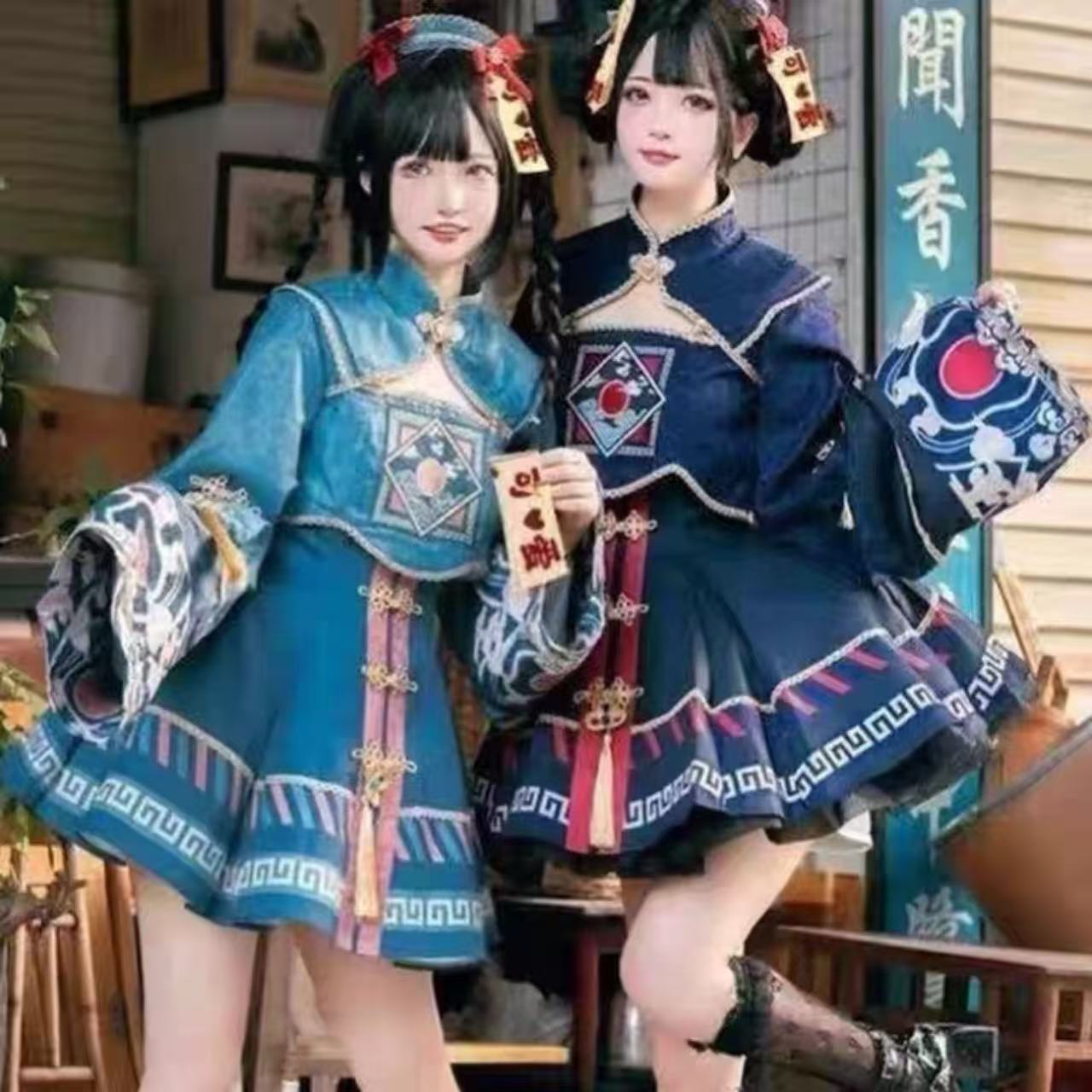 【ロリータ】ゾンビテイストを取り入れたハロウィン向けの中華風ダークロリータセット。トップスとサスペンダードレスの組み合わせで、ホラー感とガーリーさが絶妙にマッチ。独特なデザインが存在感を放ち、イベントや撮影にもおすすめの一着です。