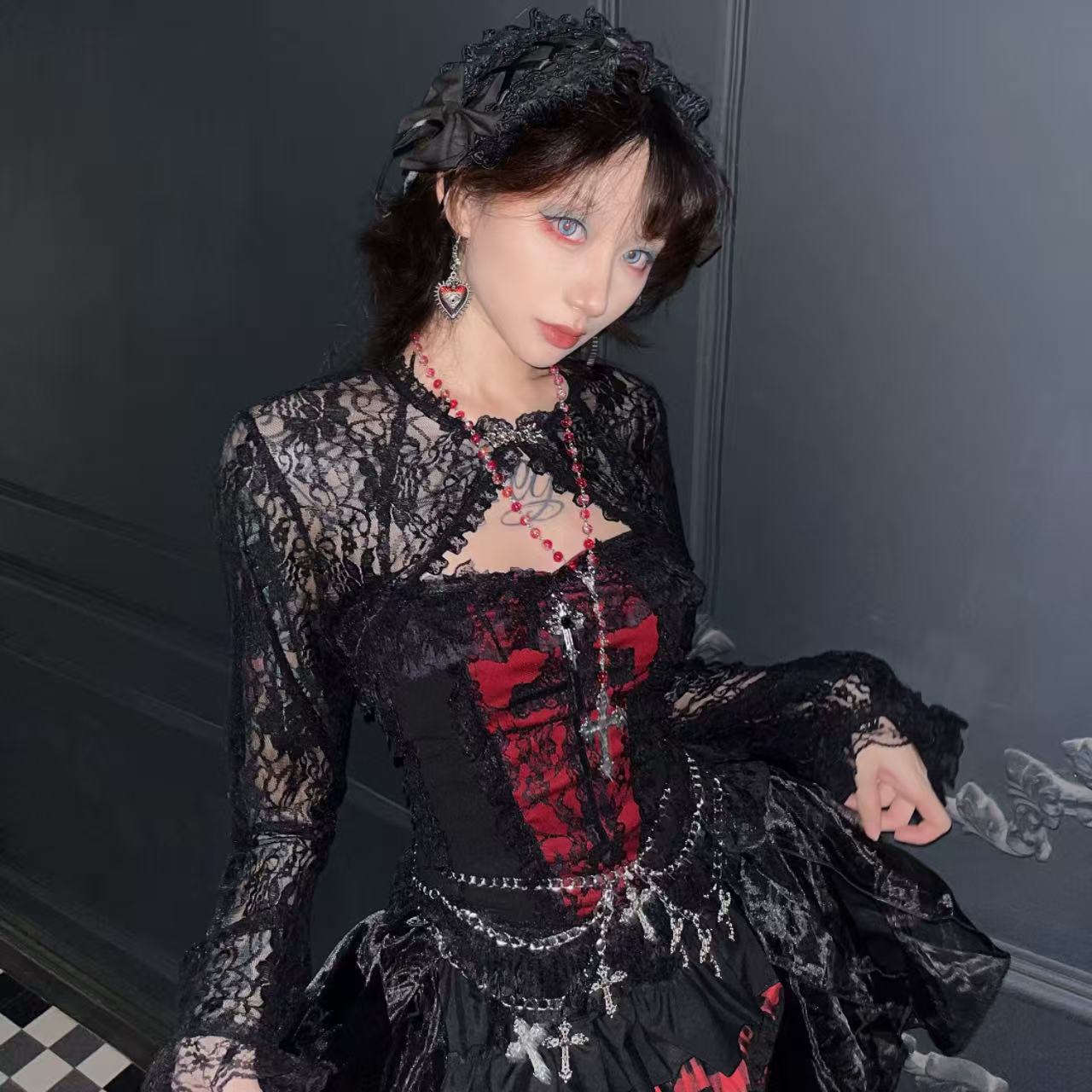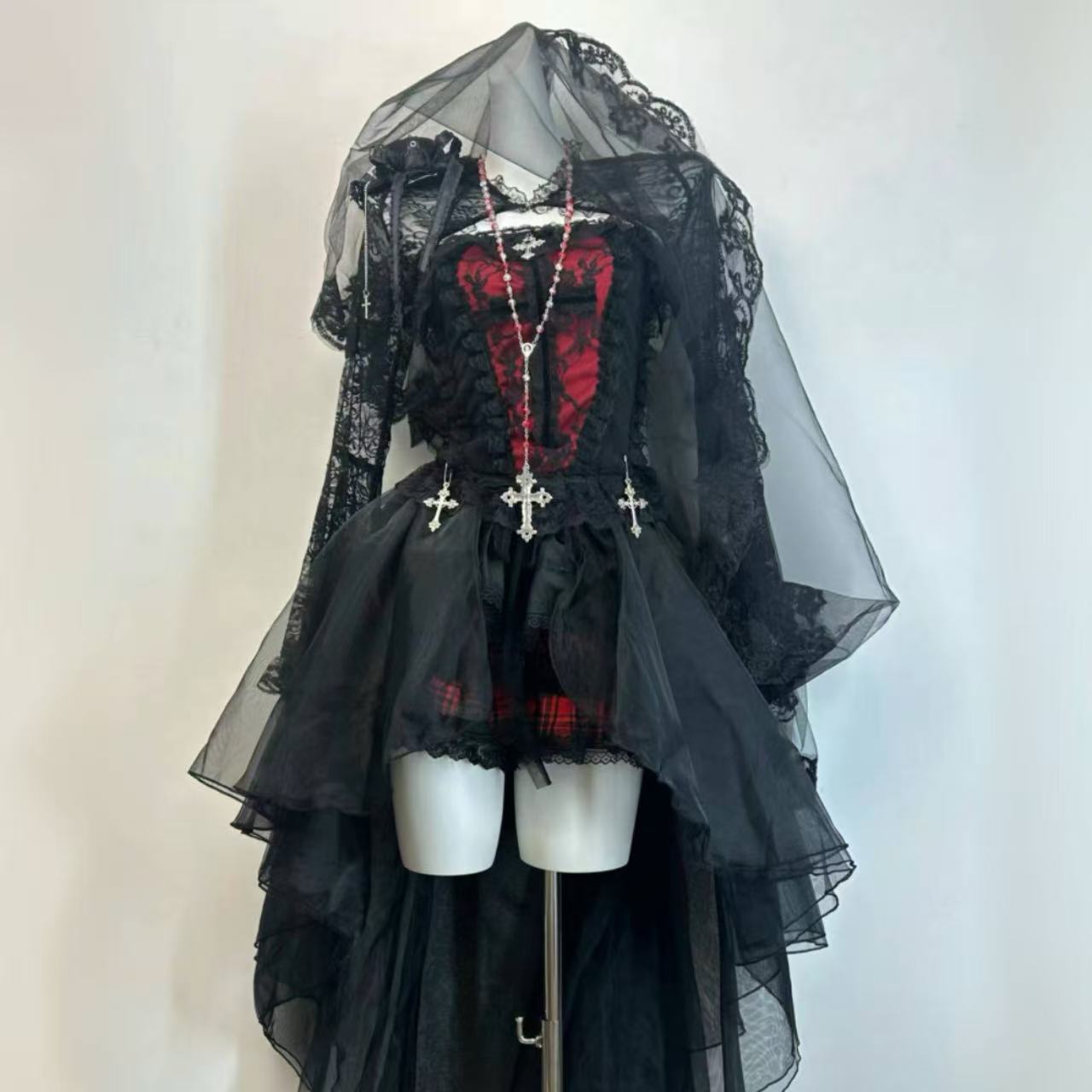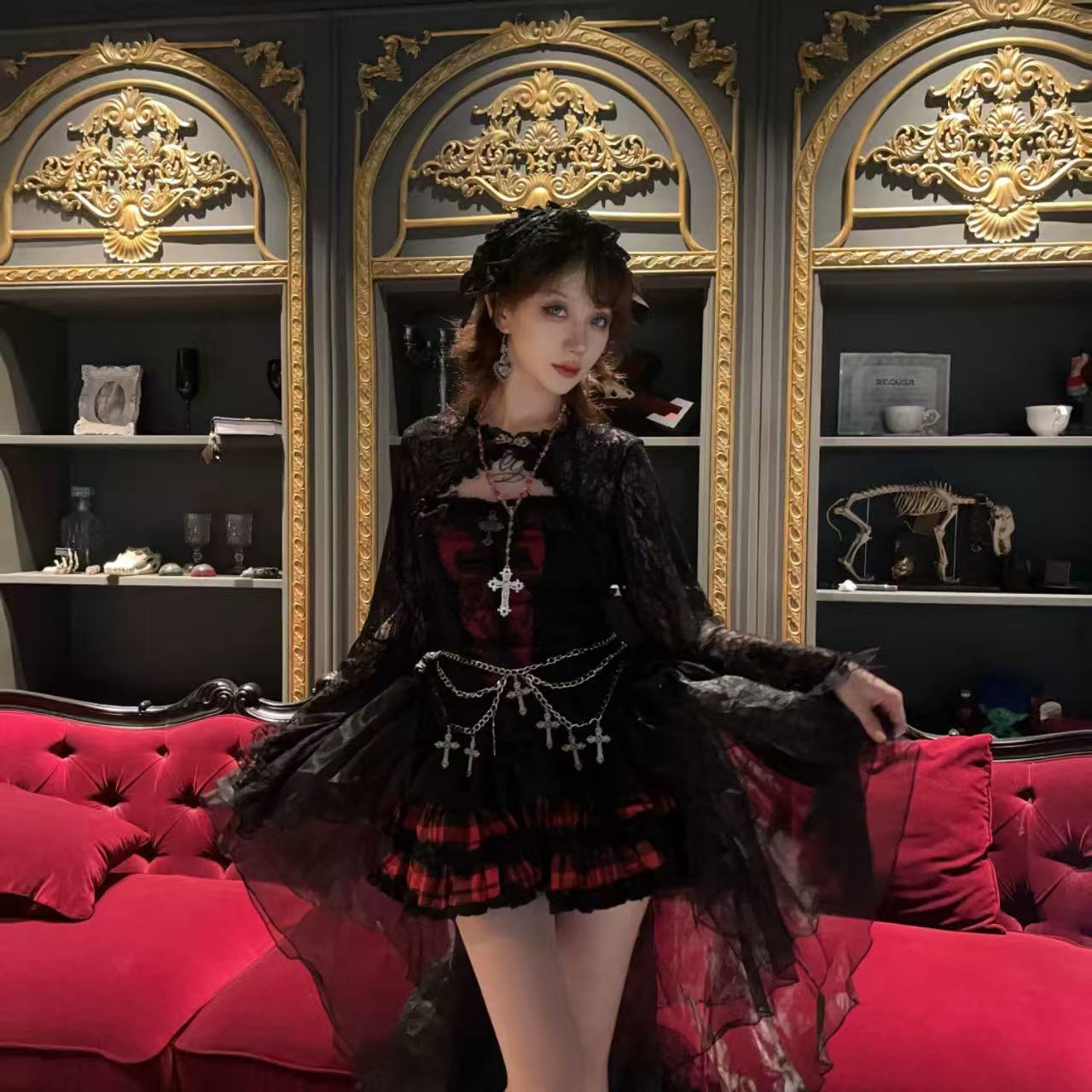 ハロウィンの夜に映える!【ダークスタイル】のローズレーストップ&ウエストチェーンスカートのフルセット。繊細なローズレースがミステリアスな雰囲気を演出し、ウエストチェーンがクールさをプラス。特別感あふれるデザインで、イベントや撮影にも最適です。大人可愛くドレスアップしたい方におすすめのアイテムです。