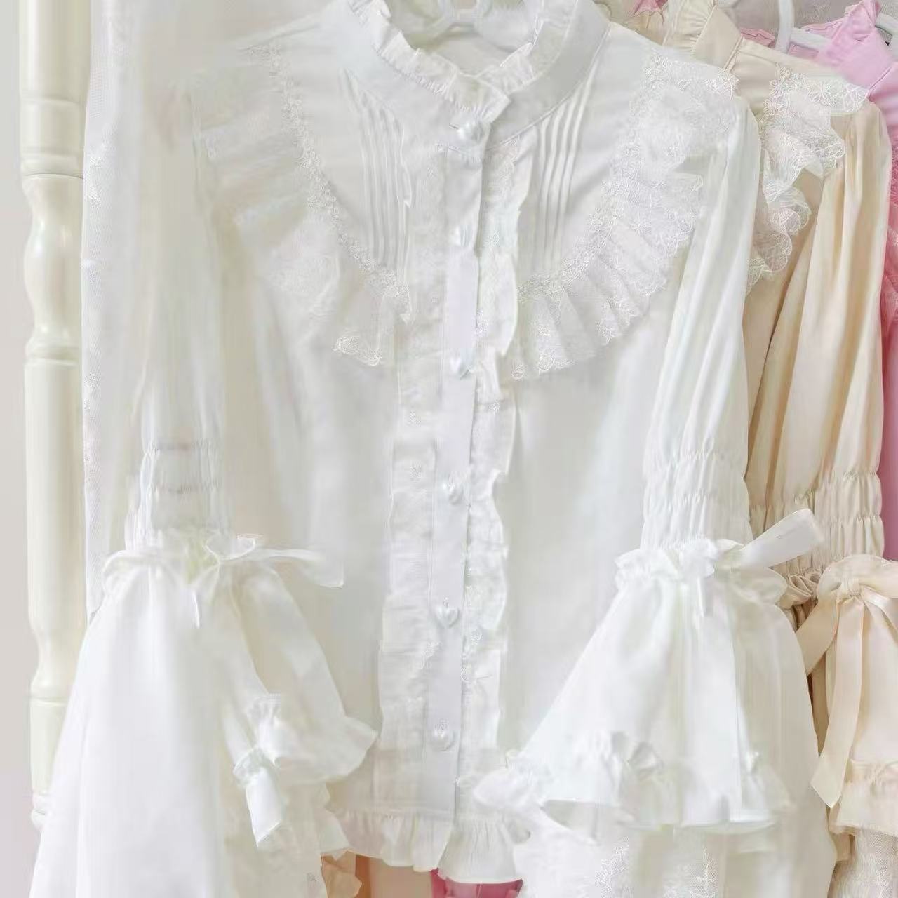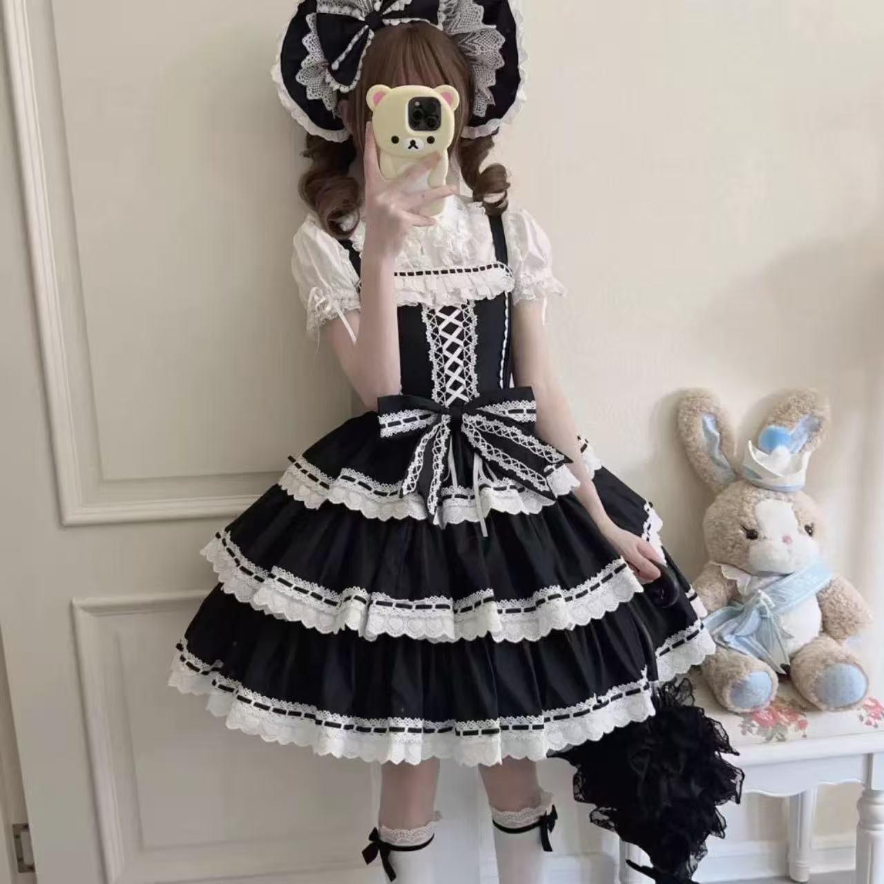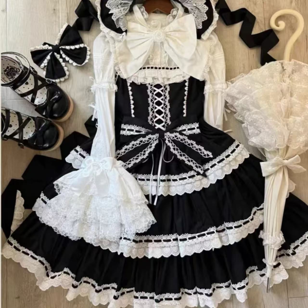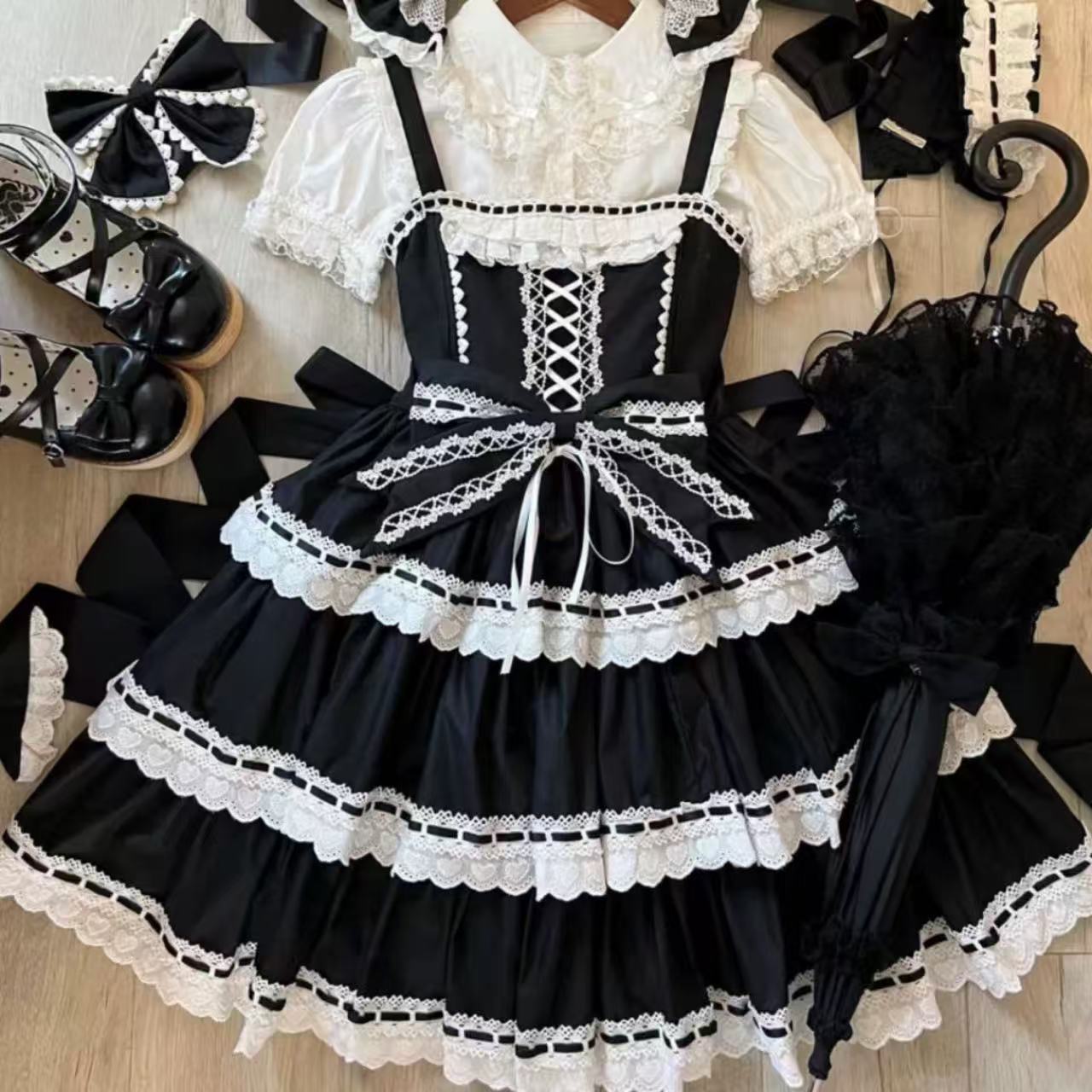 【ロリータ】甘くて可愛いハートモチーフのドール風サスペンダードレスです。3段レースと大きなリボンがあしらわれた華やかなデザインで、乙女心をくすぐるキュートな雰囲気に。ふんわり広がるスカートがドールのようなシルエットを演出します。甘ロリータコーデにぴったりのセットアップです。