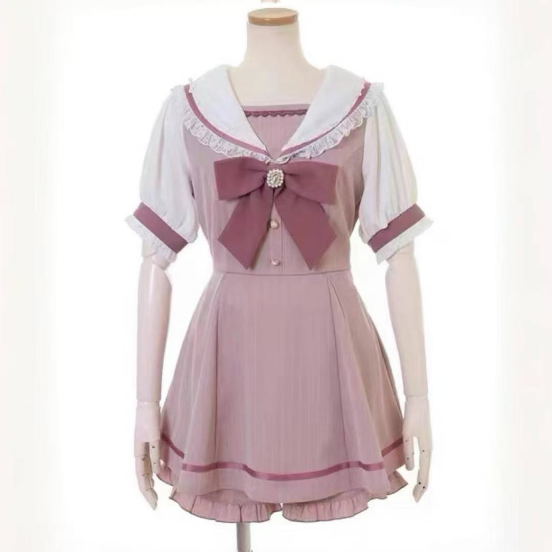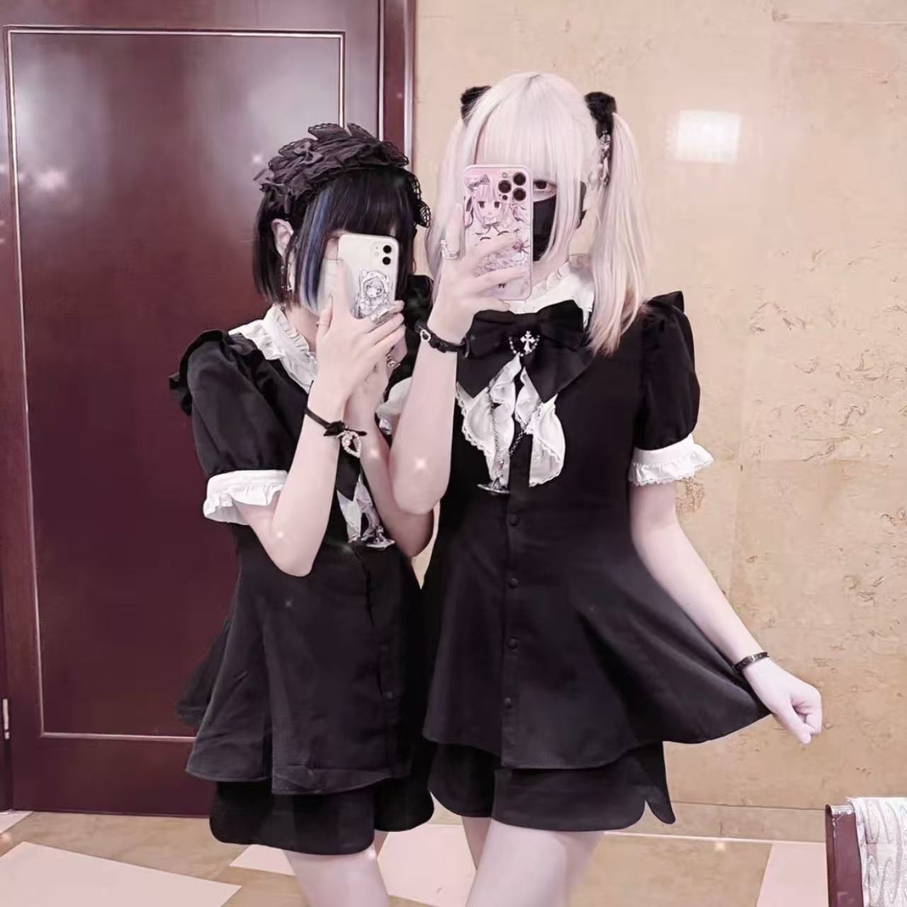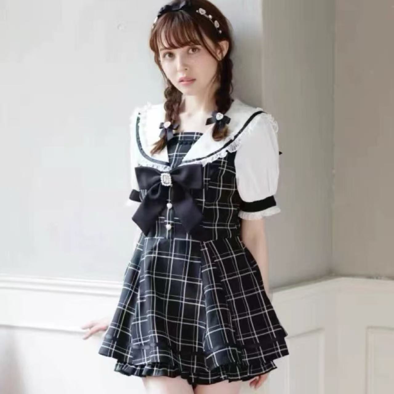 セーラーカラー レース チェック柄 リボン トップス&ショートパンツ セットアップ 【セーラーカラー】