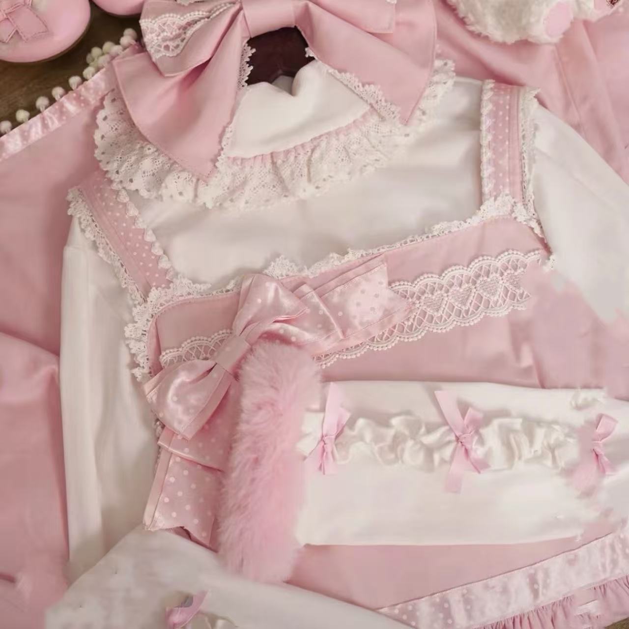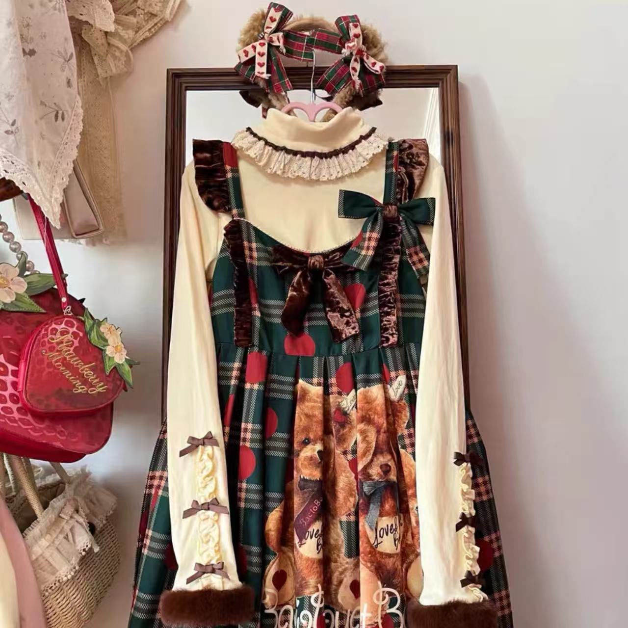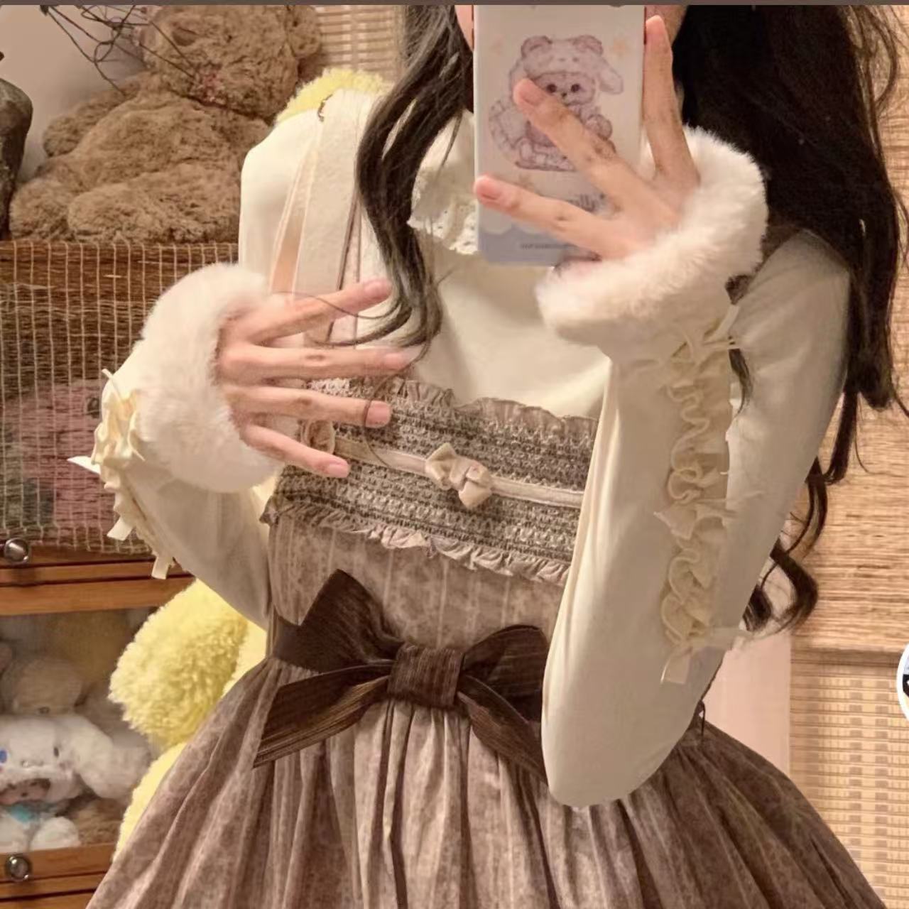 クリーム色が優しい印象を与える、スウィートリボンデザインの長袖ロリータセーター。胸元の大きなリボンと繊細なフリルがガーリーさを引き立てます。柔らかなニット素材で着心地も抜群。秋冬のコーディネートにぴったりな、可愛らしさと上品さを兼ね備えた一枚です。