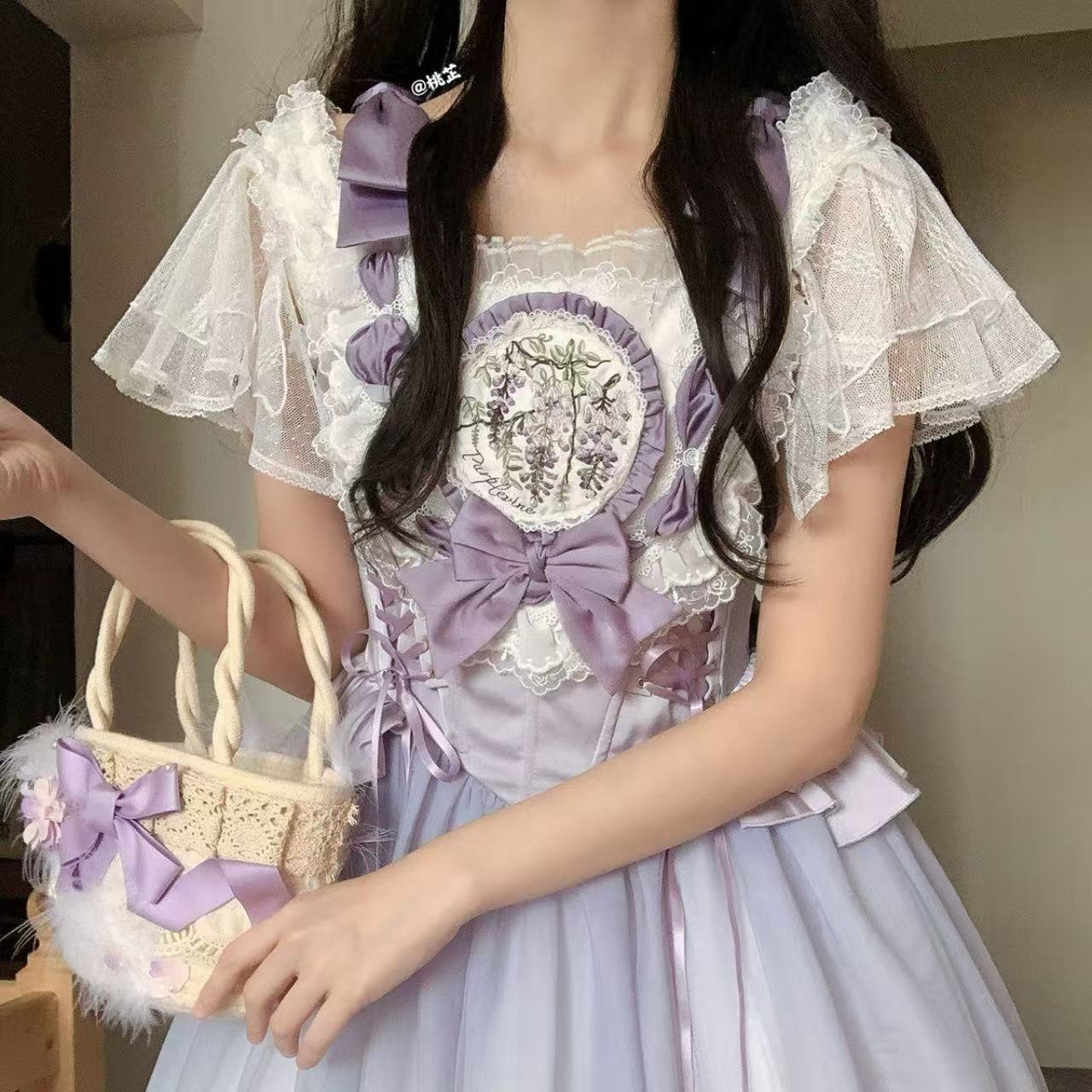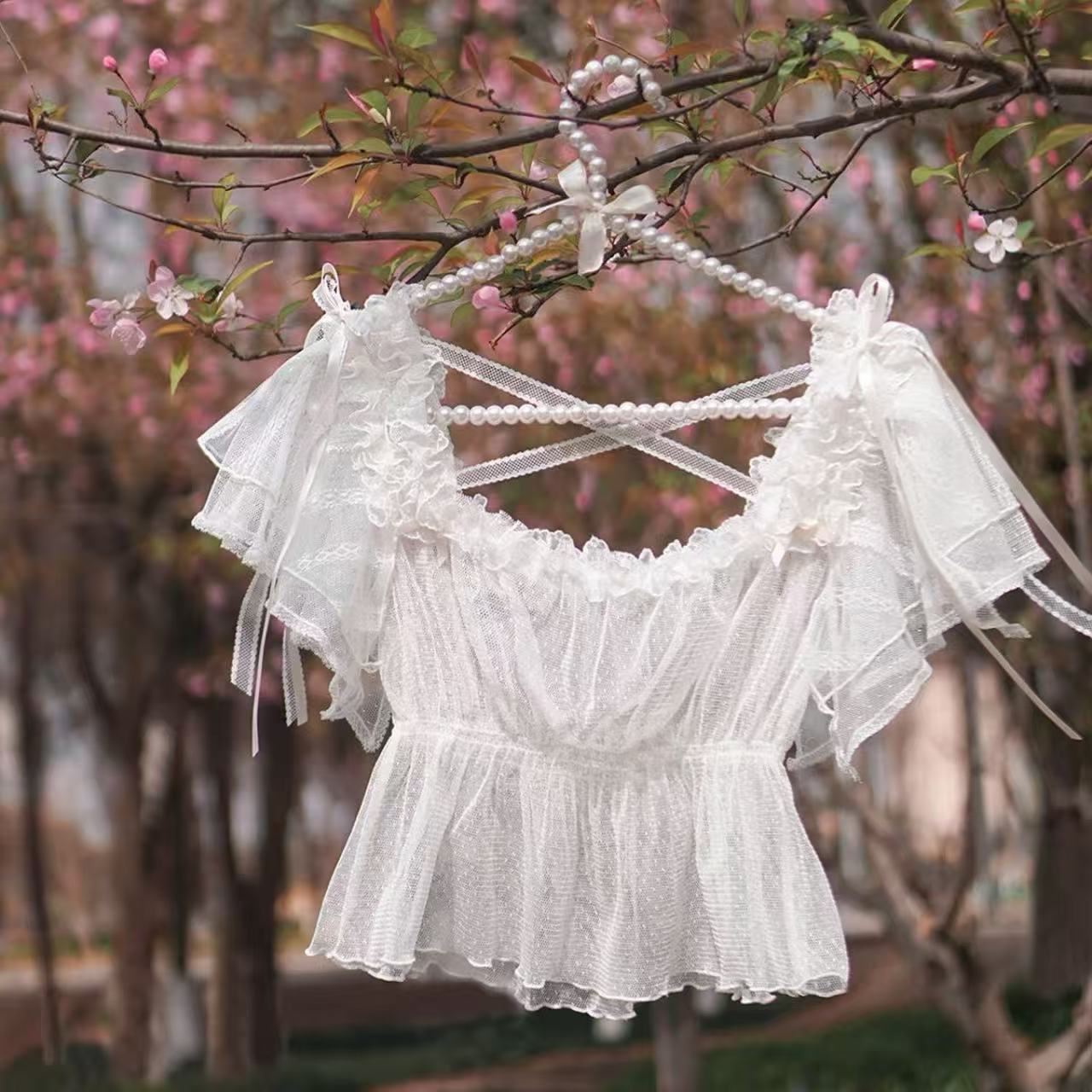 【ロリータ】シースルーレースが美しい、フレンチバレエ風のエレガントなトップスです。軽やかなフライングスリーブが可憐さを引き立て、通気性の良いメッシュ素材で快適な着心地。甘ロリータやクラシカルロリータのインナーとしてもおすすめの一着です。